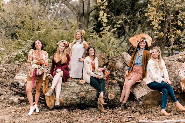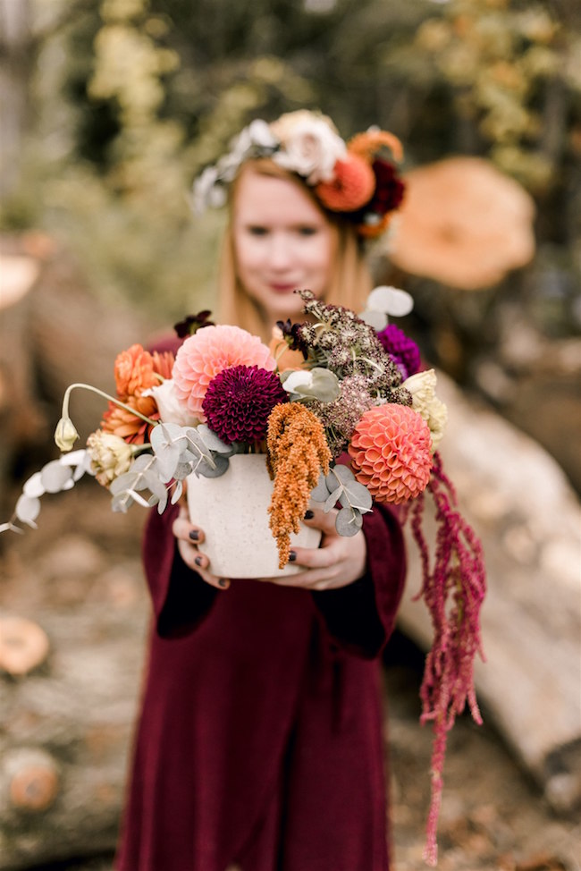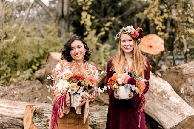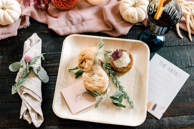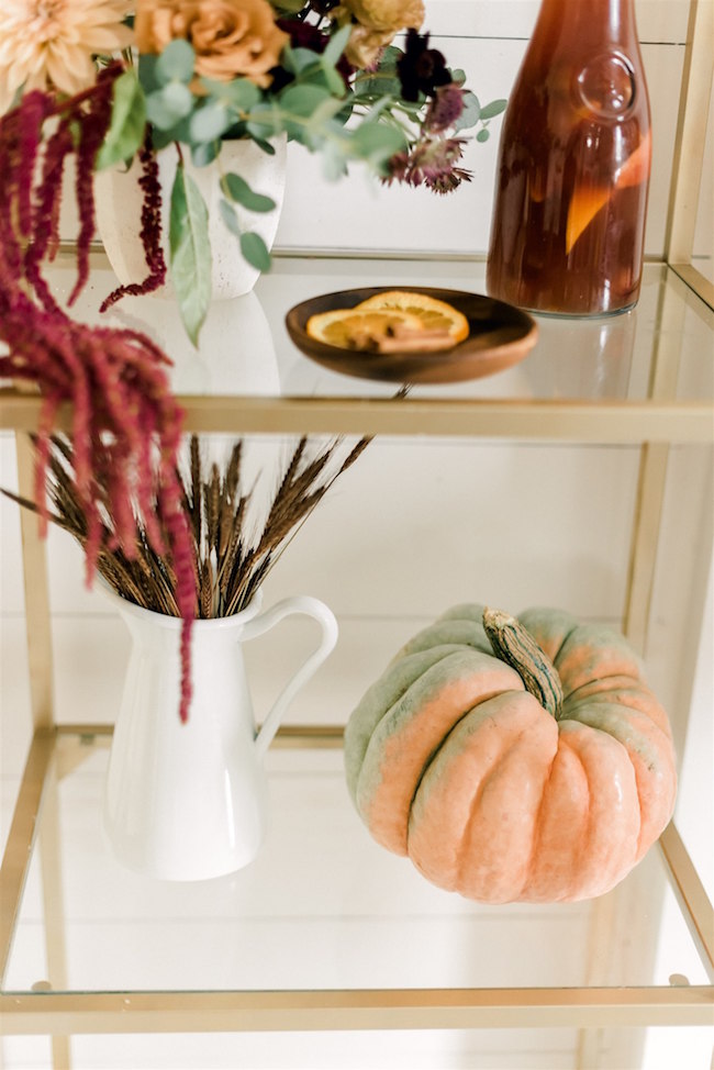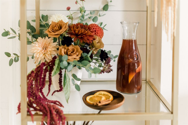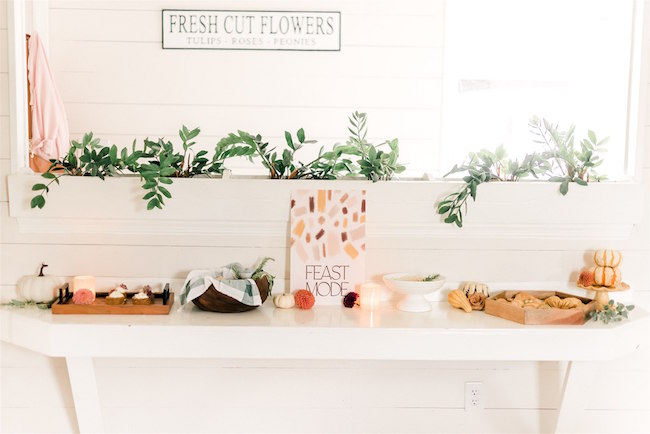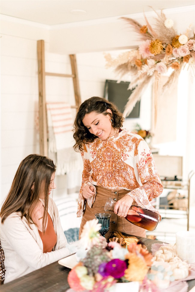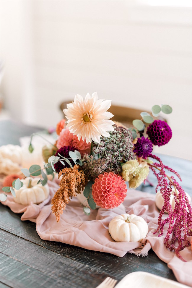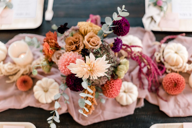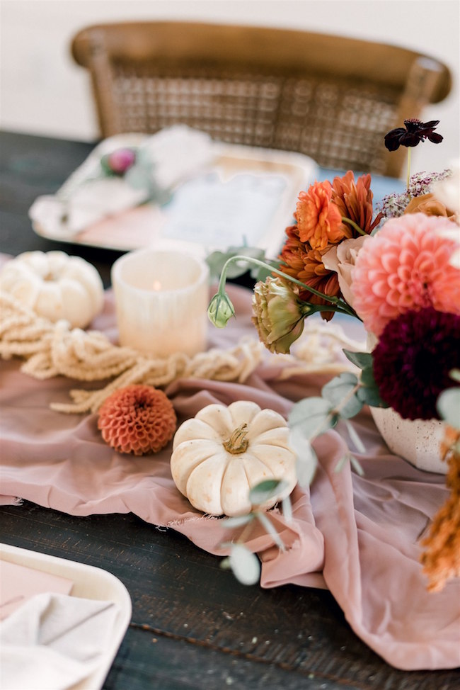 The inspiration was to create a modern friendsgiving with a soft, feminine color palette and details that could be easily re-created in your home. With a potluck style menu, compostable plates and utensils, and an apple cider sangria bar. We wanted a color palette that feels less in your face than traditional bright fall colors, with blush pink tones from quicksand roses, pops of mustard yellow from chrysanthemums and burgundy amaranthus.