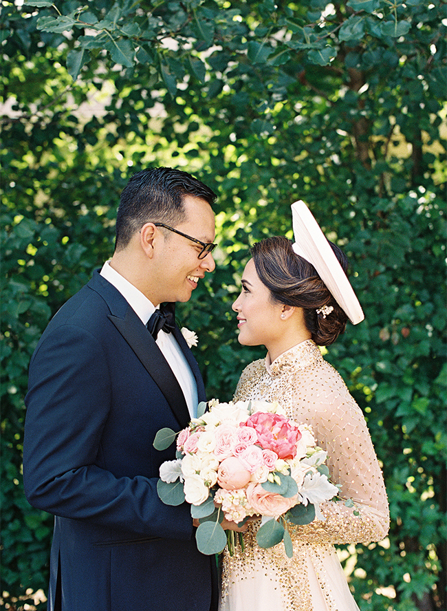 If we had to describe our dream wedding in just a few words it would be: warm, romantic, and industrial chic. We envisioned soft lights and soft colors that would create an intimate environment for our guests. When we saw Puritan Mill, it was the perfect backdrop for us. We loved the high ceiling with exposed wood, brick walls, and steel pillars. The space was large and a blank canvas. We immediately knew we wanted to string cafe lights across the room to create that intimacy, picked blush pink and navy to compliment the warm wood and brick colors, and keep centerpieces simple to not draw attention away from the space itself. Dennis and I grew up here in America but our culture’s traditions remain important to us so we wanted to incorporate as much of it into our wedding day as possible. Having the traditional tea ceremony in the morning made the day extra long but it was so worth it to be able to pay respects to our parents, and family members and be able to wear the Vietnamese ‘Ao Dai’.