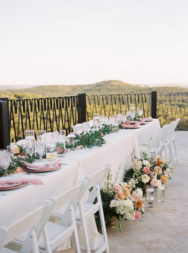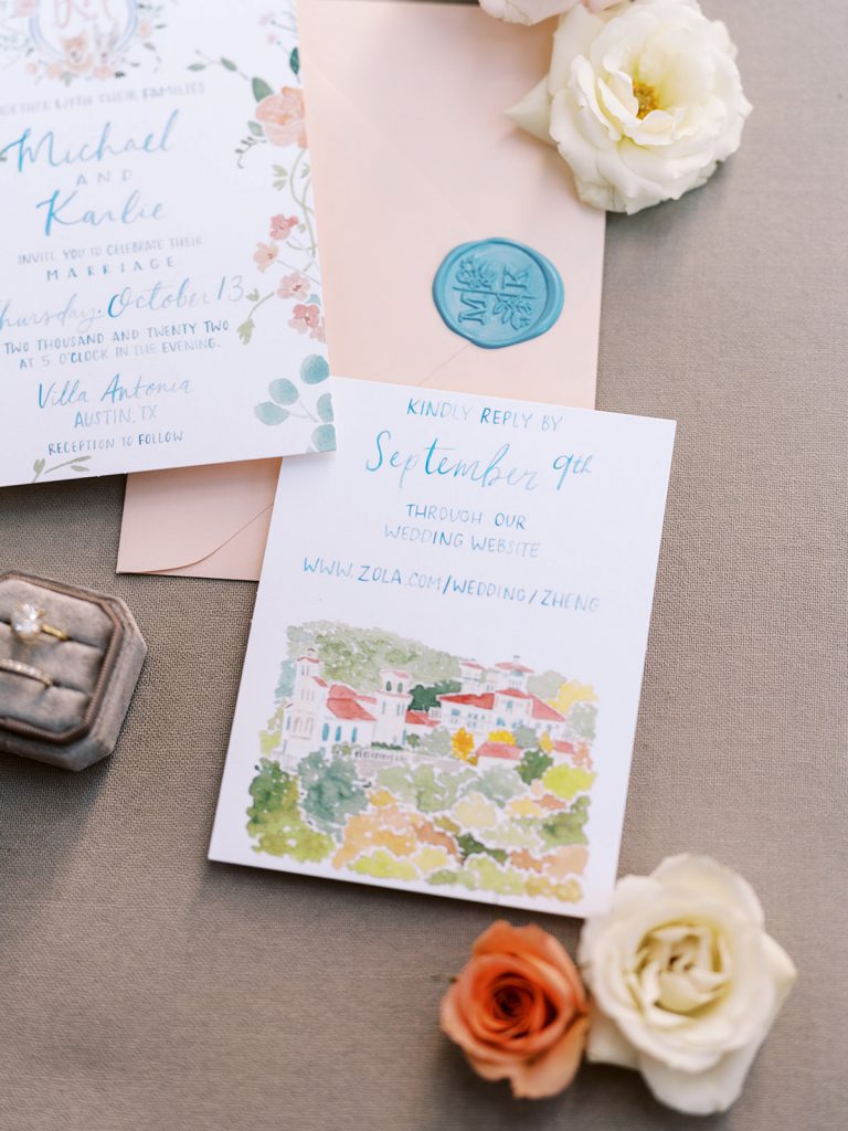 “Hand painted invitations by Borrowed and Blue Paper incorporated illustrations of their beautiful venue. I loved that Karlie and Michael decided to have their first dance and dinner outdoors, so that you could enjoy the views. The couple wanted to wow their guests with this unique location in Texas, and they definitely did!