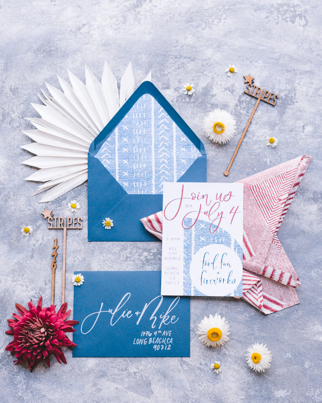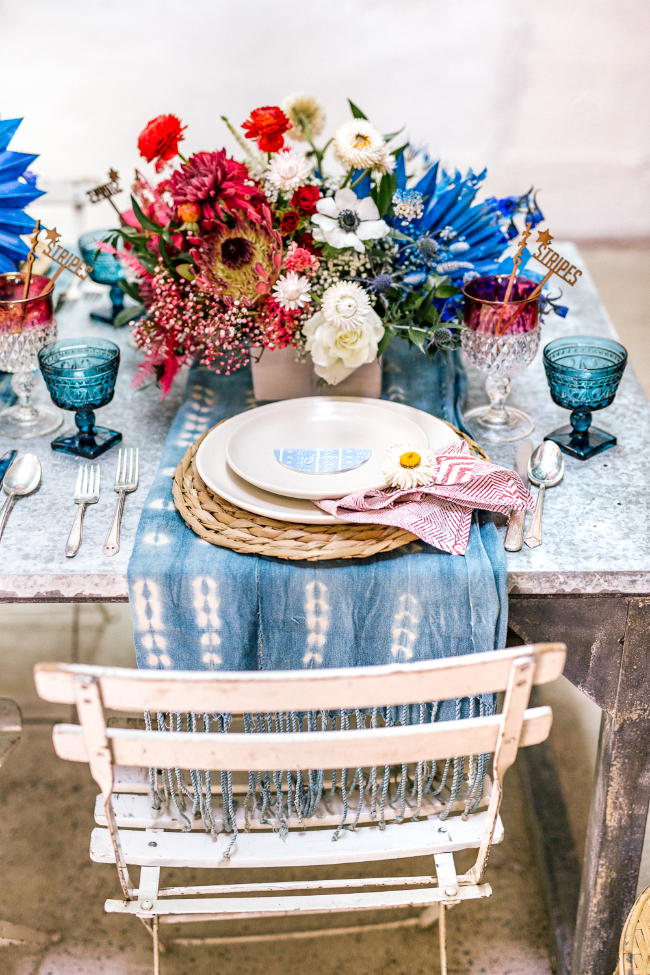 4th of July is one of our favorite holidays, from the fireworks to sharing laughter with family! So when designing this patriotic 4th of July fete, we wanted to stick with the customary color scheme of red, white and blue. But add a boho flare to the design! When pulling together the design, I spotted the most perfect mud-cloth throws in Sweet Salvage Rentals and knew that was the perfect way to mix traditional and boho for the setup! Those throws became the perfect runners for the tabletop. Then carried the mud-cloth print into the invitation suite, place cards, drink menu and stir-sticks!