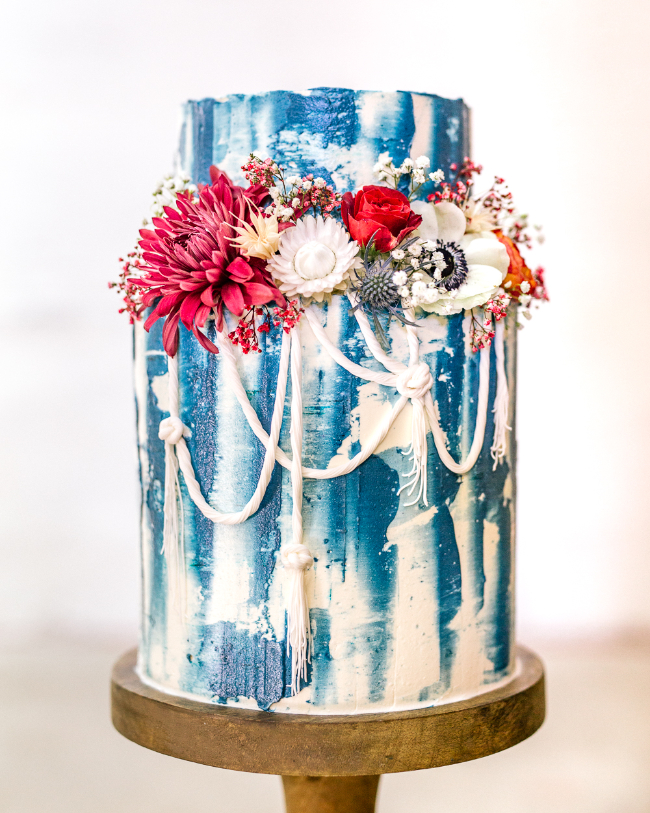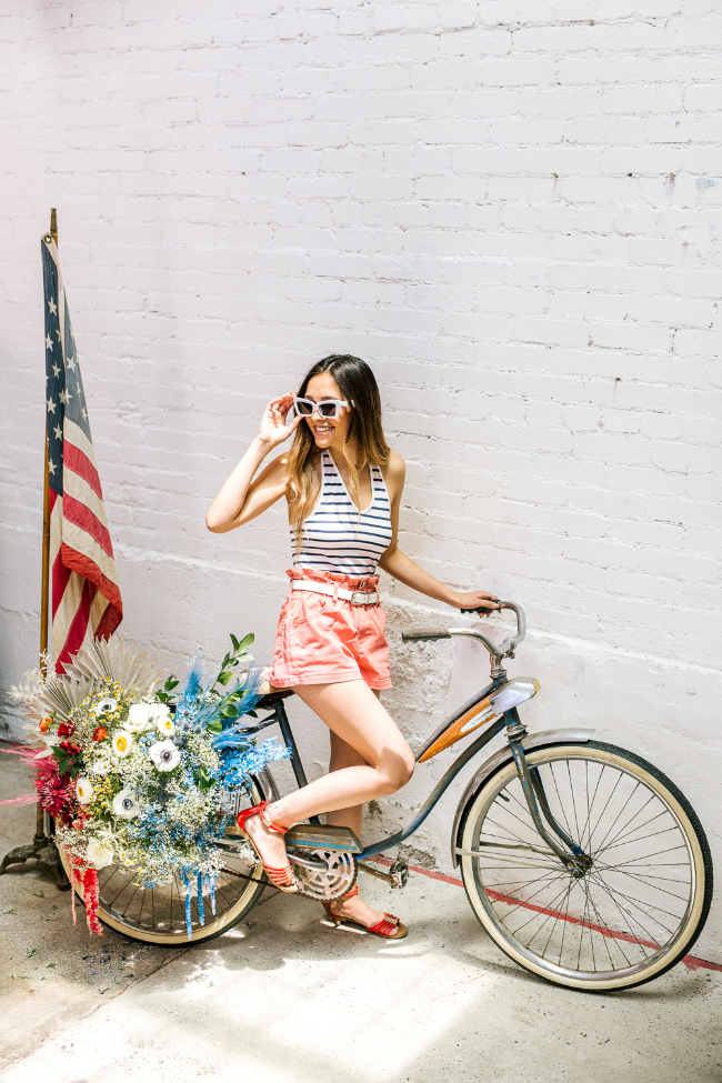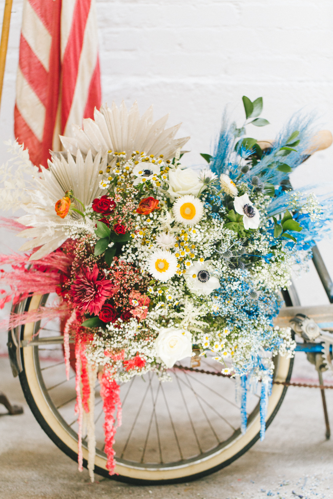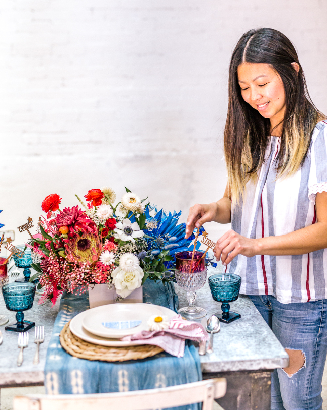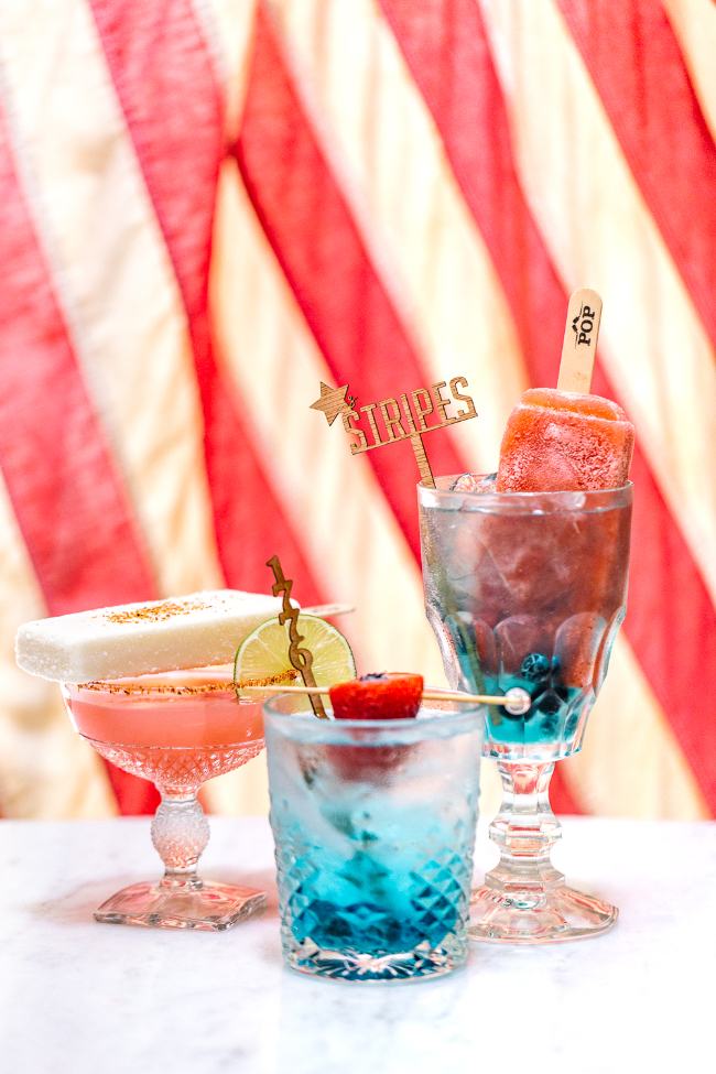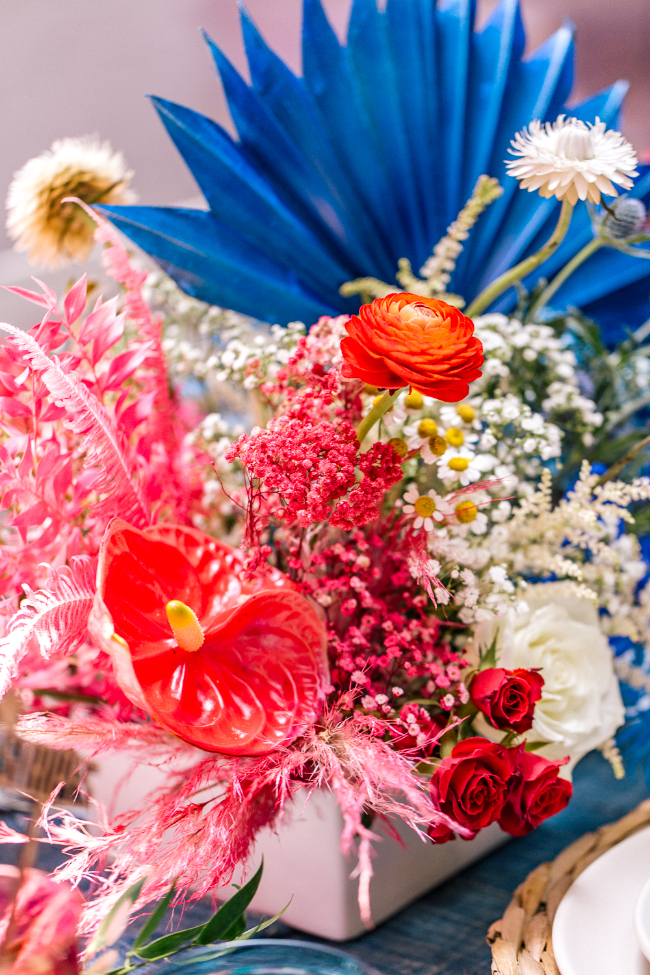 We wanted a wow moment over the tabletop so we enlisted our dear friend Michelle Rogers to do the hanging baskets with colored yarn. The yarn and baskets brought in amazing textures and lite up the space just like fireworks! The sister-duo over at Goldie Blooms created the most unique florals, we loved all the vibrant colors they added to the tabletop and setup. Let’s talk cake, Amriel’s Cakes made the most jaw dropping cake with perfect rope accent. What’s a 4th of July block party without yummy cocktail! Our favorite ladies at Bottles and Blooms created the most patriotic and delicious craft cocktails that were paired up with Pacific Organic Pops.