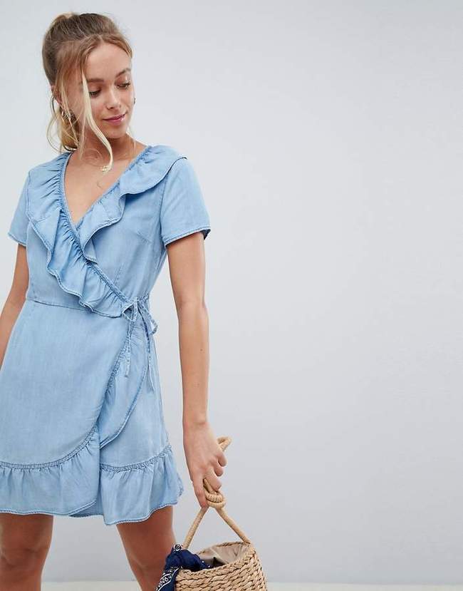 ASOS DESIGN denim wrap dress with frill detail, $45