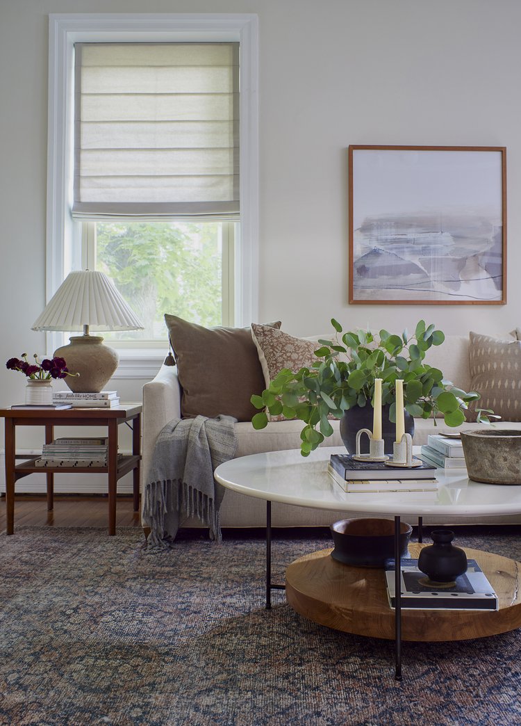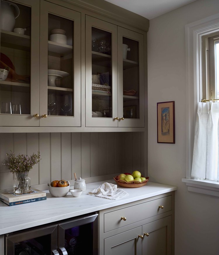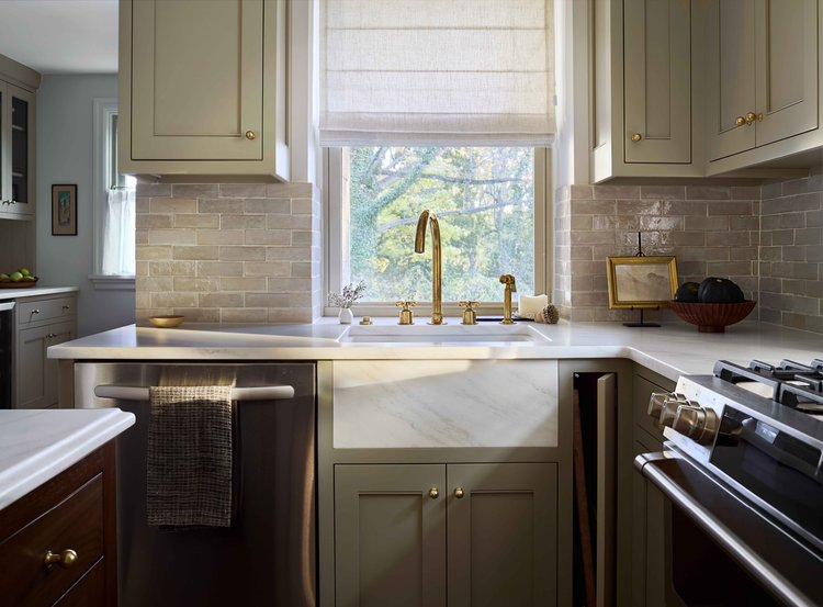 In the living room, a soft cream linen sofa is positioned comfortably beside darker accents and raw wooden textures, creating that perfect balance between cozy and collected. The kitchen echoes a blend of muted green cabinets, gold hardware, and a mix of marble and warm wood to create a space that’s both timeless and welcoming.