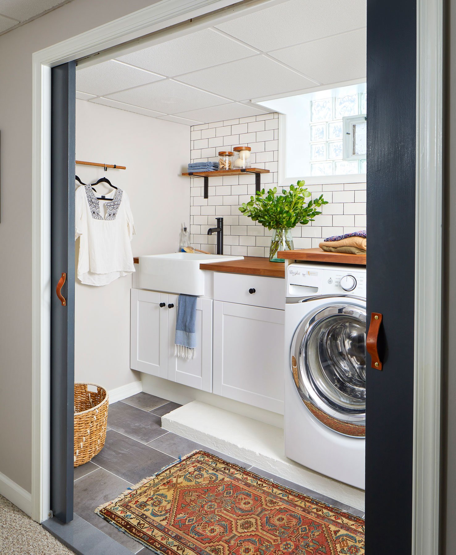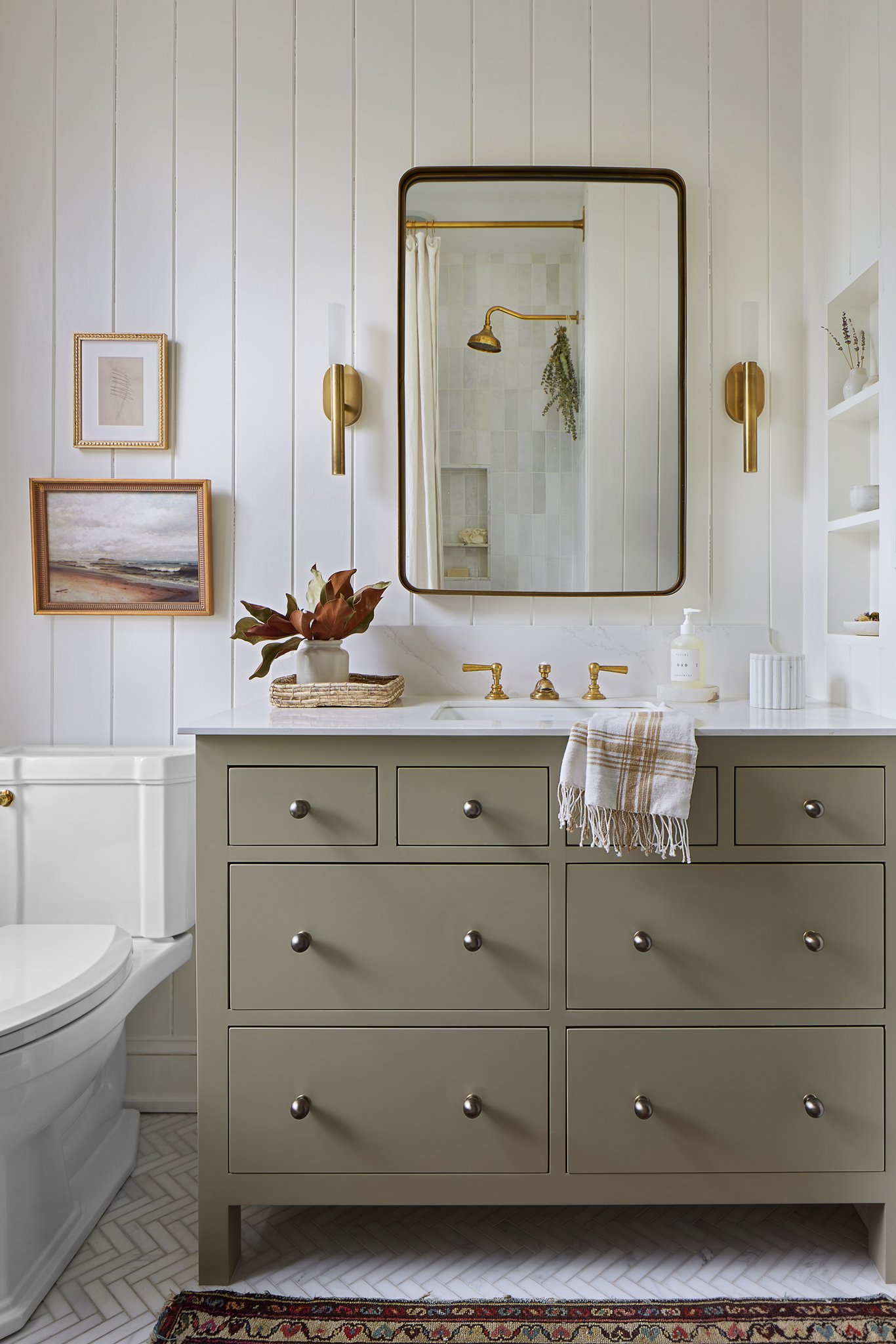 The thoughtful palette continues into the bathroom, where those soft greens, marble countertops, and gold accents make for a serene, sophisticated moment. Even the laundry room feels calm and intentional. In the primary bedroom, there are blends of rustic floors with sleek, modern touches – a quiet retreat, grounded and light.