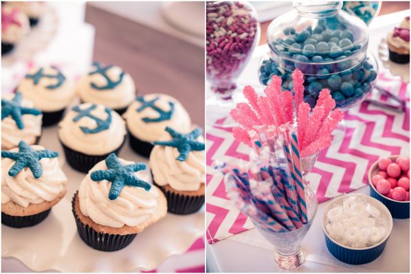 Meredith at Zoom Theory Photography hosted this baby shower for one of her girlfriends. We couldn’t think of a better place that would bring the nautical theme to life! Just one look at the starfish cupcakes and macarons by Cupcakes Couture of Manhattan Beach, and our mouths are watering! A variety of pink and blue sugary treats were separated into glass containers for guests to pick and choose from… how cute is the glass fish bowl with the sweet taffy?! We can’t get over even the smallest details!