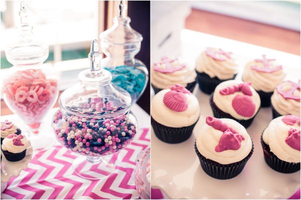 Pink chevron table cloth is to die for!How cute are these seashell topped cupcakes!