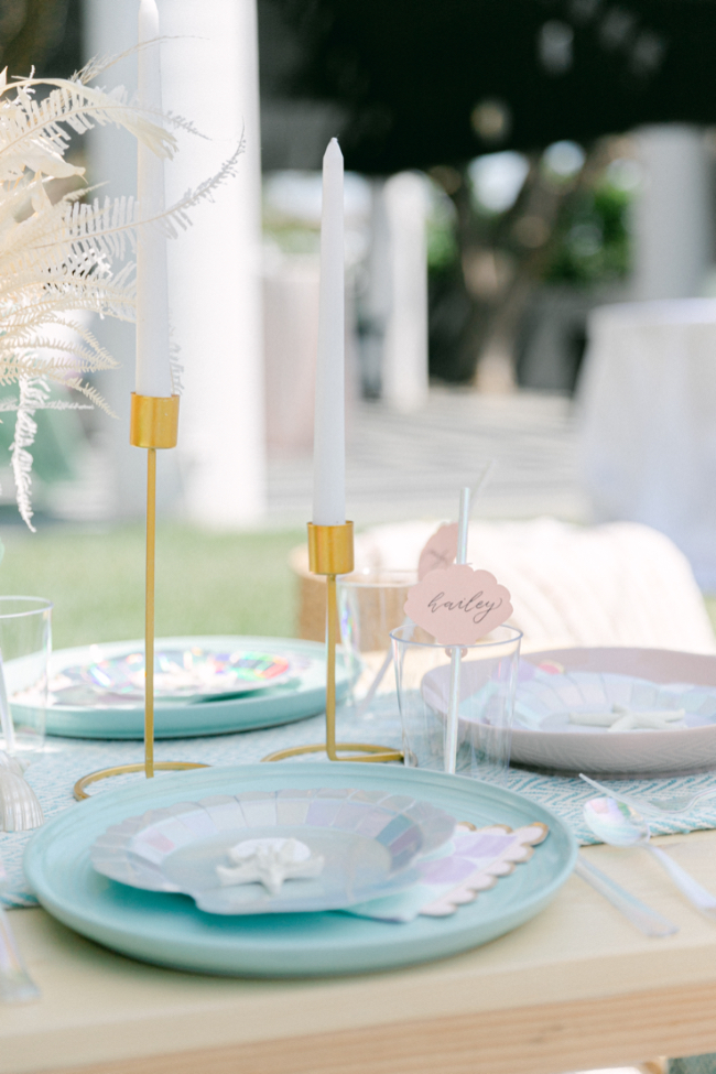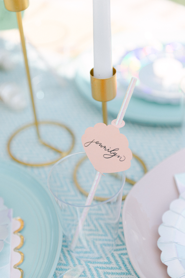 Starting with the invitation, designed and produced by the mother herself, this piece was a mixture of die cuts and iridescent sheens. This also translated to the “Bottoms Up Bar” sign and acrylic welcome sign. With a picnic table featuring metallic shell plates, seashell straw name tags, iridescent cutlery, and scallop-edged napkins, it was a playful setting for these little fish.