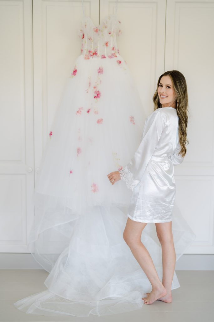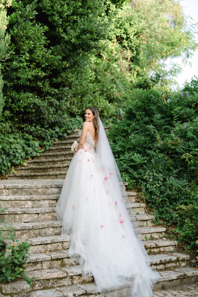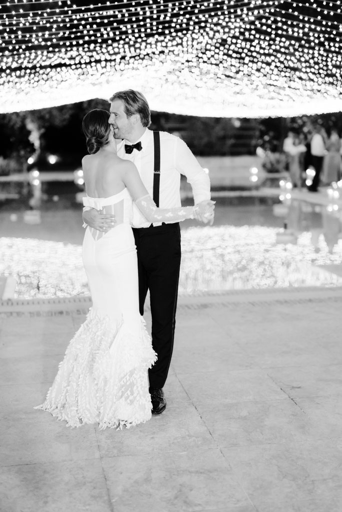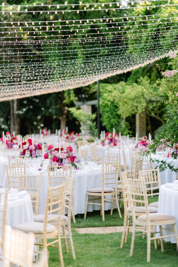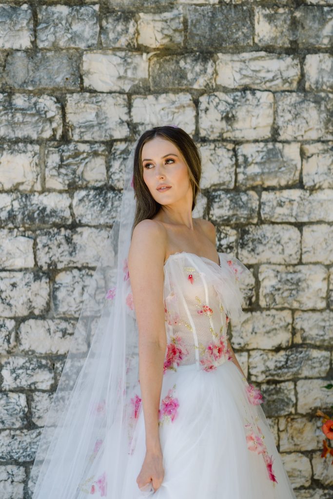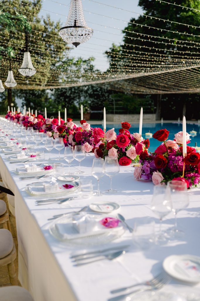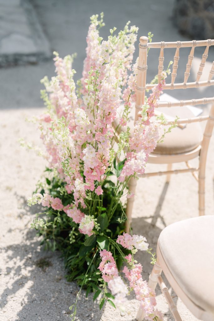 “Our wedding theme was based around my first dress. It was the very first wedding dress I tried on. The second I saw it, I was in love. The pink flowers felt so romantic and ultimately felt like the perfect dress detail for a wedding in Greece. Bougainvillea grows all over Greece and the flowers on my dress reminded me of it so I really wanted to incorporate the pink florals in my stationary and throughout the wedding day. Greece is such a vibrant country, so it felt especially fitting to have a reception filled with pops of magenta and red florals.”