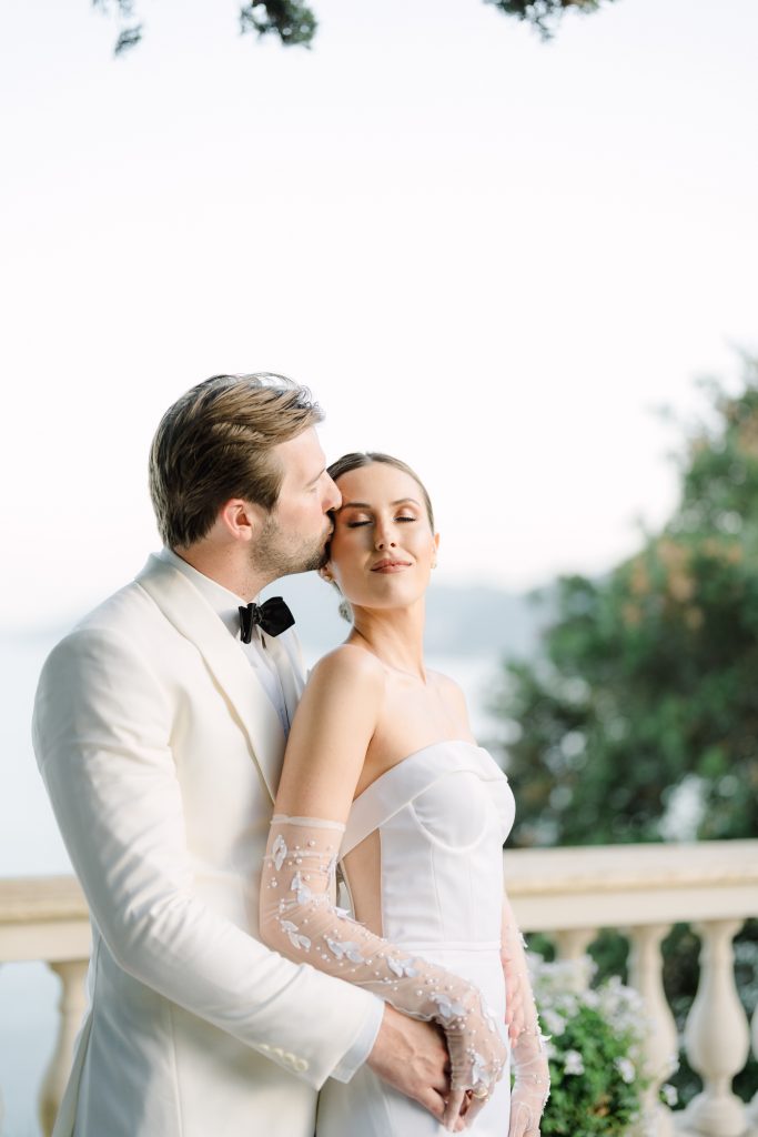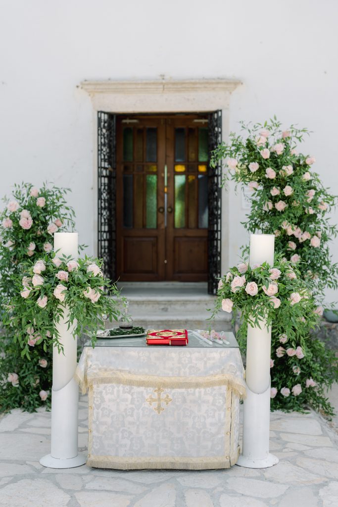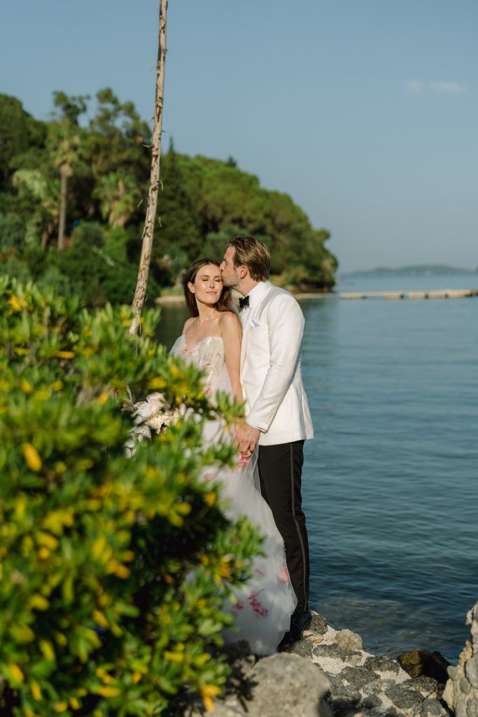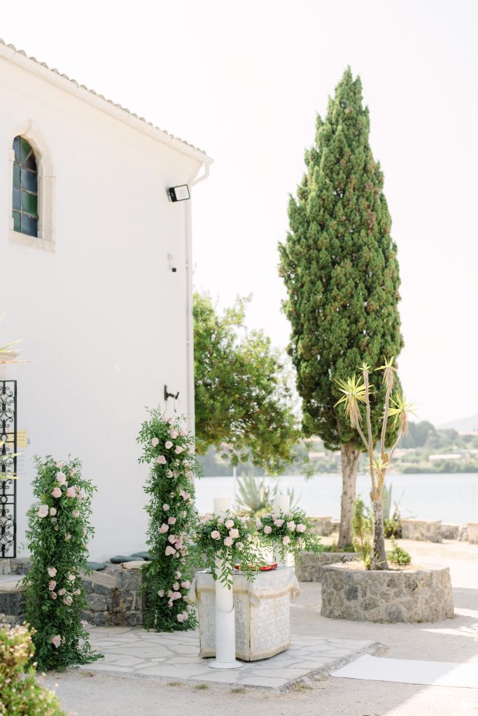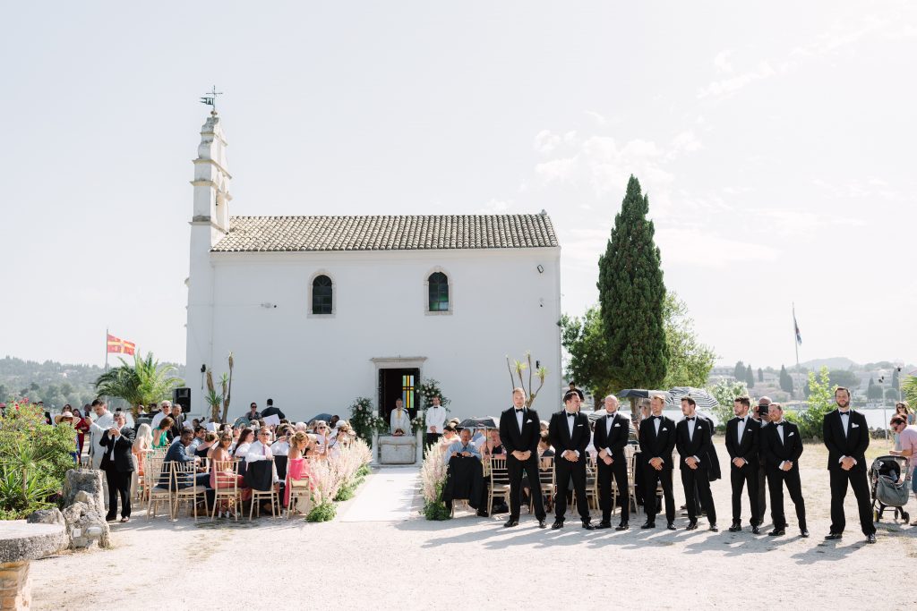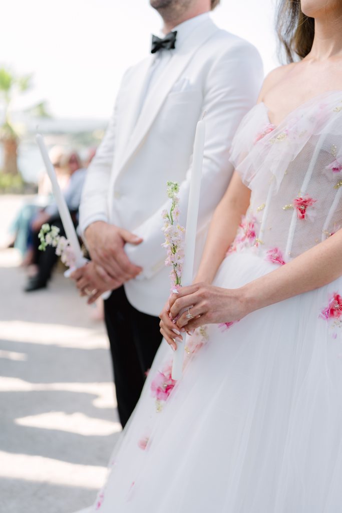 “Our wedding day began at Villa Sylva, where the entire wedding party hung out and spent the day getting ready. A fun fact about the villa, James Bond (For Your Eyes Only), was filmed there. Our ceremony was at Ypapanti Church, which was my personal highlight of the day. The church is surrounded by water and is hundreds of years old. It felt surreal getting married outside next to the water.