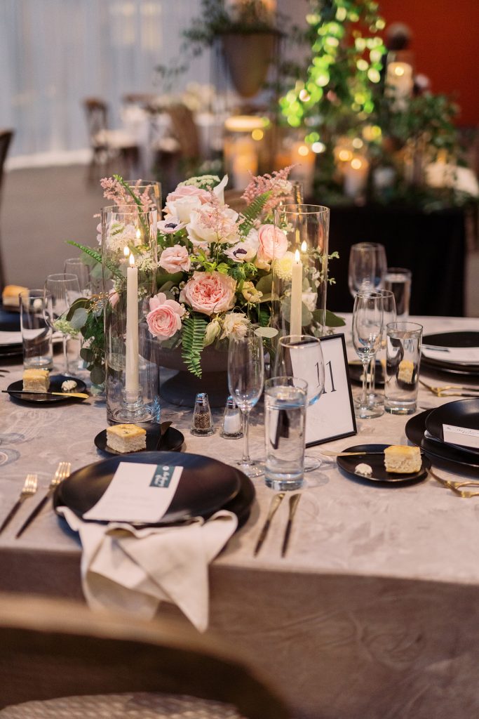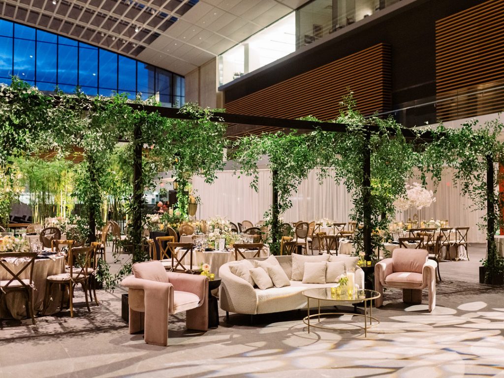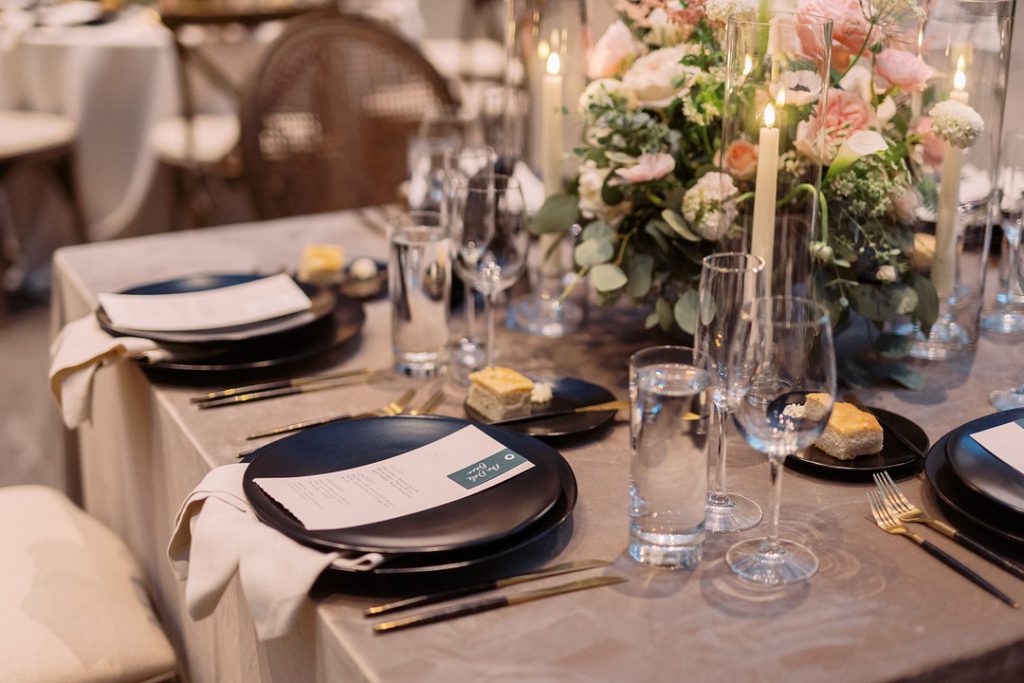 Once it was time to party, we asked guests to the dance floor, rather than asking them to sit. Guests made their way through oversized pergolas and indoor trees to kick things off! We had a mix of four different textured neutral linens topped with chic black stoneware dishes and matte black and gold flatware. Our menus were personal to each guest, with their meal choice secretly color coded for the catering team. While guests enjoyed their meal, a trio of rock violinists entertained guests while playing and dancing throughout the space – it was a huge hit! This wedding was a truly magical transformation of an already gorgeous space, and one our team will surely remember planning, designing, and coordinating for years to come!”