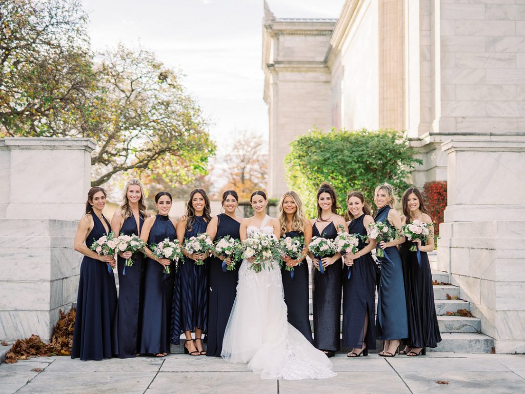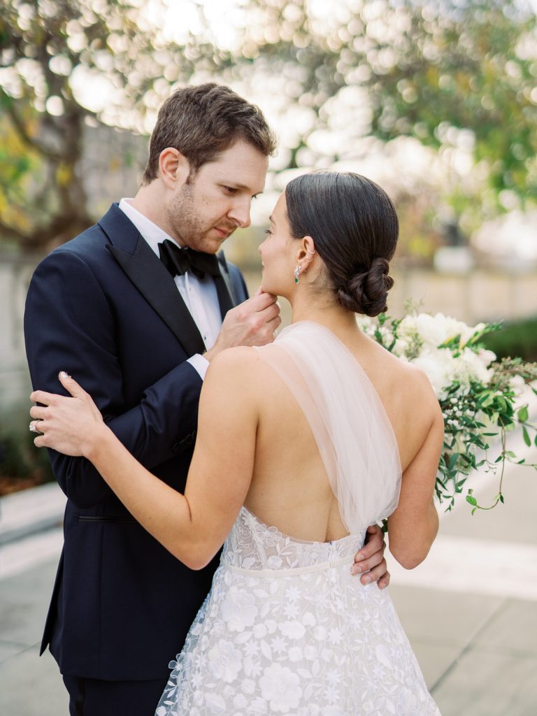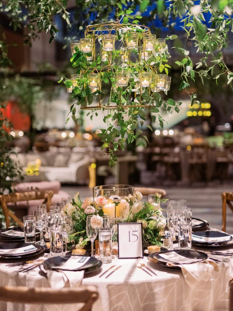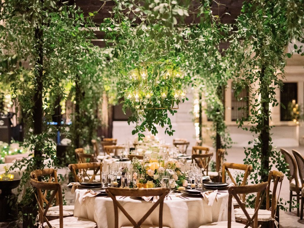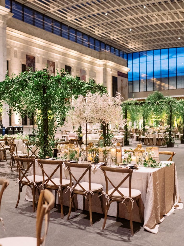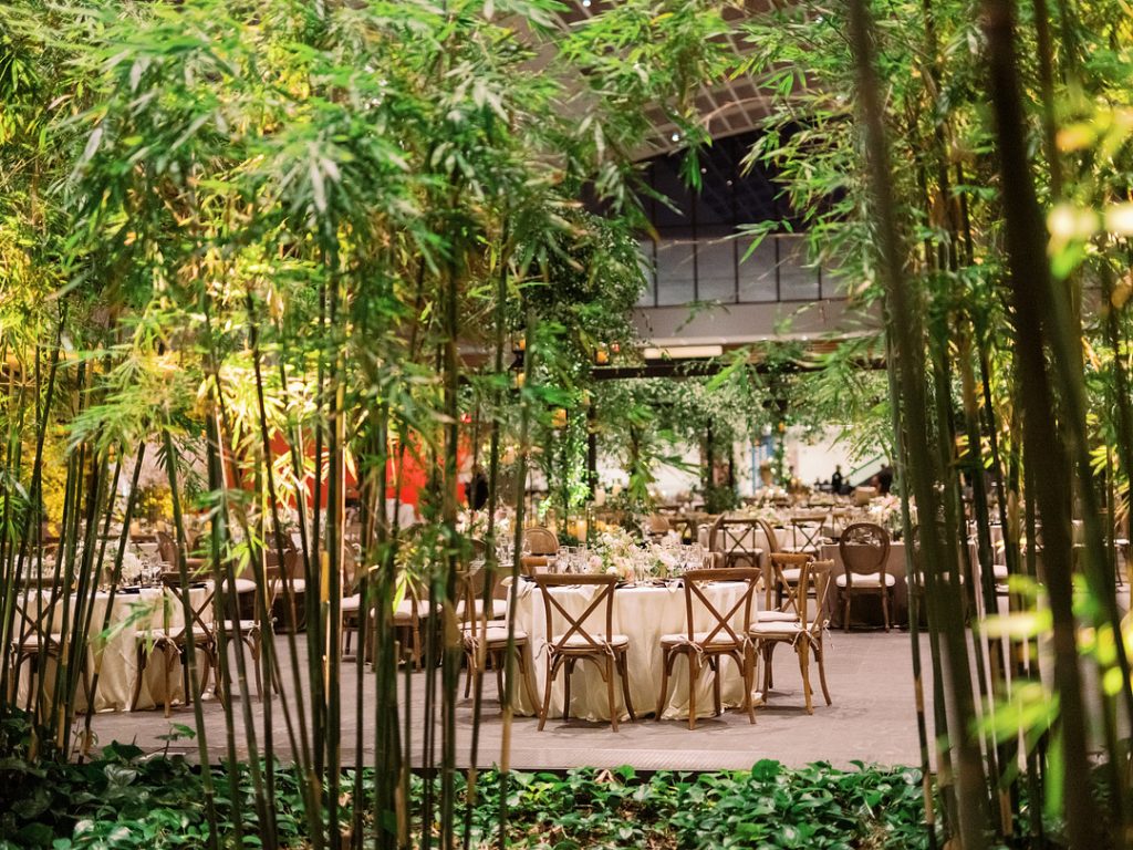 “Inspired by various restaurants with indoor trees and foliage, including Le Pavilion, The Edition, and Four Seasons NYC, we wanted to bring whimsical greenhouse meets jungle vibes accented with warm fall tones. The ceremony did not start until 7 o’clock in the evening, on a beautiful November night. By the time guests were arriving in their black-tie fashions, our indoor greenhouse was fully aglow, and the mood was so chic and romantic.”