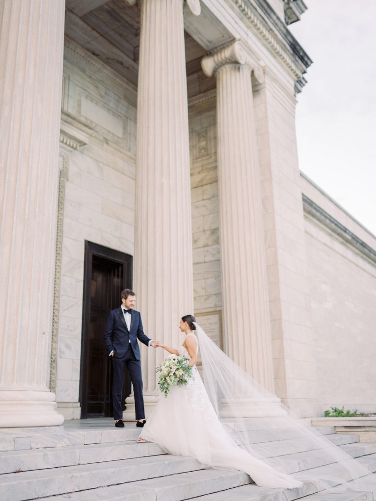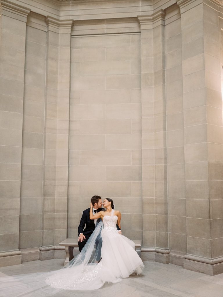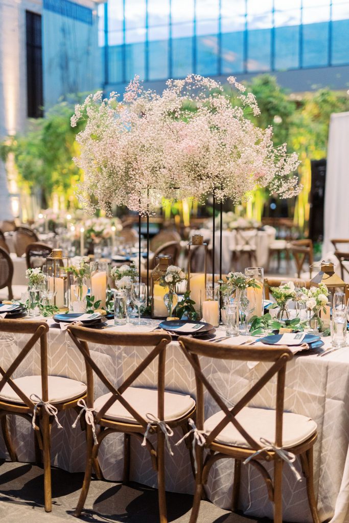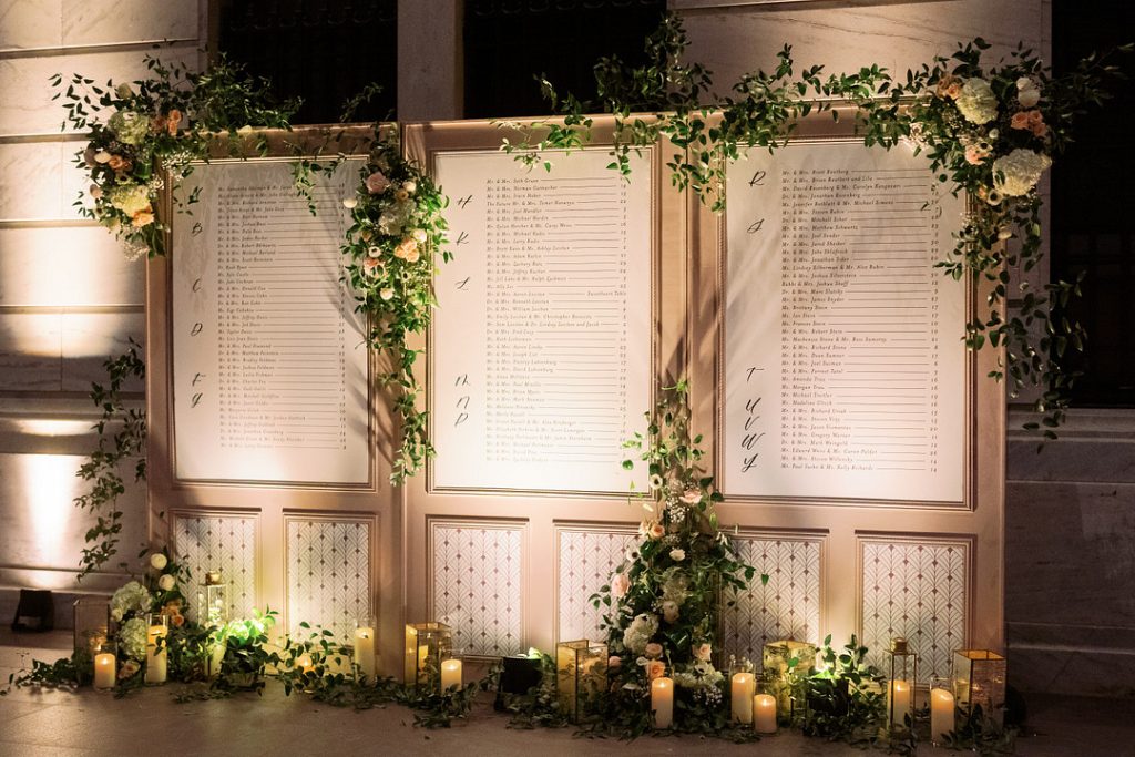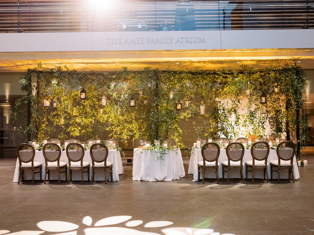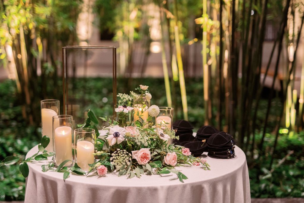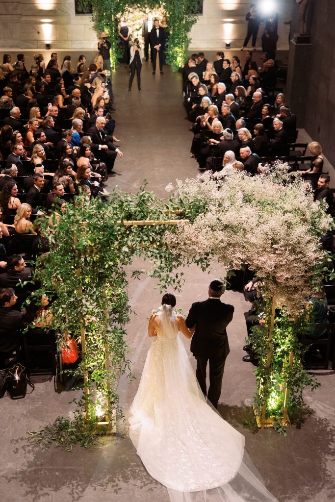 “Guests entered the museum and were greeted with spa water. Then they entered down a hallway of candlelight and ushered to our ceremony space. The space of the ceremony, intentionally flanked by a wall of living bamboo and subtle draping, to hide the reception space. When it was time for the bride to walk down the aisle, our string quartet heralded her down the aisle while playing Coldplay’s “A Sky Full of Stars”. The bride and her father walked under an arch, filled with greenery and pink and white baby’s breath. The couple married under a stunning chuppah, backed by a wall of pink baby’s breath.