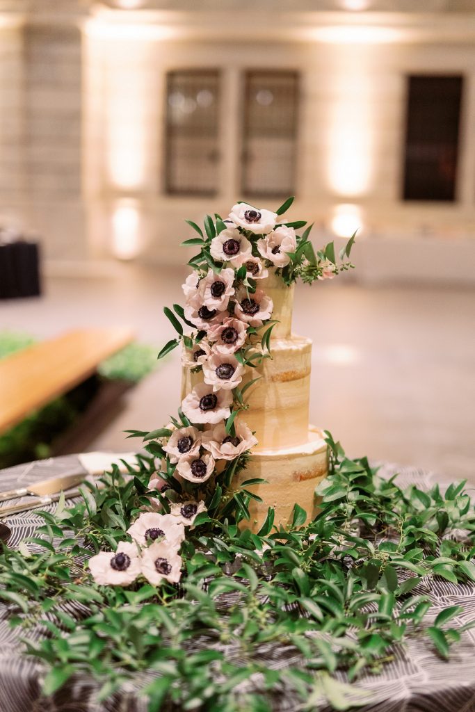 “Guests could find their seat assignments on a custom wall, with detailing from the invitations and stationery. They could also see the wedding cake pre-reception. It was a gorgeous ombre naked cake, overgrown with black and white anemones!