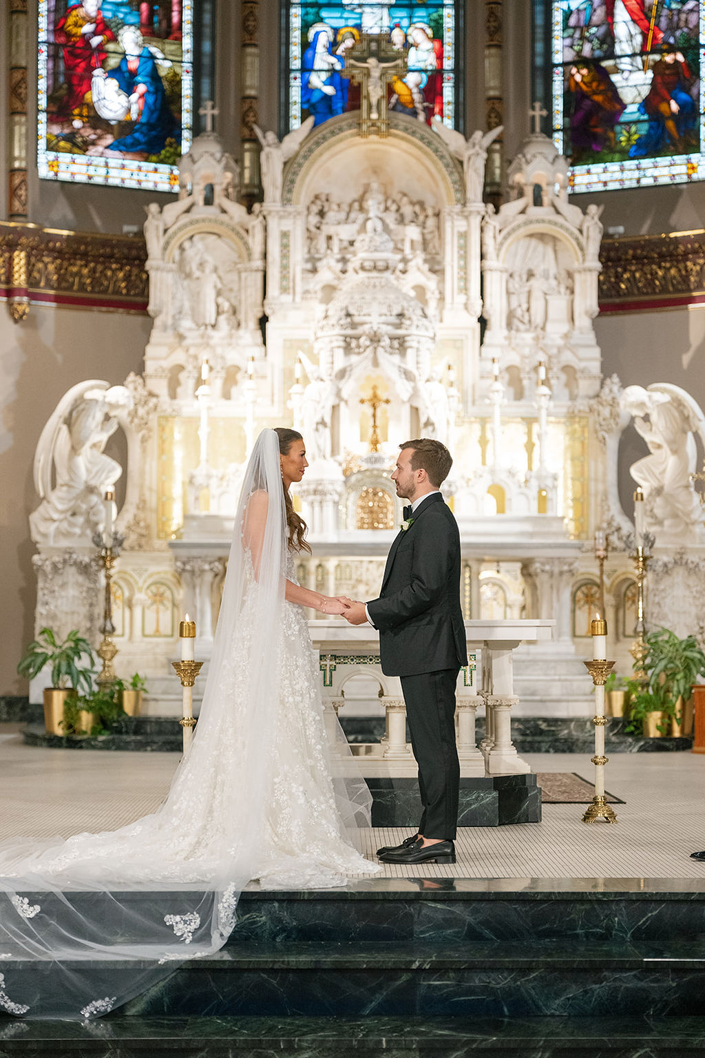 Ashley and James were married at St. Vincent de Paul Church. The church’s natural beauty set the tone, so the design approach was intentionally minimal. Rather than layering on decor, the focus was on enhancing what was already there – its architecture, light, and sense of history. Soft, thoughtful touches complemented the space without competing with it, creating an atmosphere that felt timeless and elegant.