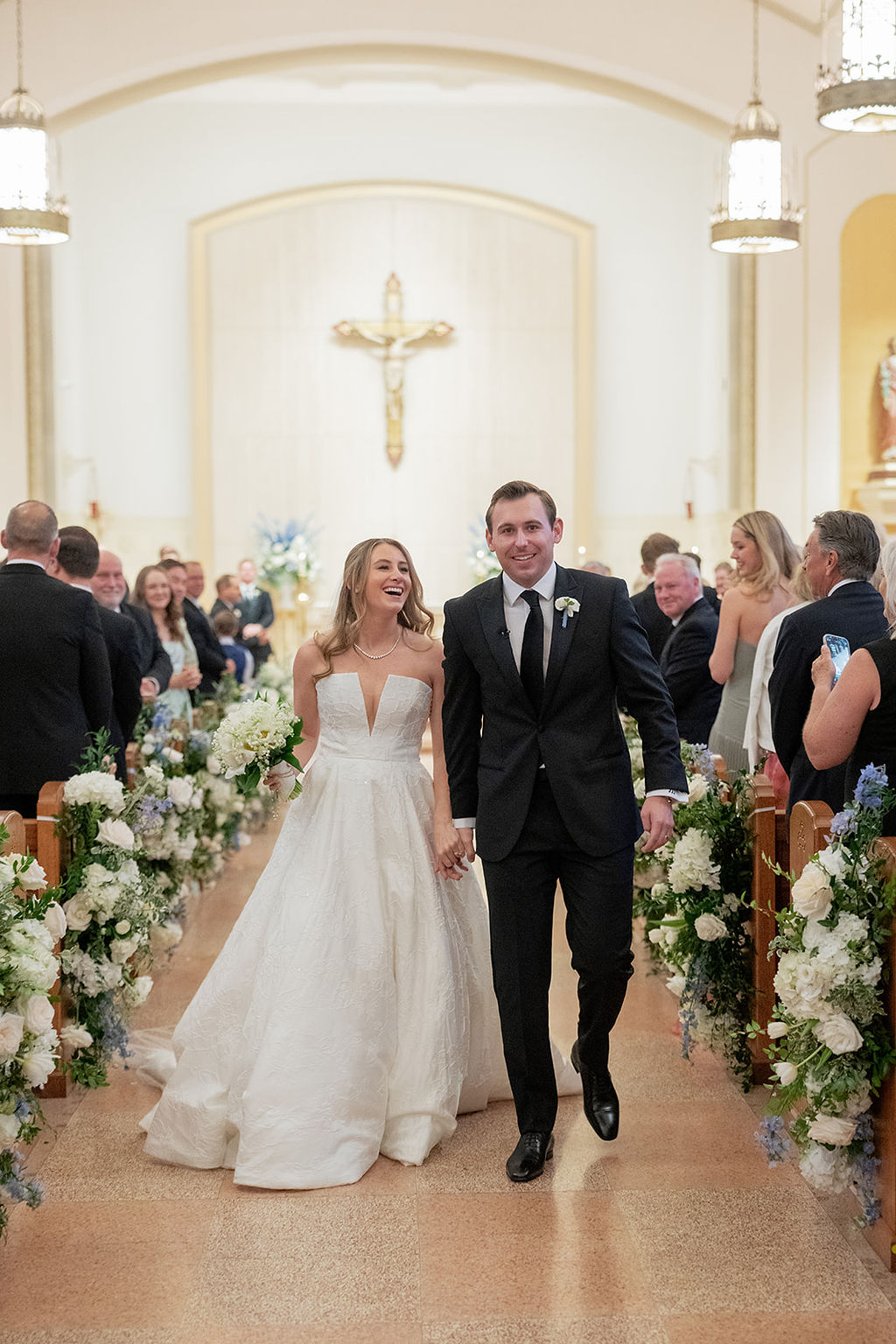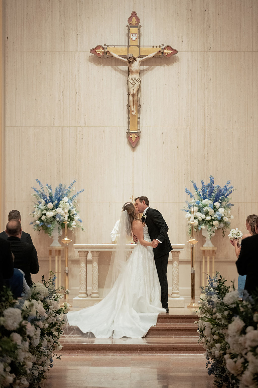 Danielle and Jacob’s wedding ceremony embraced the same Italian-inspired, floral-filled elegance that defined the day. Hosted in a grand cathedral setting, the aisle was lined with soft blue and ivory blooms, creating a serene and romantic backdrop for their vows.