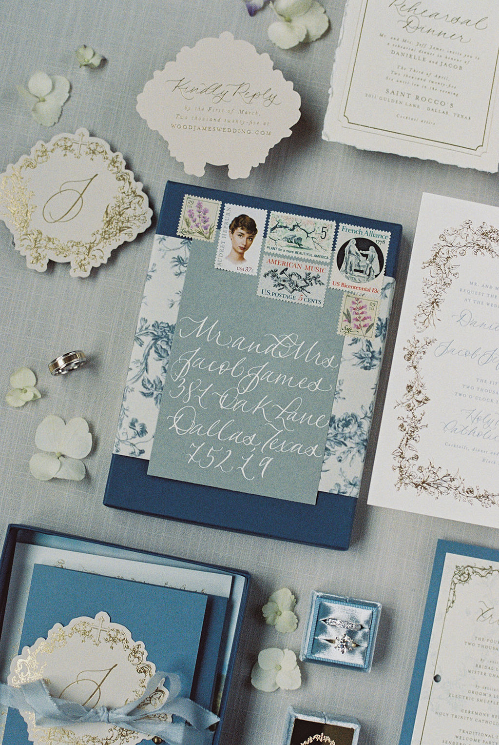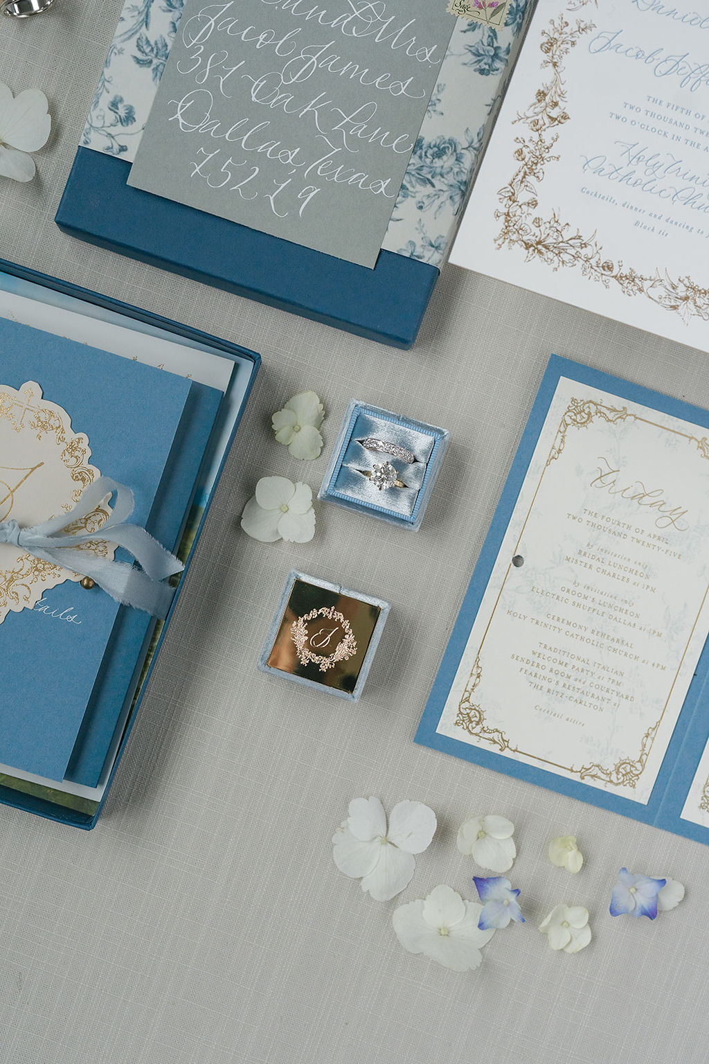 Danielle and Jacob’s original vision, rooted in Italian inspiration, met with lush, floral-filled elegance was woven into every detail of their European-inspired wedding, including their wedding invites and stationery. The invitation suite featured a refined palette of periwinkle and gold accents, setting the tone for a celebration rooted in Italian romance and sophistication.