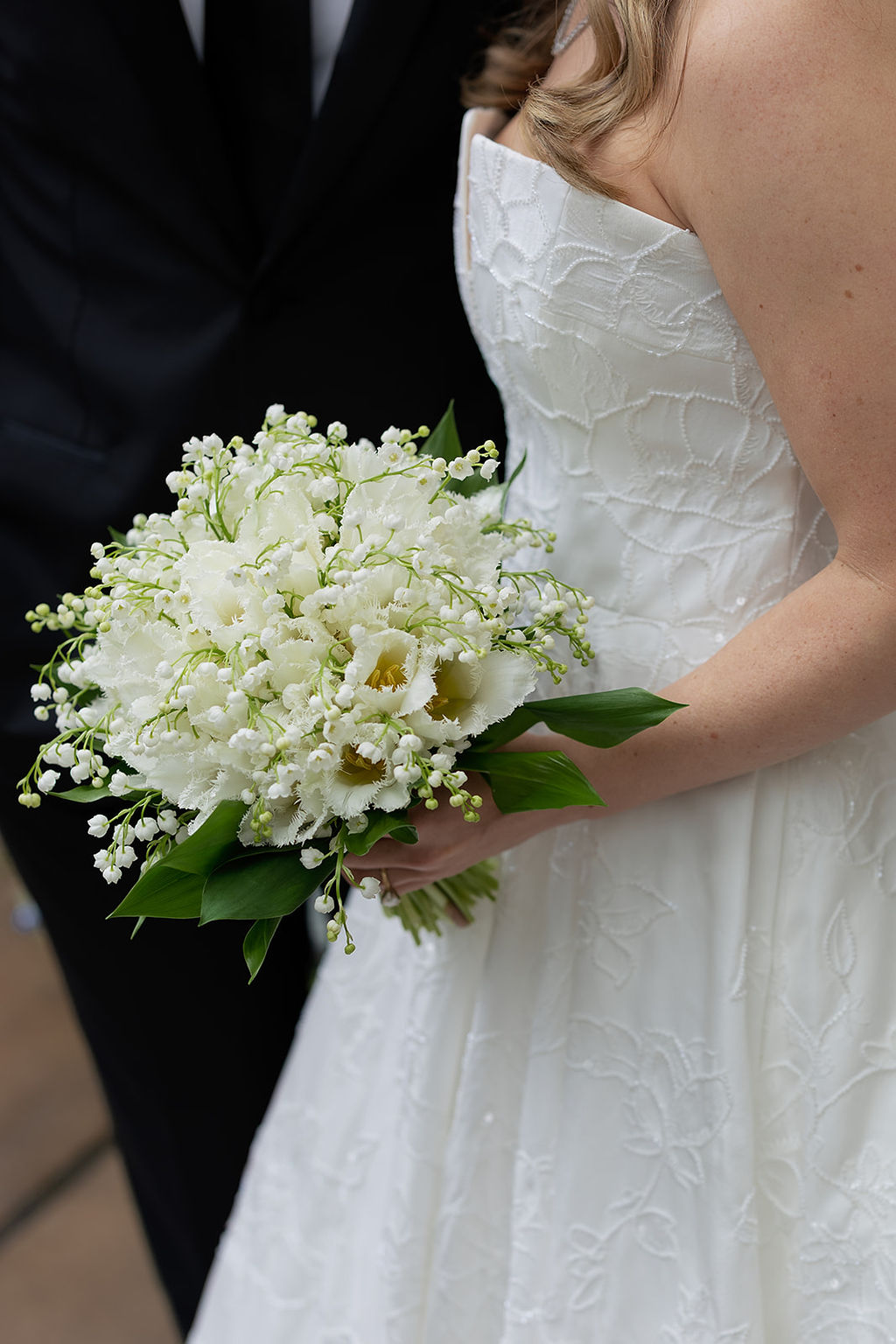 Danielle’s bridal look felt effortlessly timeless, with a romantic strapless gown featuring intricate lace detailing and subtle jewel accents. The neckline and delicate embroidery gave her look just enough personality while still feeling classic, and paired with a simple necklace and soft waves, everything came together in a way that felt really natural to her.