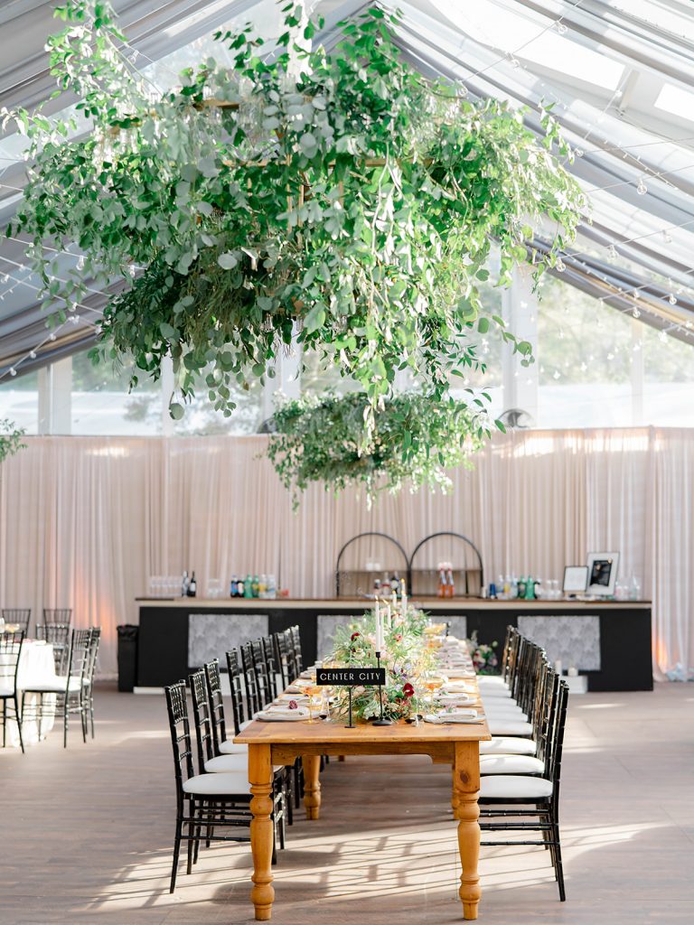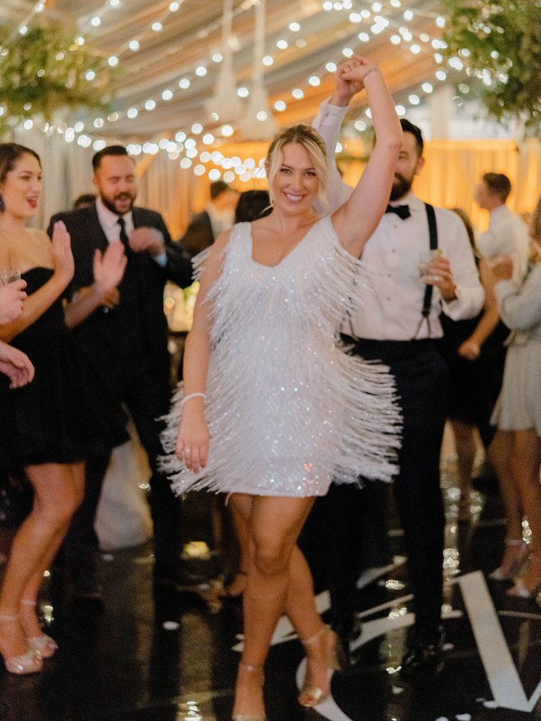 The reception took place at Franklin View by Cescaphe. The tented space was filled with modern & unique details. Linear elements such as a grid design on the clear ceiling, and a square, tiered cake added to the modern vibe. Dining tables were labeled with Philadelphia neighborhoods. Black chairs and deep grey curtains paired with a lustrous black dance floor and made the space feel modern, yet timeless. Chandeliers, floral arrangements and twinkle lights hung from the ceiling and provided a cozy & welcoming feel. After the first dance, Devon changed into a short, fringed dress by Nadine Merabi that was perfect for twirling on the dance floor!“