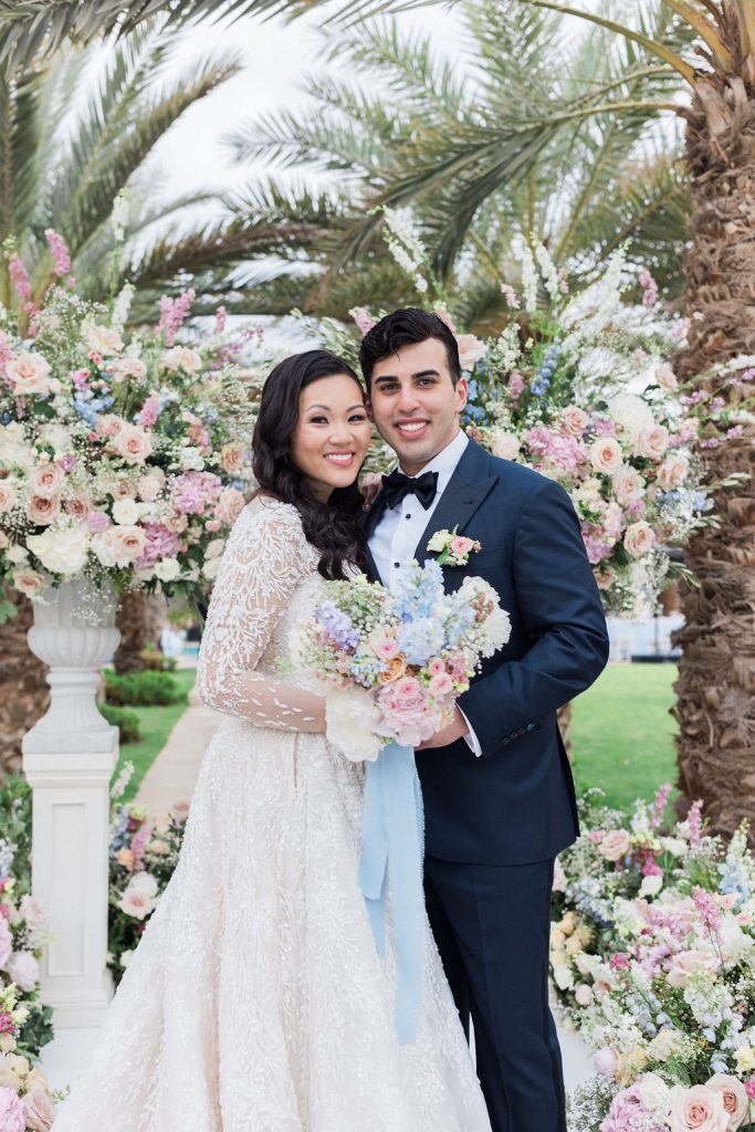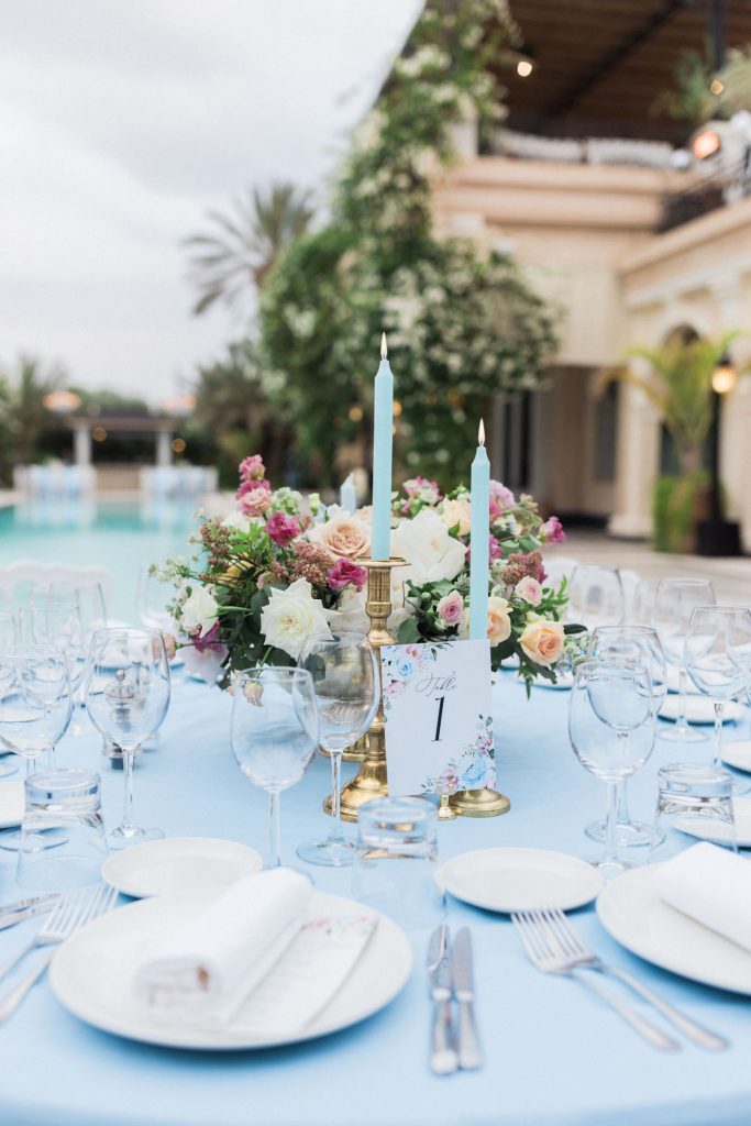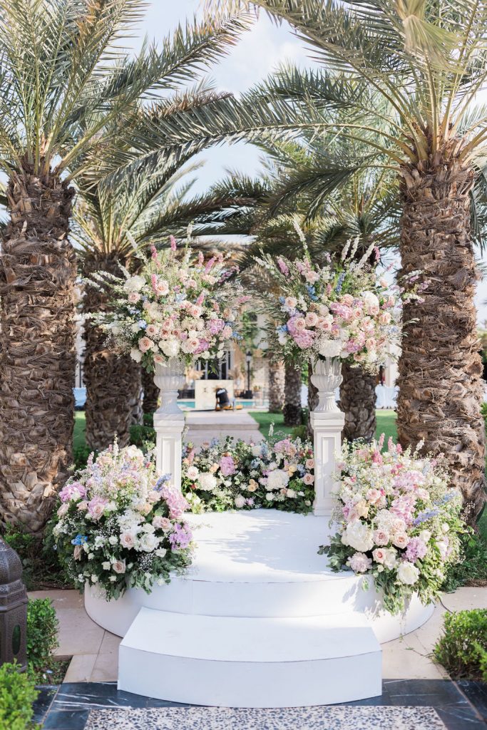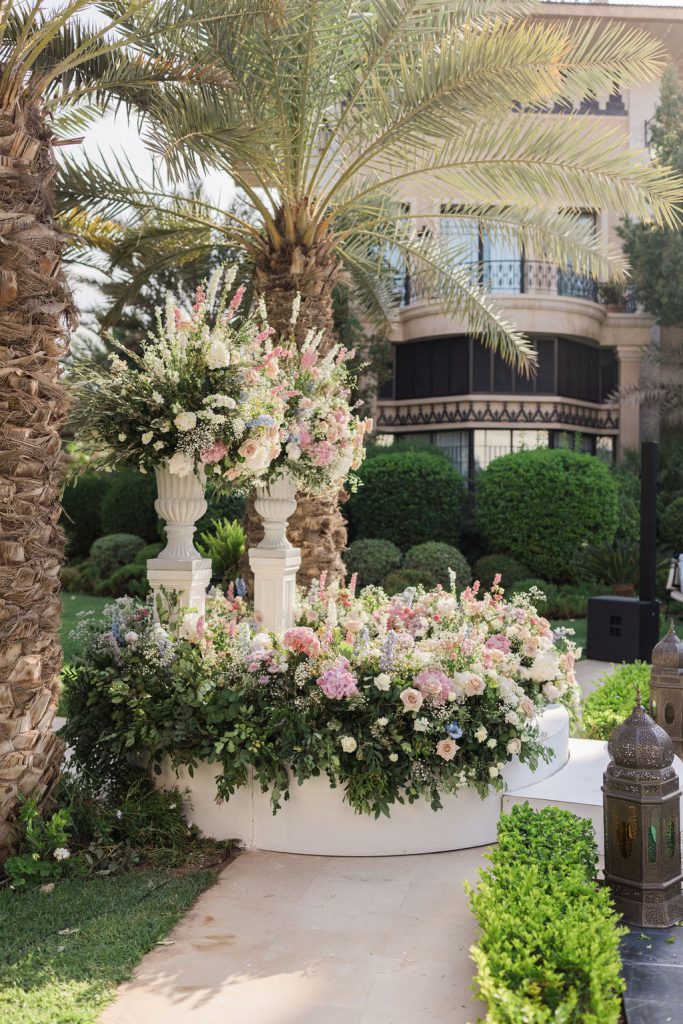 Morocco is a stunning country in North Africa where many different cultures intertwine. It has natural beauty with its mountainous terrain overlooking the Mediterranean Sea. This romantic mixed culture Moroccan wedding, set on a beautiful venue in Marrakech, has convinced us to book a trip to Morocco ASAP! The pink and blue florals pair beautifully with the palm trees and neutral color palette that this venue offers. Scroll on to see why we are gushing over this venue in Morocco!