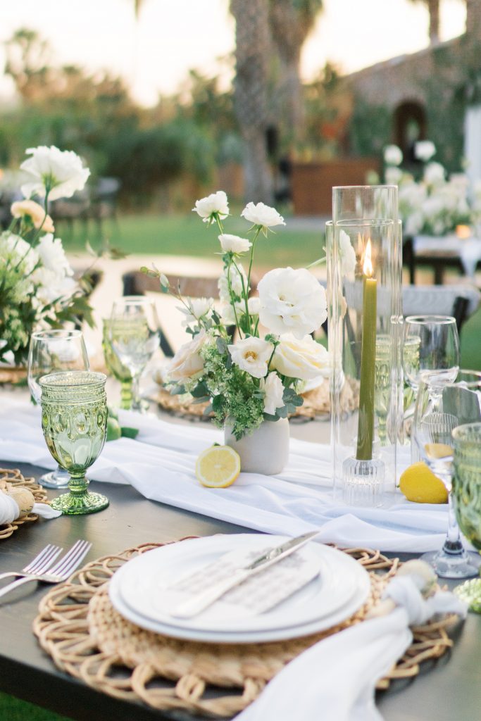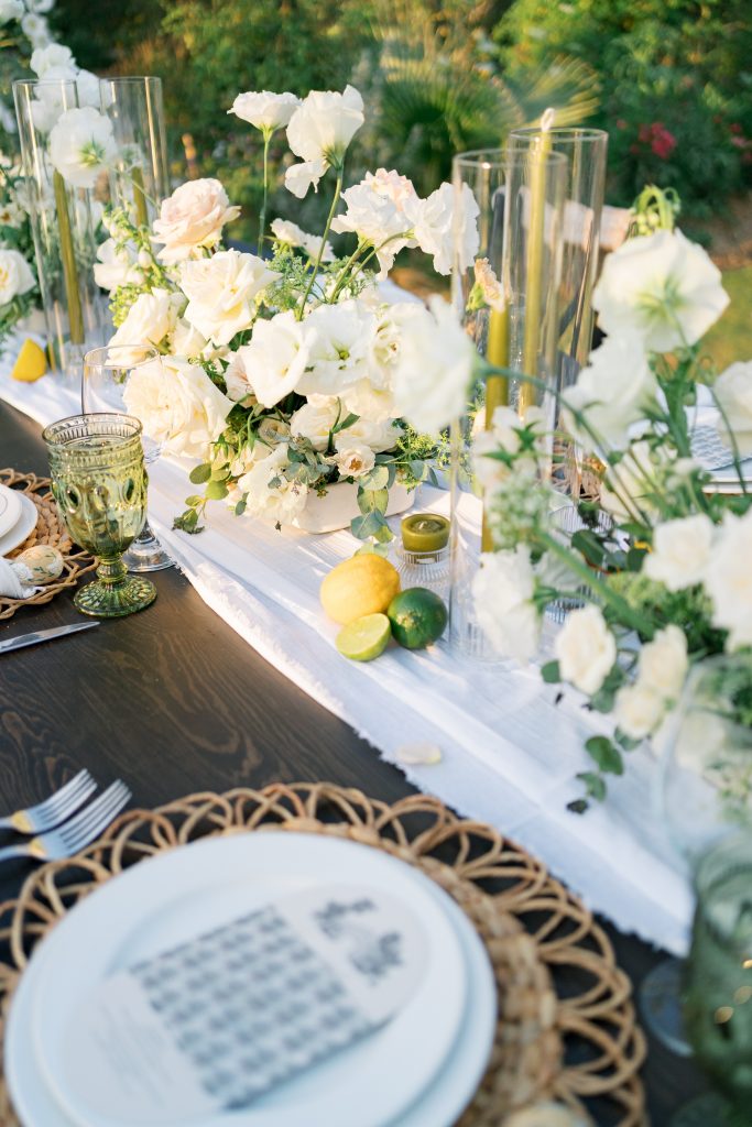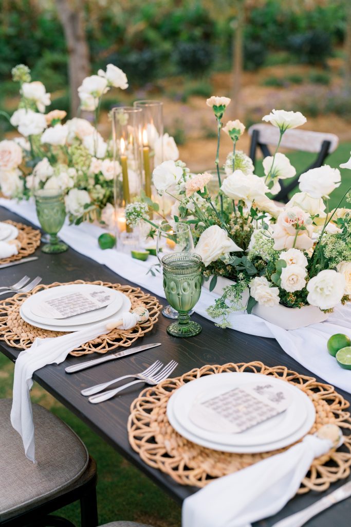 Our guests were absolutely blown away by the incredible backdrop of the desert mountains, while being surrounded by a lush and tropical garden oasis. There was a main barn area, covered in ivy and vines creating a storybook scene. It even had a rooftop that guests could go up to and overlook the entire farm in all its glory. Our wedding colors were nude with a hint of sage green. We played off of what was growing in the garden to help decorate the reception. We put local lemons/limes on each table to showcase the natural beauty of the space and tie everything together.”