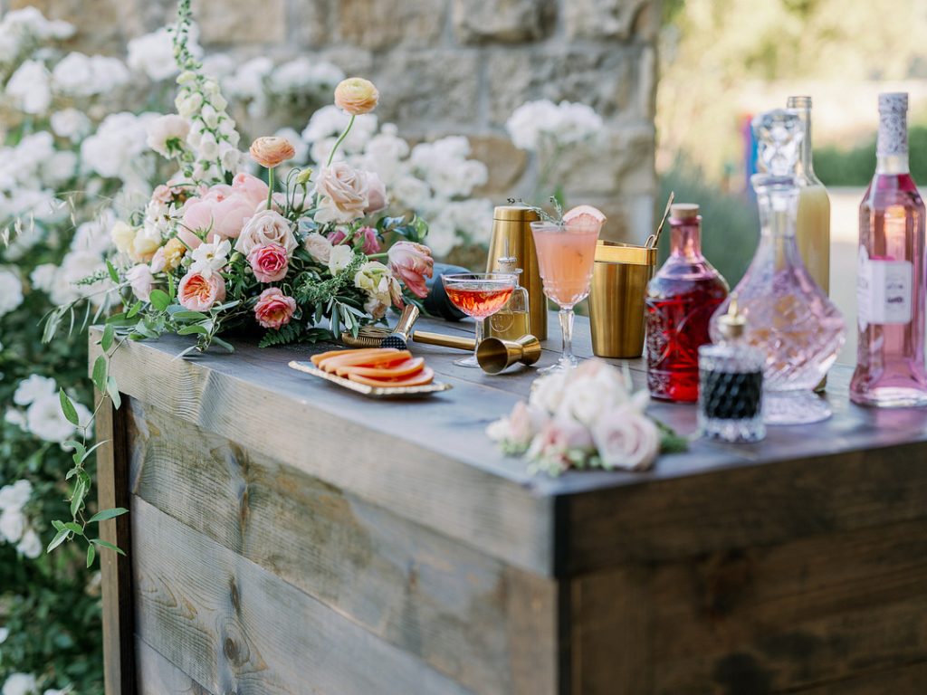 The ceremony stairs had an ombre style decoration. We used various color tones of roses within the palette and a mix of lush greens. The aisle had floral pieces on the ground and by the chairs. The option for cocktails at the bar included both refreshing citrusy and fruity drinks. All the details tied together perfectly for a summer night under the stars. “