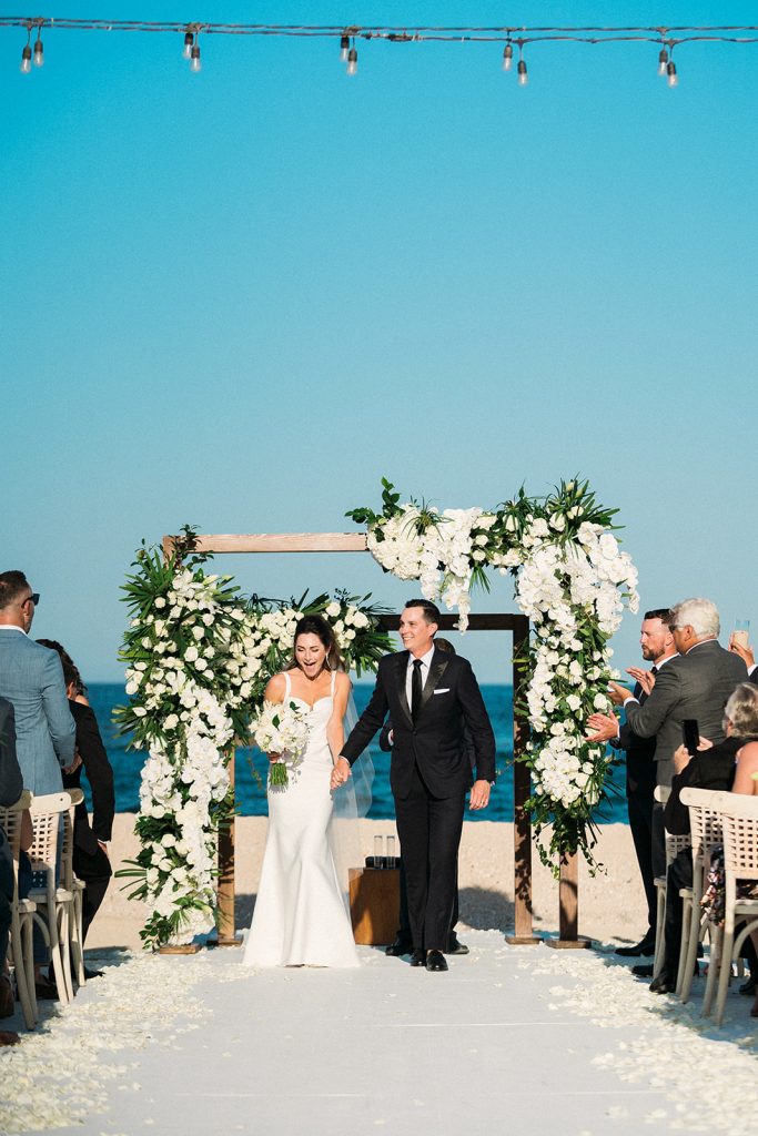 Cabo is where desert sand meets ocean waves. When you have a stunning background, such as the tropical paradise of Cabo, there is no reason to overdo your decorations. This elegant Cabo wedding consists of white and green florals with pops of gold. We love the natural greenery and unique tropical florals throughout the venue that adds to the entire experience. From the ceremony on the beach, to the open air reception, this is the perfect place to celebrate with your family and friends!