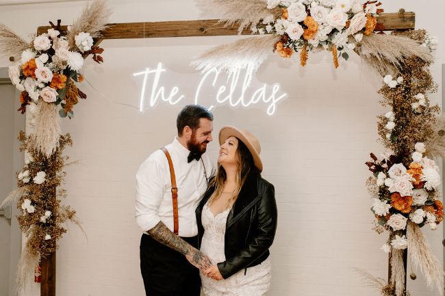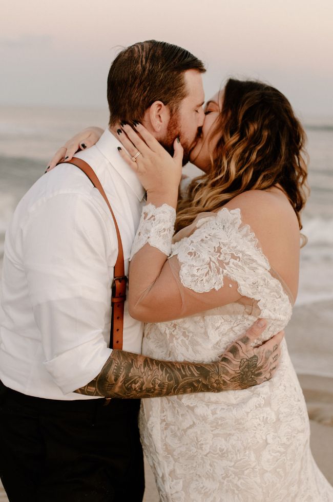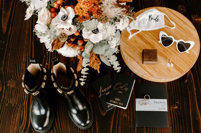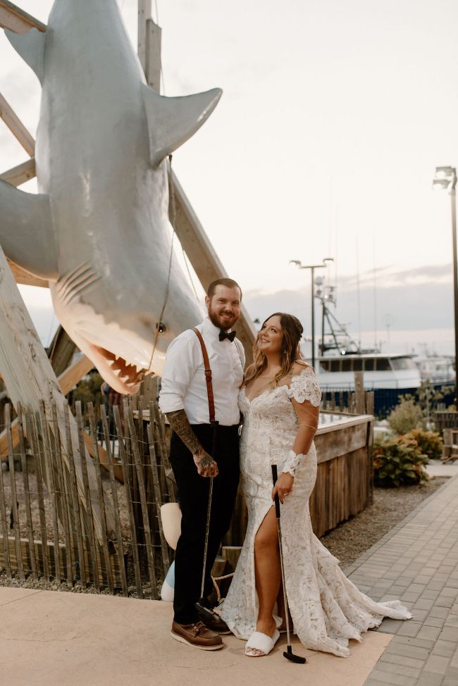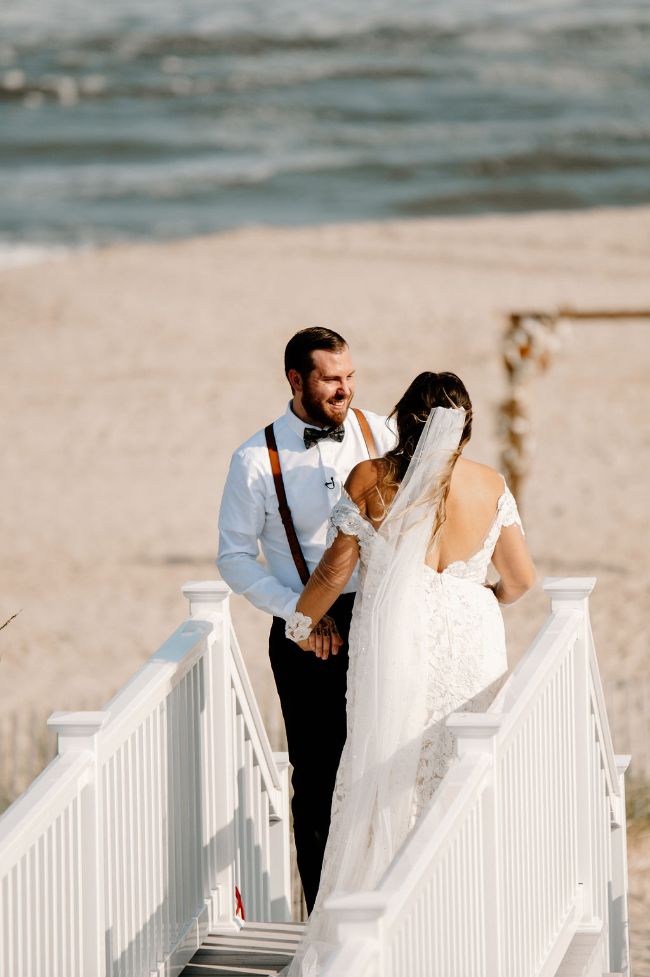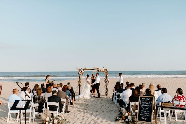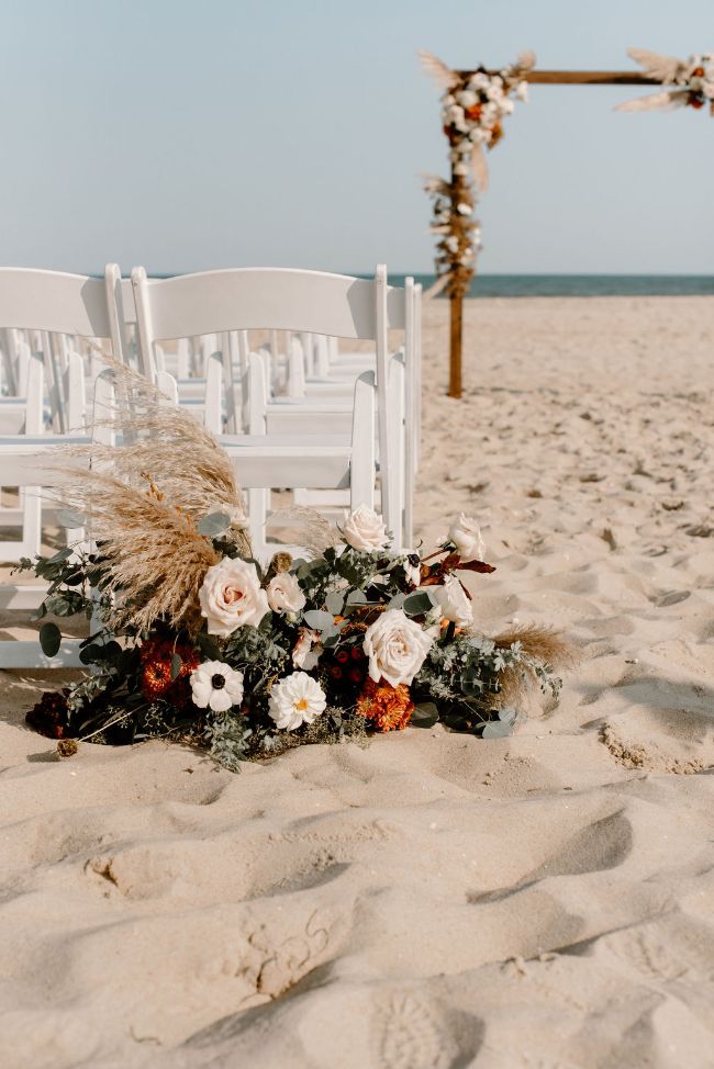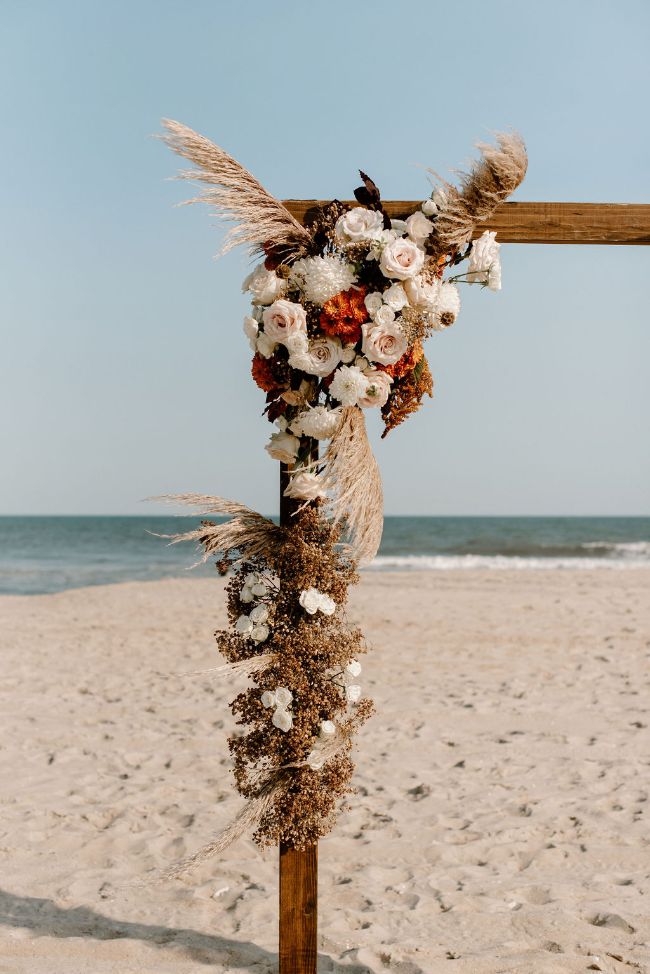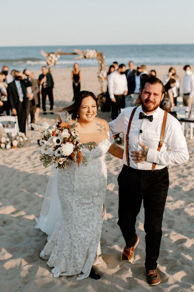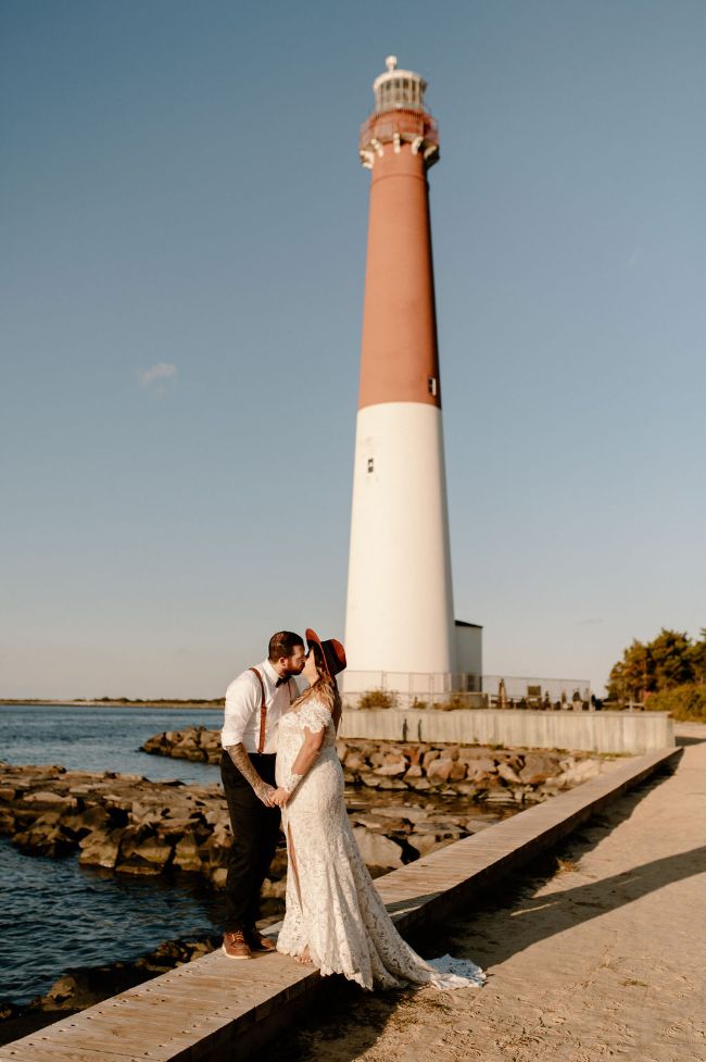Lauren and Cole’s LBI, NJ boho glam beachfront wedding was nothing short of unique, inspiring and FUN! The special day included Gucci boots, neon signs, leather jackets, mini golf, donuts AND a live donkey. Lauren and Cole’s wedding took place on October 1, 2020 in the middle of the pandemic. Although their wedding day wasn’t initially what they had planned, they ABSOLUTELY made the best of their celebration. One of the most beautiful parts of the day was when Lauren walked down the aisle towards her soon-to-be husband as the sea glistened in the distance — there wasn’t a dry eye in sight. The location of their day was so special because Lauren and Cole both grew up going to LBI. The couple chose to do both their engagement session and wedding right on the beach where they spent their childhood summers. Now they live together right off the island, surrounded by a city that has years of memories, old and new, embedded into it.