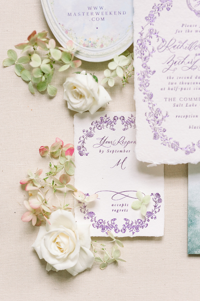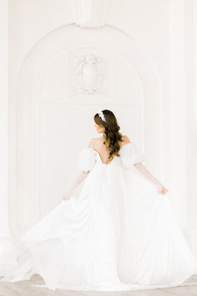 The luminous Regencycore-inspired editorial shoot was completed by shades of lavender, lilac, dusty blue, powder blue, and neutrals mix with opulent and feminine details. Industry talent from Salt Lake City came together to create the Bridgerton vibe! The bride is wearing a Elanor couture gown floating across the ballroom. Made with over 32 yards of silk tulle and lace, this exquisite gown by Cinq features a fresh water pearl strap and the Paige glove.