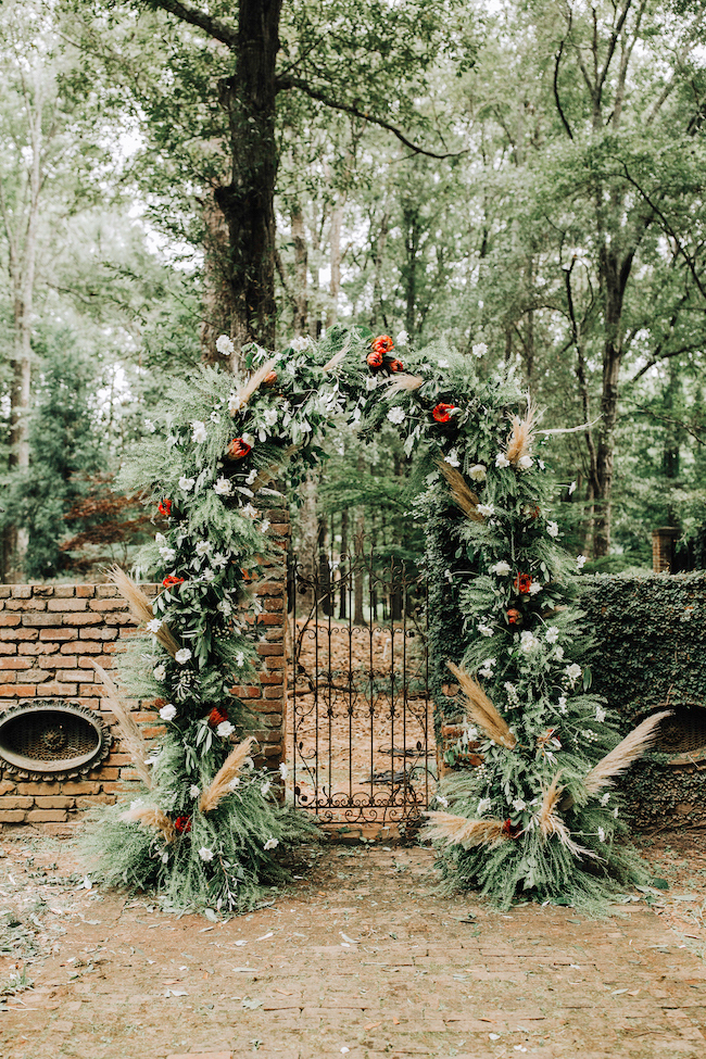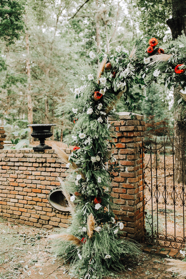 Luxe and Bloom no doubt was up for that. Chelsea has a wonderful way of taking my design board and bringing it to life. We wanted an arch in the garden that was a piece of her dream, and WOW did Chelsea deliver on that. Those florals, the pampas grass…well it was breathtaking. The Sunken Garden at The Hill, in Athens was extraordinary. A beautiful acrylic sign by Paper Daisies Stationery welcomes guests to the ceremony. Goodwin Events provided the gorgeous farmhouse benches for the guests at the ceremony. Entering the garden the gates were highlighted with mixed greenery and enchanting protea.