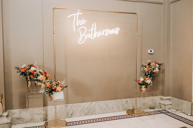 I wanted the large wooden doors at Georgian Hall to reflect a similar feel to the ceremony arch and bring the outdoors in. With that and the wispy greenery asymmetrically running up the columns it felt like a magical place. Luxe and Bloom hung their neon sign on a gold pipe stand. Adding acrylic columns to the sides and flanked them with florals in gold vases. It was a huge hit for a photo spot! Fireworks graced the streets of Athens and Lauren Bailey Photography took the most amazing shots of Andie & Colin in the streets of their favorite little town celebrating their big day.