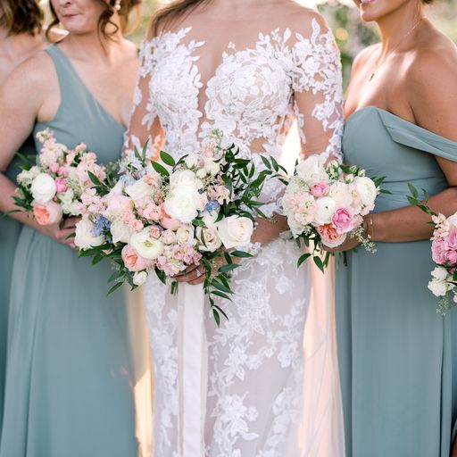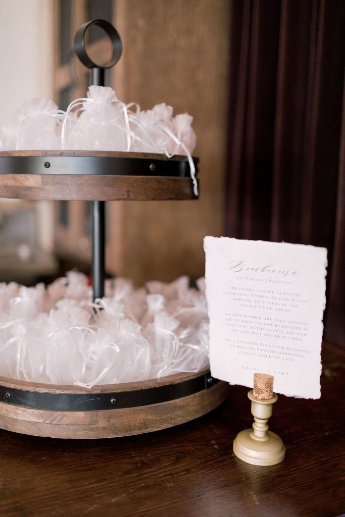 The bride, Brooke, is an incredibly skilled graphic designer and she custom designed all of the couple’s wedding day stationery from the invitations to the menus and place cards. Every item was designed on handmade and hand-torn paper and featured a small nod to the lush Italian Ruscus and smilax in their floral designs as well as a celebration of their soon-to-be-shared last name initial, B!