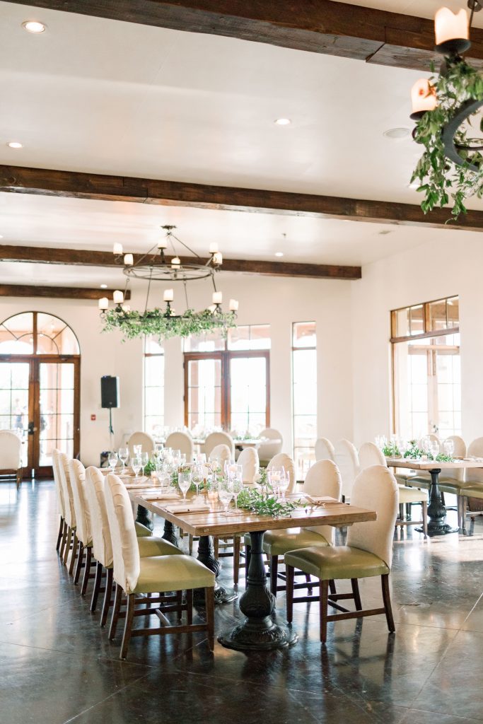 When designing their reception, the couple was excited by the intimate nature of the dining area; so we curated the floral design and set it up to accent the natural Italian-inspired furniture design. Their guests were able to relax and feel like they were all joining in on a large dinner party overlooking the hills of Dahlonega, Georgia.