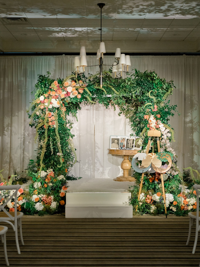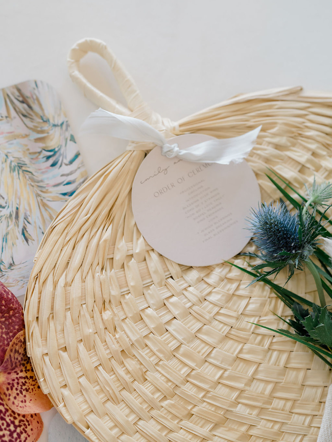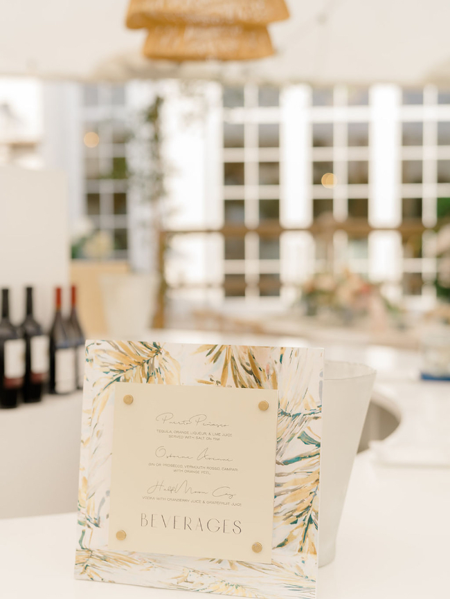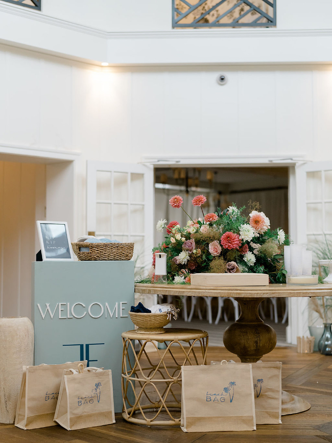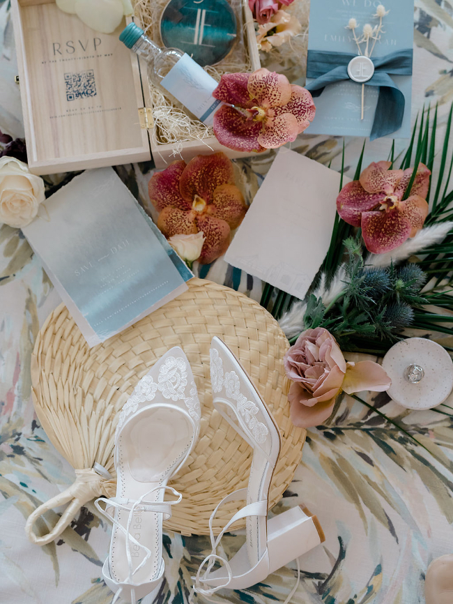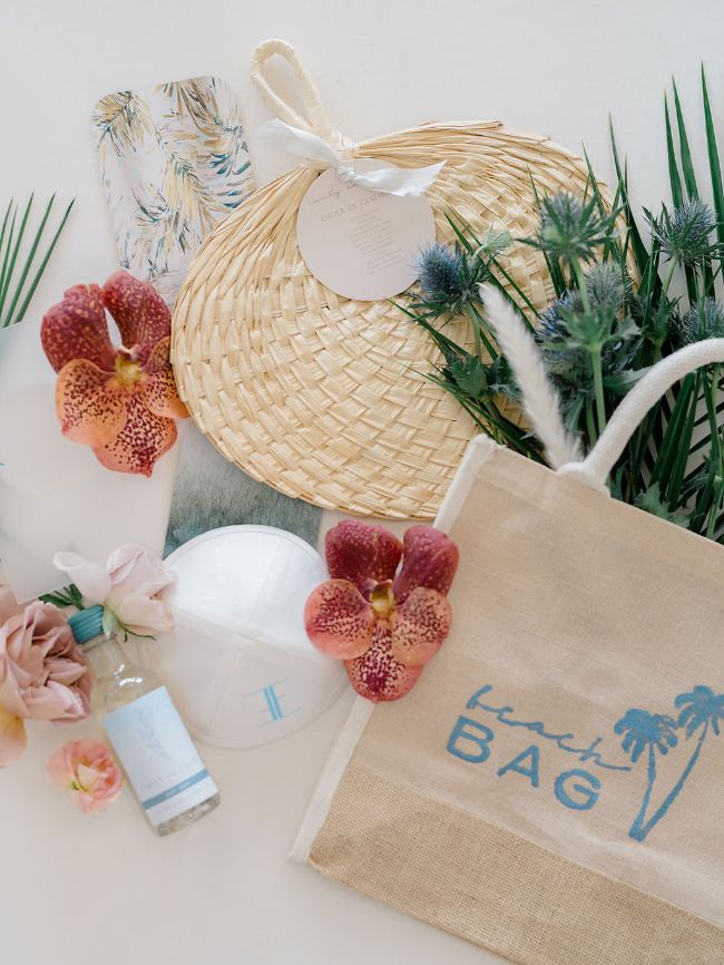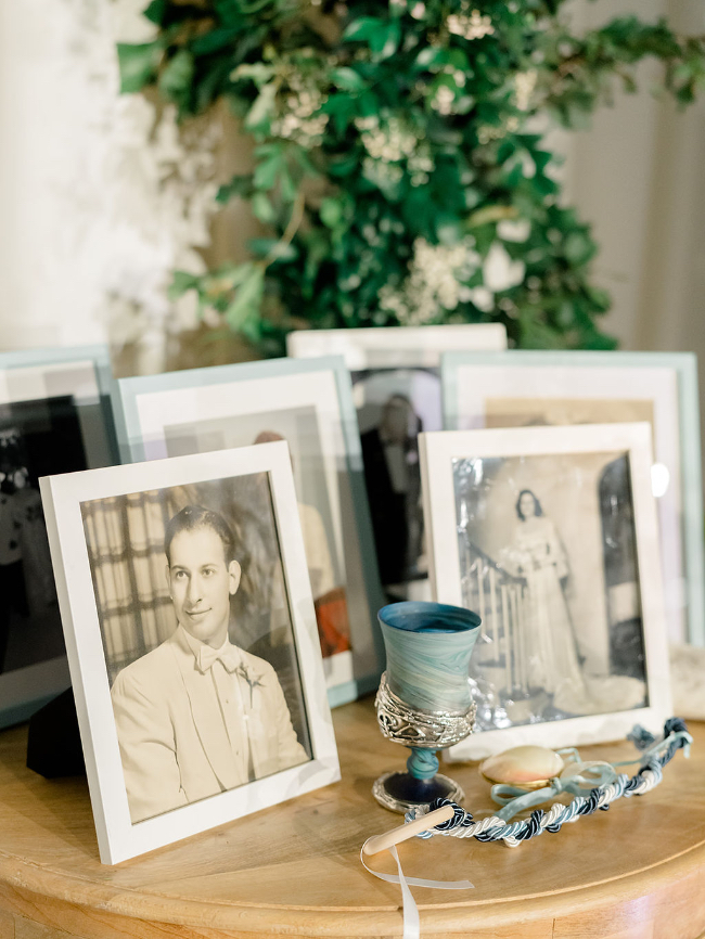 The details spoke for themselves all day. The celebration started with welcome “beach bags,” tropical florals, and coastal-inspired accessories. The modern invitations by House of Catherine featured a QR code so guests could easily RSVP to the event. Emily’s bouquet by Fete Urbane was overflowing with the most gorgeous florals and light blue ribbon, matching the bridesmaid dresses. The Jewish ceremony took place under a chuppah adorned with countless flowers and greenery.