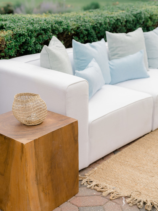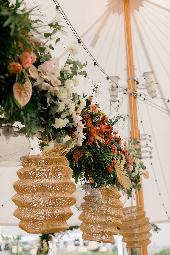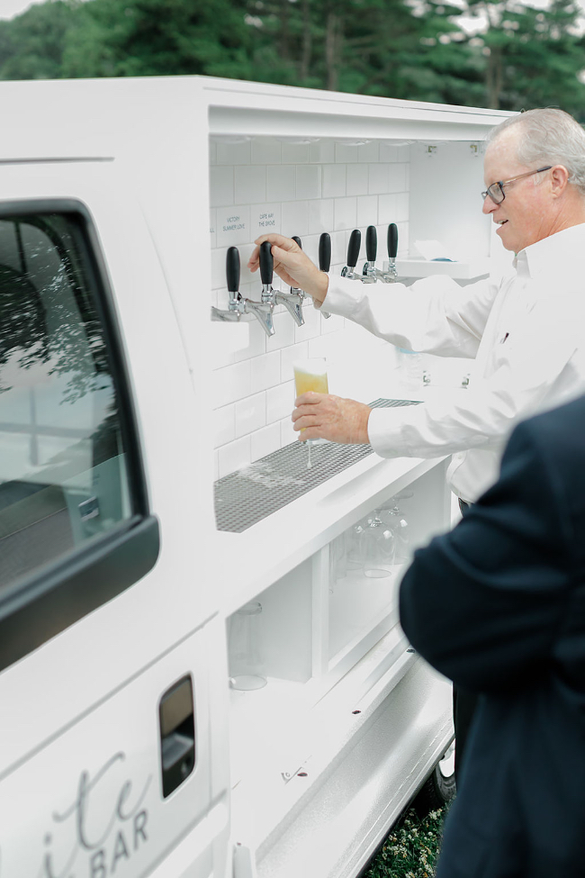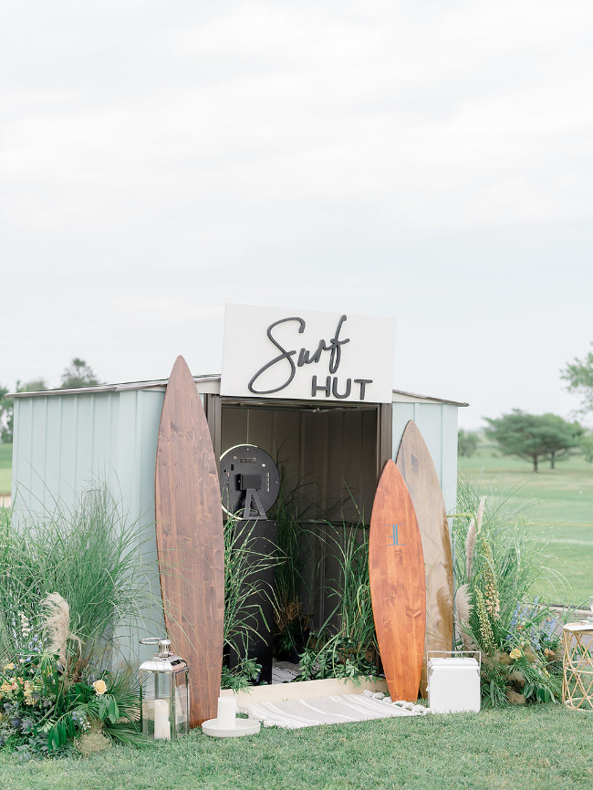 The reception celebration was jaw-dropping! Dinner tables were adorned with florals and candles. A “surf hut” served as the photo booth, courtesy of planner Fete Urbane. “Oystertainers” from Red Oyster walked around and greeted guests with fresh seafood. The team of vendors created an outdoor dance floor under string lights and boho basket chandeliers. Emily & Evan’s love for the shore was highlighted in the table name cards (which were all waterways), oyster shucking during cocktail hour, ice cream man as entertainment, lobster as a meal choice, and saltwater taffy souvenirs!