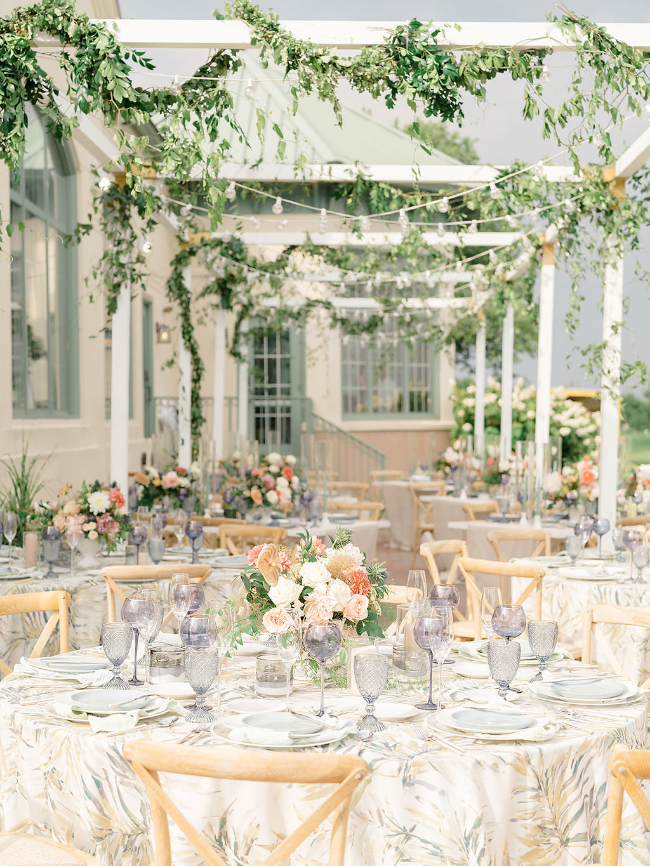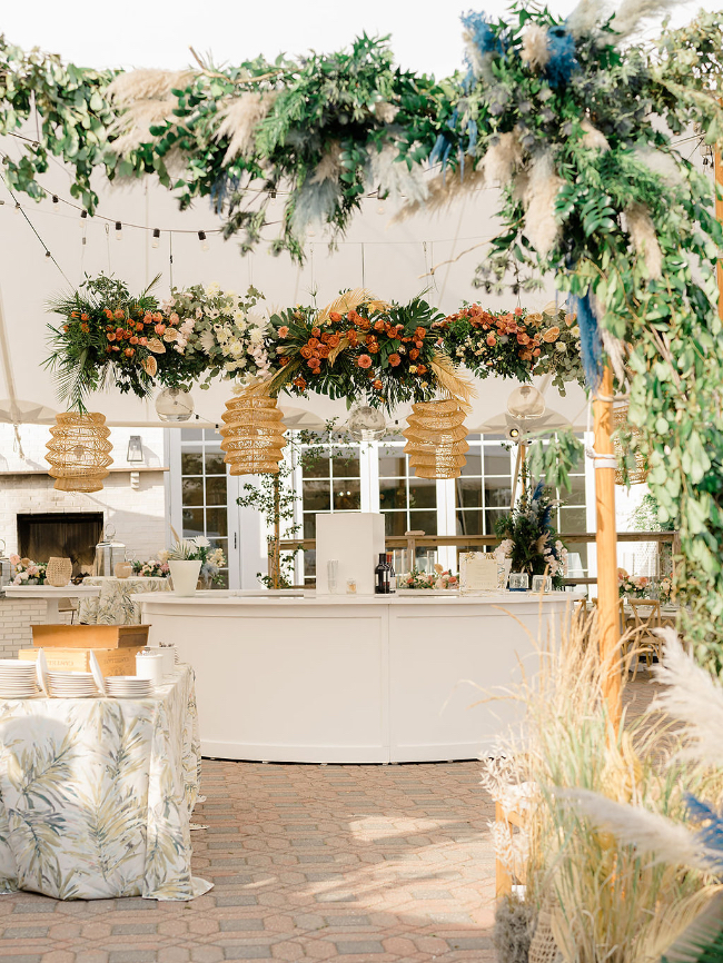 The only thing missing from this coastal wedding is the sand! The pairing of flowers and palms, along with a spectacular color palette leaves us speechless. It is the feeling of the ocean and sand without requiring any of the messier parts…elegance only around here! The ceremony arch is something out of our Hawaiian island dreams. These vendors put on a show, and we are here to watch the whole thing.