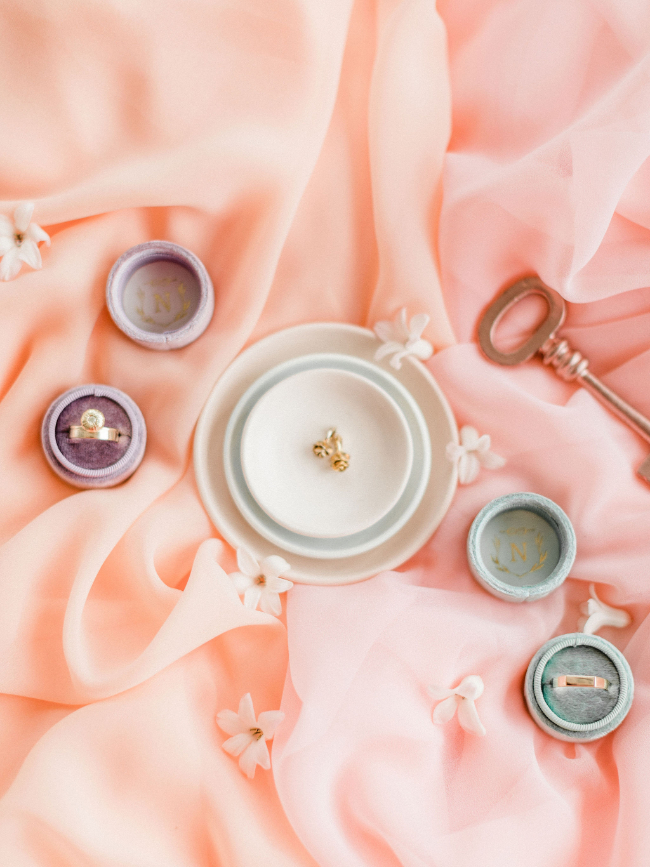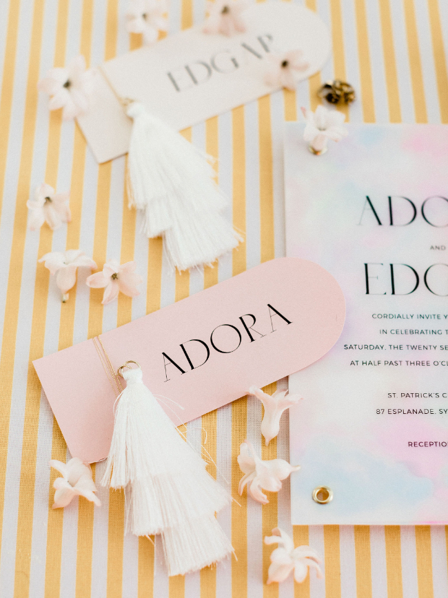 Rebecca from Paper Chain Stationary crafted the wedding suite stationary using playful watercolor-esque tones to pay homage to the pastel ice cream color palette found in the drapery and fabrics. Lost in the fabric and lost in love …a dreamsicle delight!
