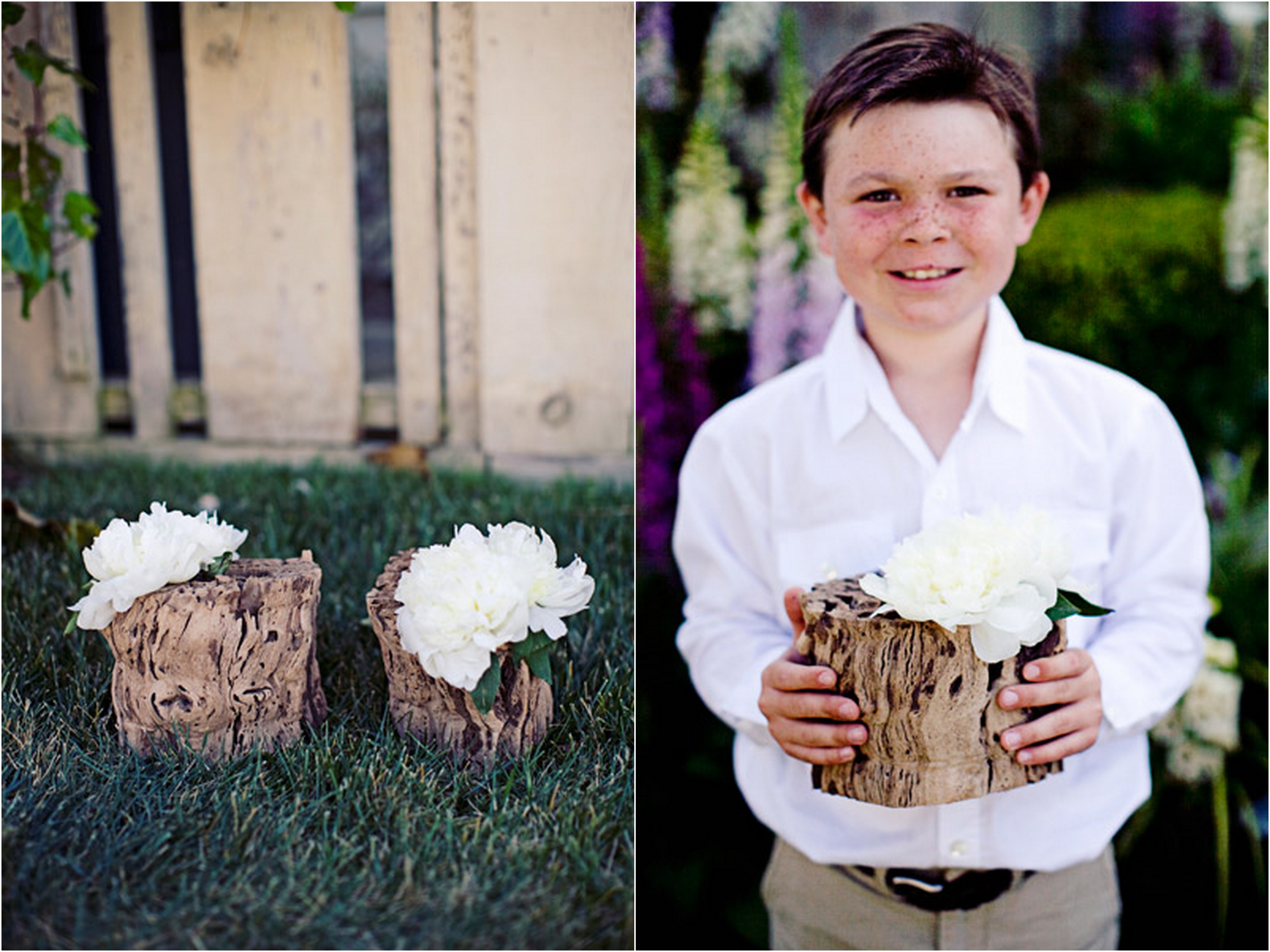 Ring bearers held a grapewood log accented with white peonies in lieu of a standard pillow