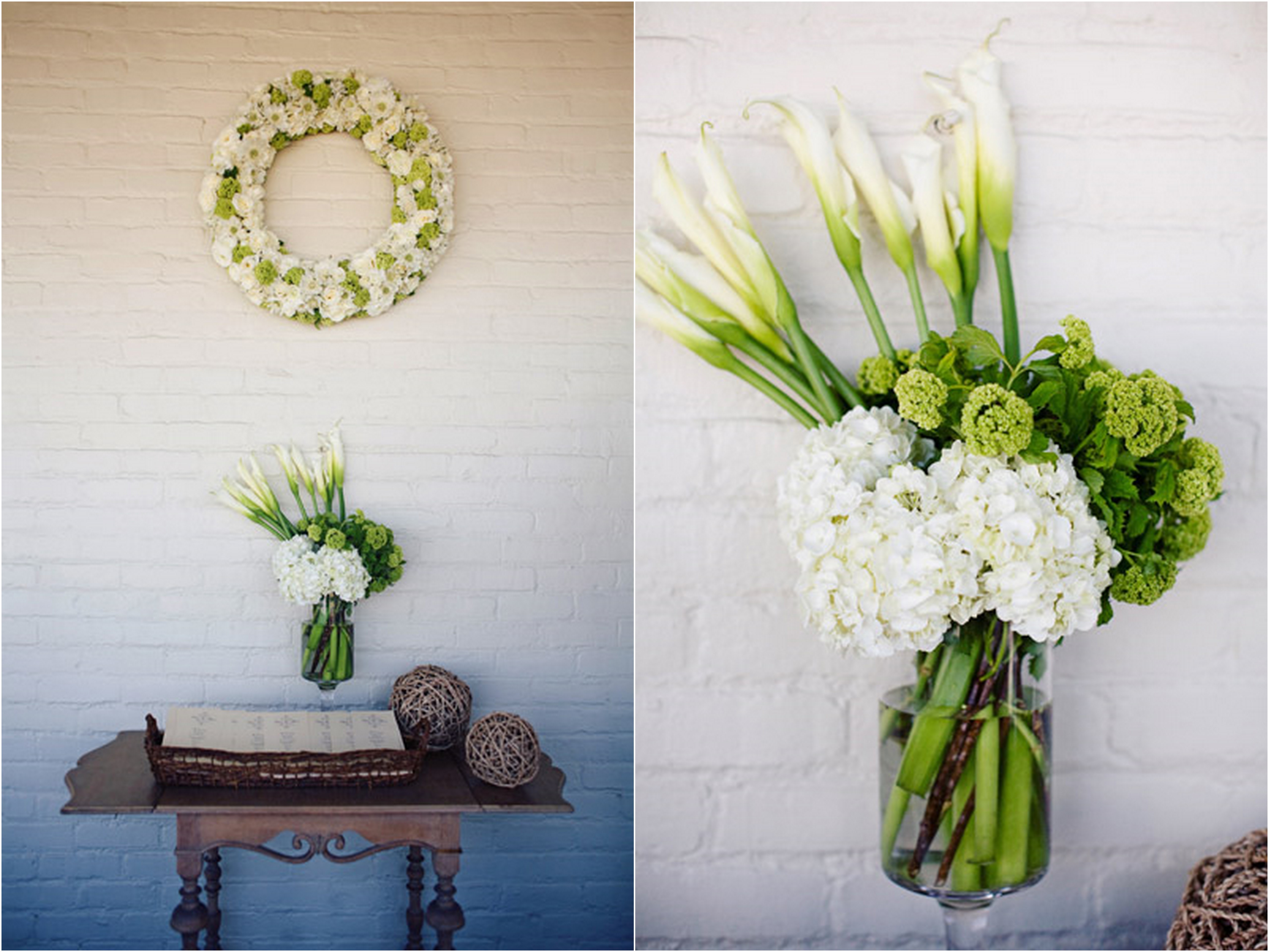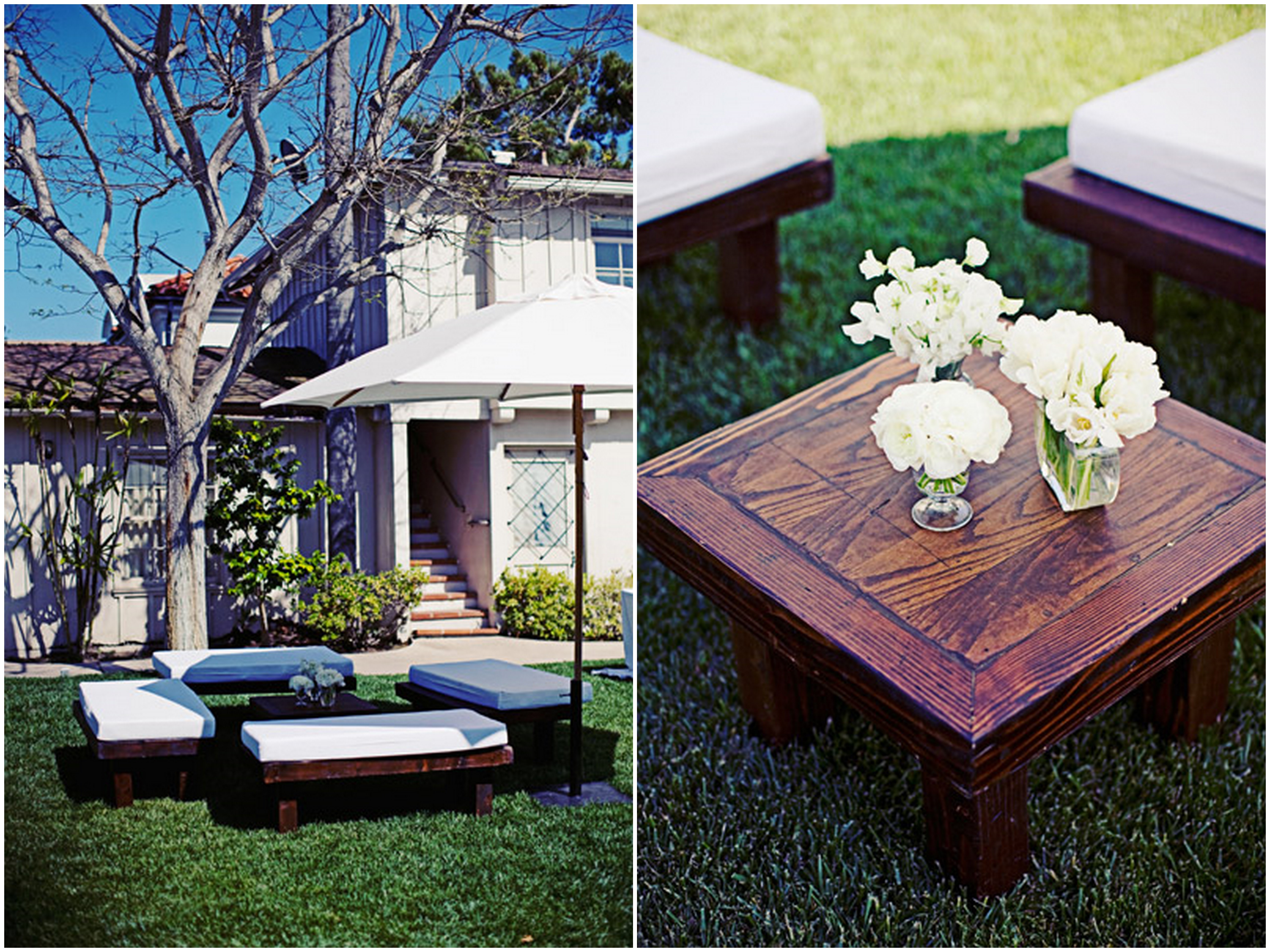 The cocktail hour was made up of wood lounge furniture and all white florals in glass footed vases, double tulips, ranunculas and sweet peas