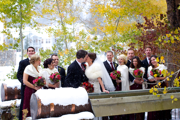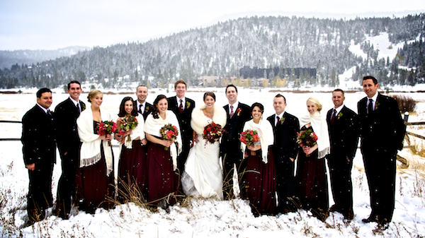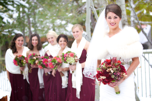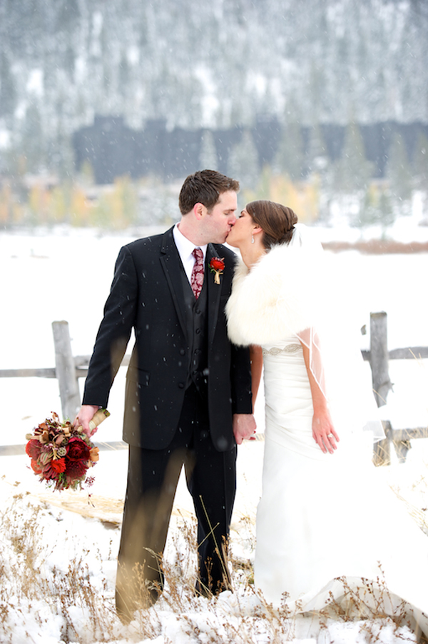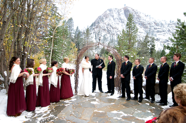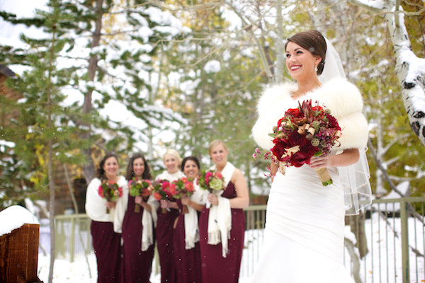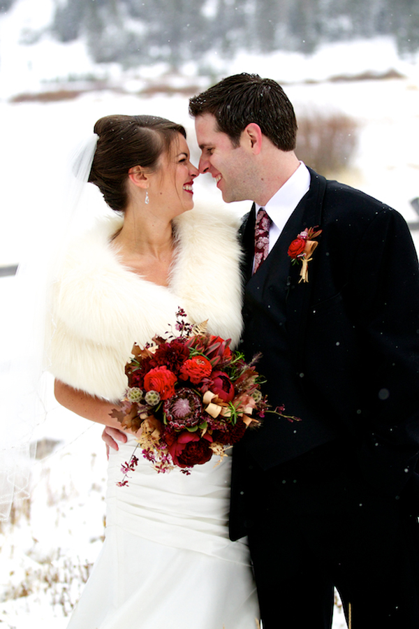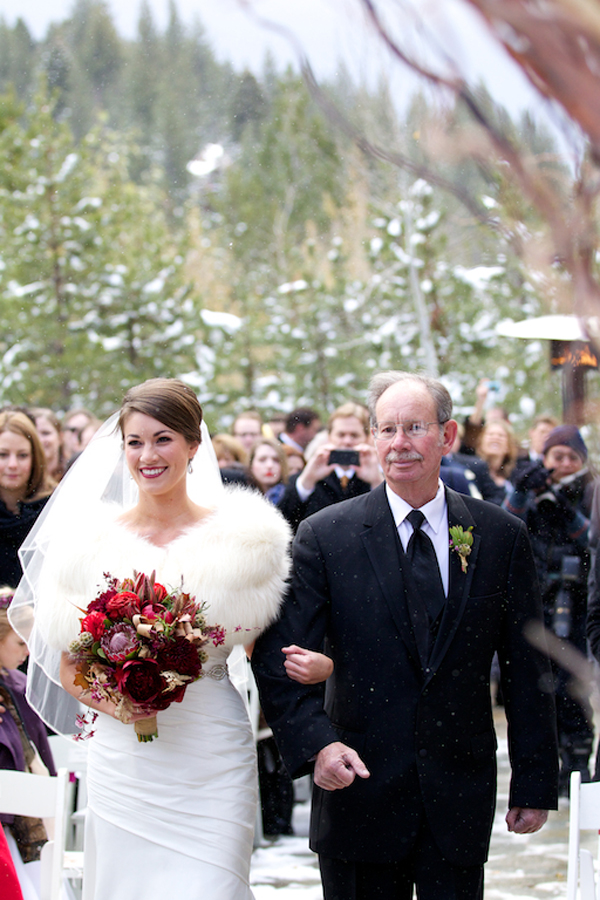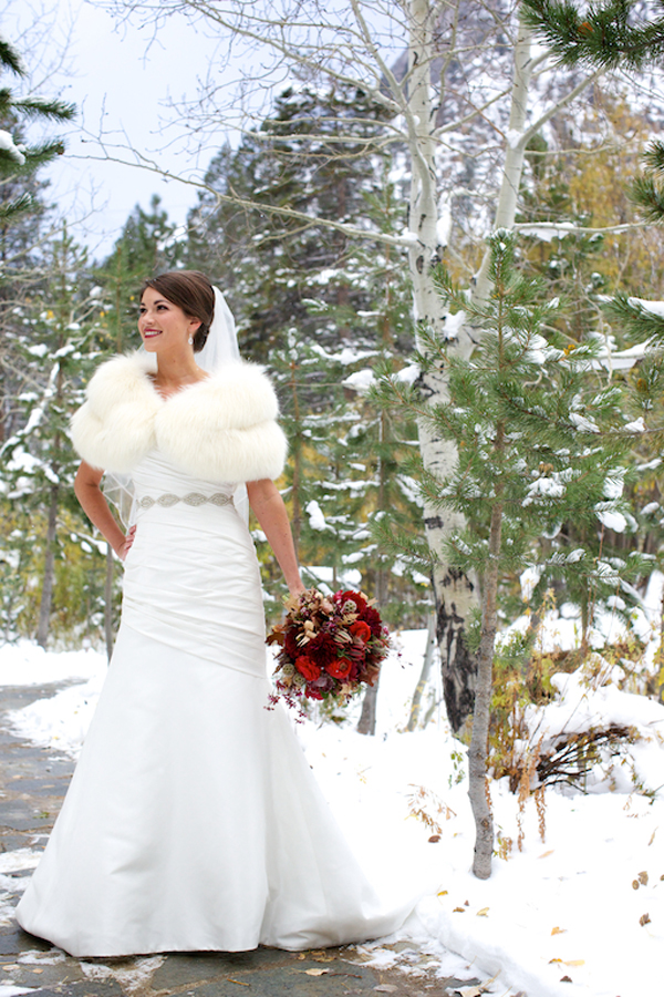 Today’s wedding is extra special to me because it is my sorority sister Ava’s! Ava went to the University of Oregon (Go Ducks!) where she pledged Delta Gamma and when she moved down to Los Angeles we became friends through our LA Delta Gamma Alumni group. She decided that she wanted to get married to her now husband, Chip, up in Lake Tahoe in a gorgeous snowy, winter wedding! I’m absolutely obsessed with her amazing white faux fur bolero and her flowers are the perfect pop of color! There’s something so classic about the contrast of crisp white snow and earthy warm tones of maroons, browns, golds, ivories, and burgundies. Her bouquet is full of some of my favorites too, scabiosa pods, succulents, and rustic red peonies…the perfect combination for a winter wedding! The whole thing makes me want to sit next to a fireplace and toast the happy couple with a steaming cup of hot chocolate or better yet, mulled wine :- )