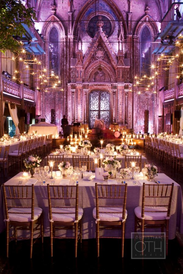 - To create a warm, glowing atmosphere in your reception space avoid lighting with too much color such as pink, blue, purple, etc.. and stick to a range of clean, warm white tones as we did here. When a space is very busy like this one I always prefer highlighting the architecture and the decor with clean white light. Remember white light can be ambient and romantic when you add a bit of warmth to the white tones. Imagine you are trying to light your entire space with candlelight… that’s the color and tone you want to aim for!
