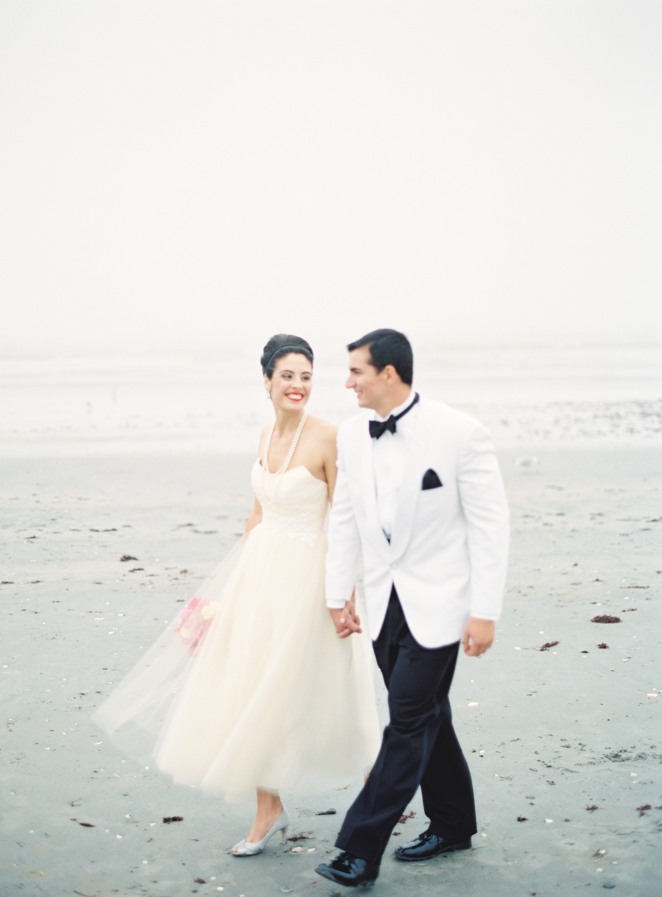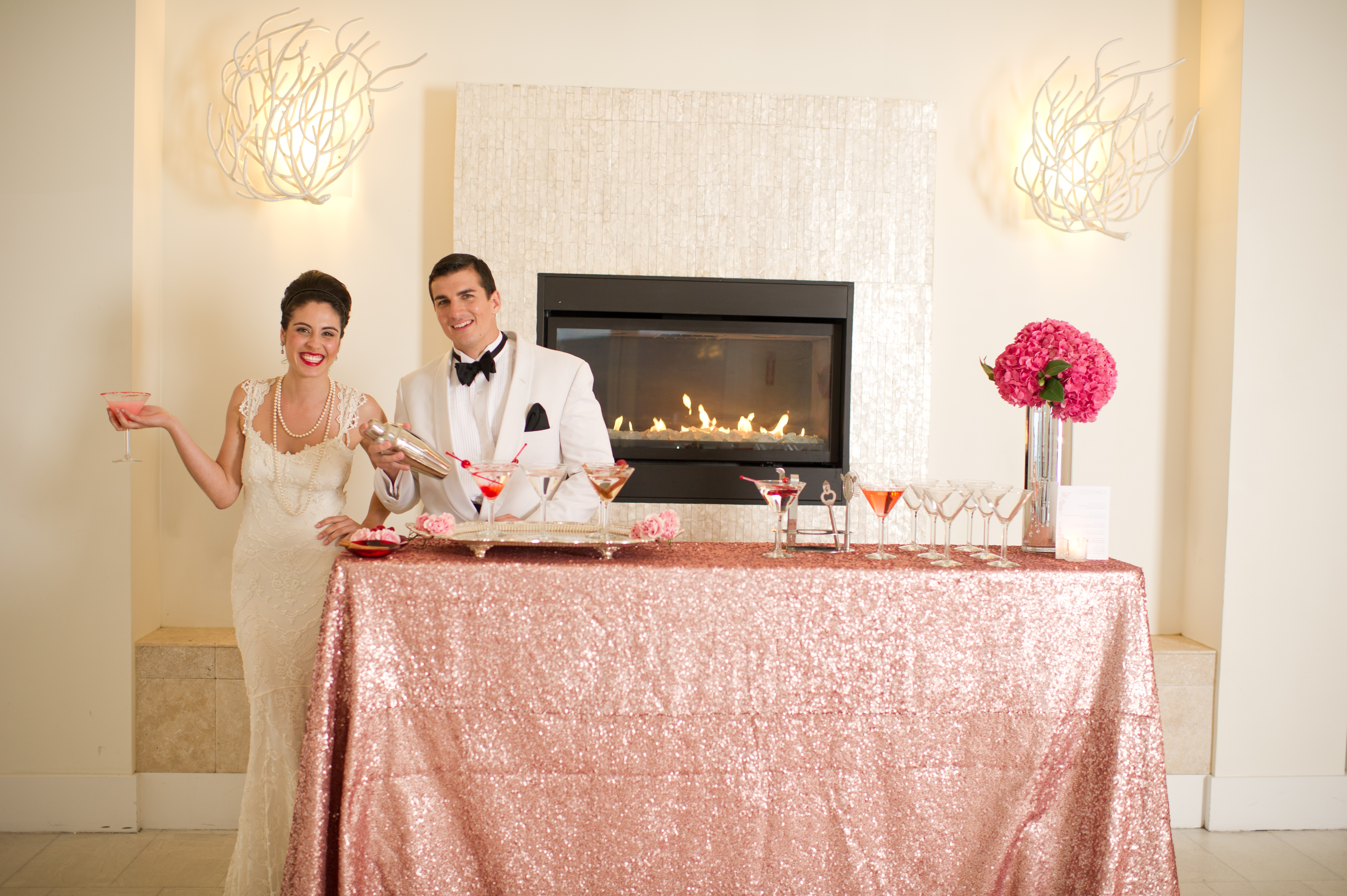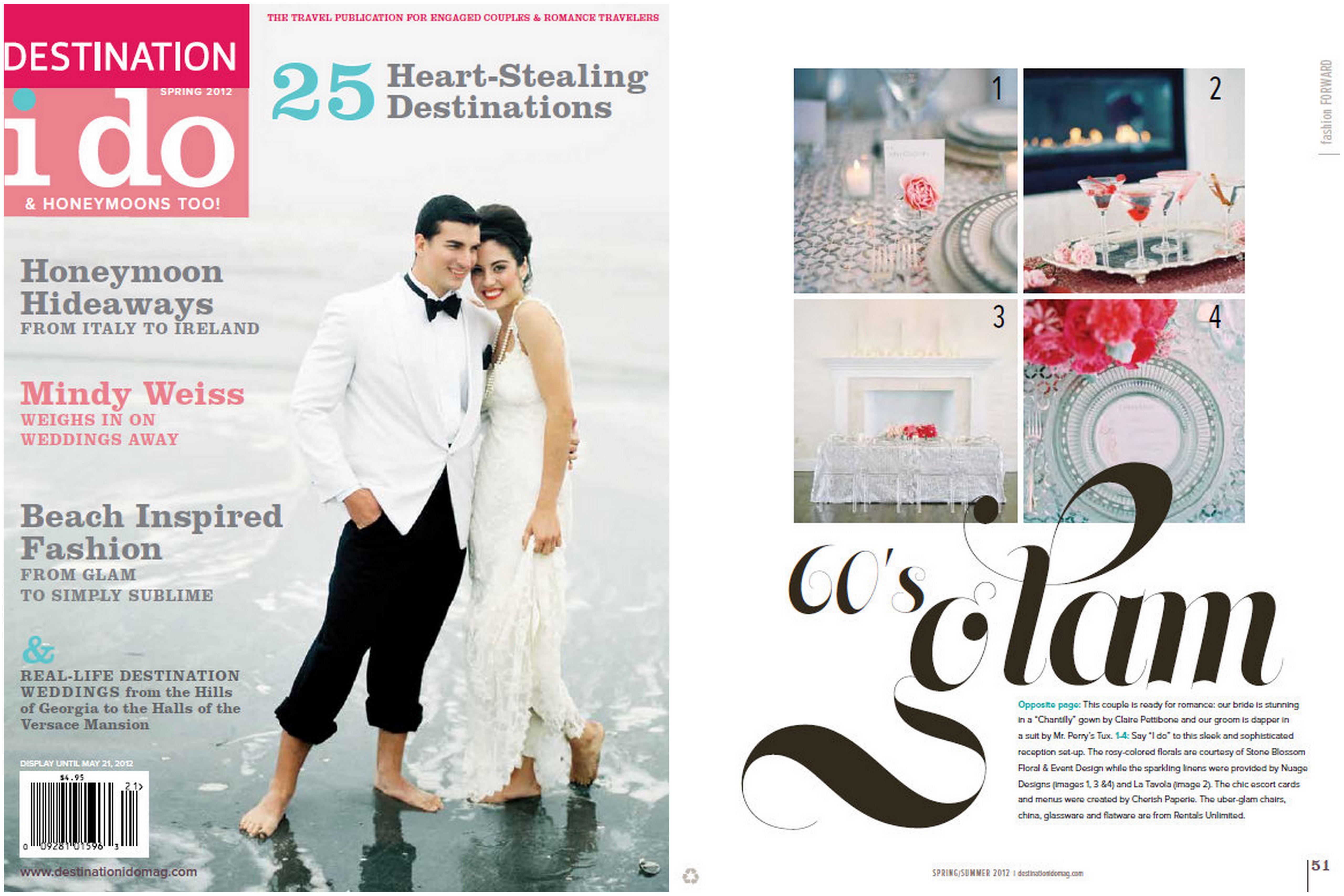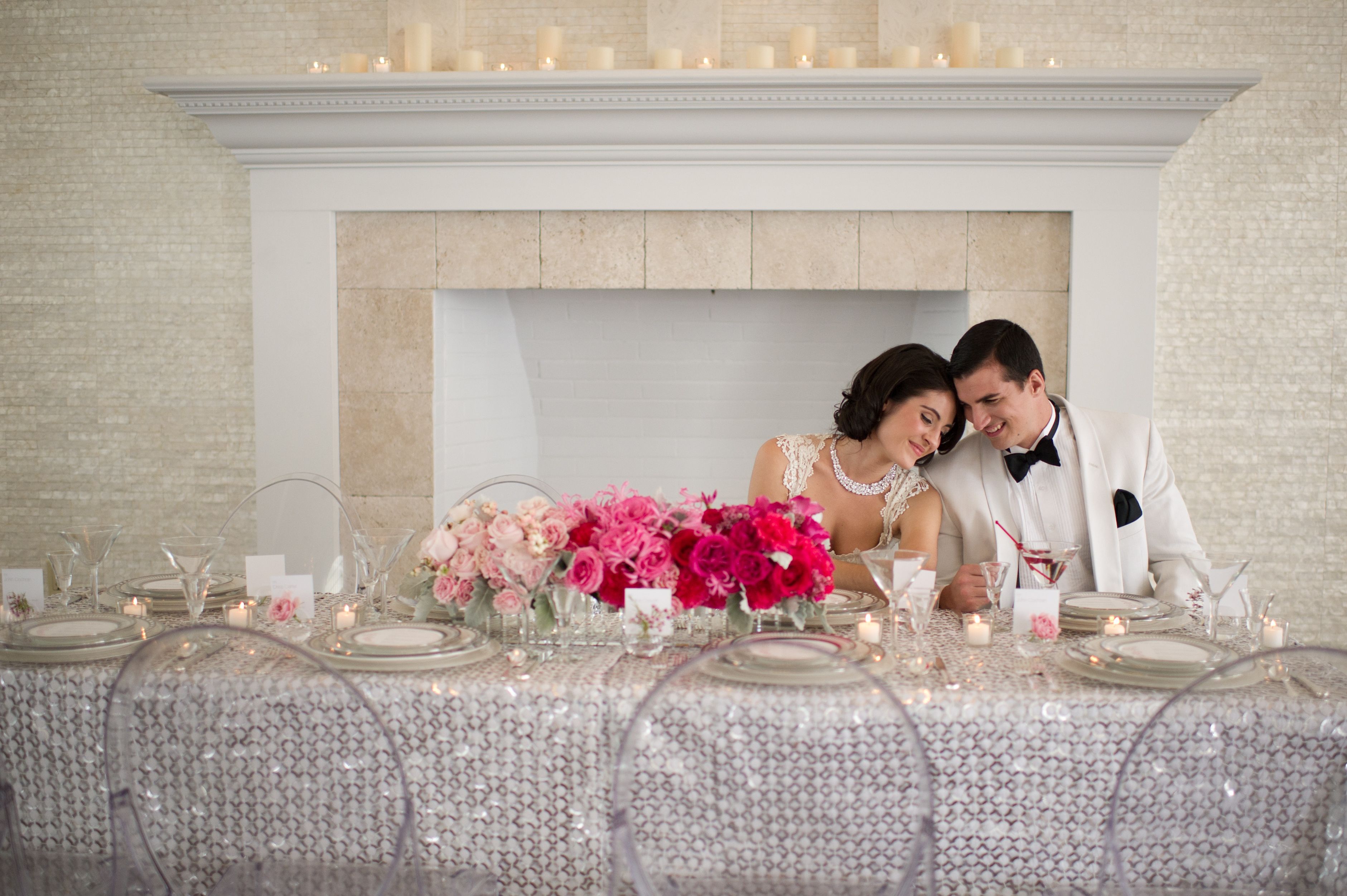 I adore beach weddings and this mod Destination I Do wedding shoot is no exception with its amazing beach wedding style! The images do a perfect job of showcasing the playful dynamic between the couple and Desiree Spinner planned and designed the shoot flawlessly! How gorgeous is the bride’s lace dress? And the details on the back of it are to die for! I love that she incorporates two dresses into the wedding day with that cute shorter, vintage dress on the beach! It’s a great solution if you’re having trouble choosing between a semi-formal, vintage dress and a more formal gown. Keeping with the 60’s glam, the circular motif shines through from the table linens and ghost chairs, to the gorgeous pink and silver cake. The ombre centerpieces and bouquets are such a stunning touch and I love the stationery by Cherish Paperie as well! Oh, and who doesn’t love a dapper James Bond style groom drinking a martini? This couple was so stylish and adorable that Destination I Do magazine even decided to use it for their cover shot on the newest issue!
