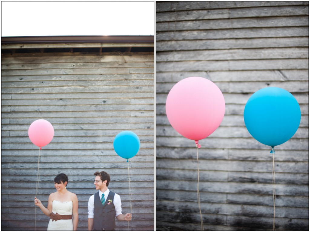 Kristen and Loren are such a cute and creative couple and we are so excited to feature their wedding! Cramer Photography sent this over to us and we love the fun atmosphere and the style that the bride and groom created for their big day. Balloons, vibrant florals and flags, this fuchsia and turquoise Virginia barnyard wedding has it all! I love the mix and match aqua ties the groomsmen wore, and the different fuchsia dresses donned by the bridesmaids. The belt worn by the bride is so funky and inspiring, I love the brown leather with the soft wedding dress! Here’s what the photographers had to say about the big day: