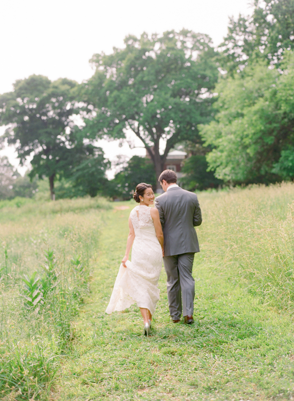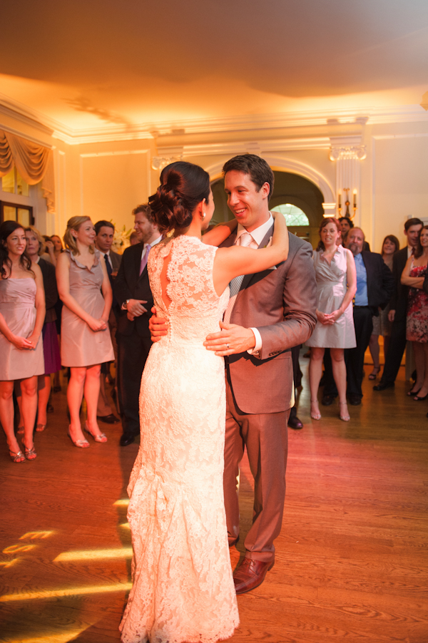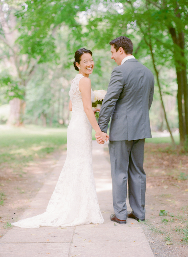 Her lace dress, all white bouquet, and his classic grey suit all just scream elegance!