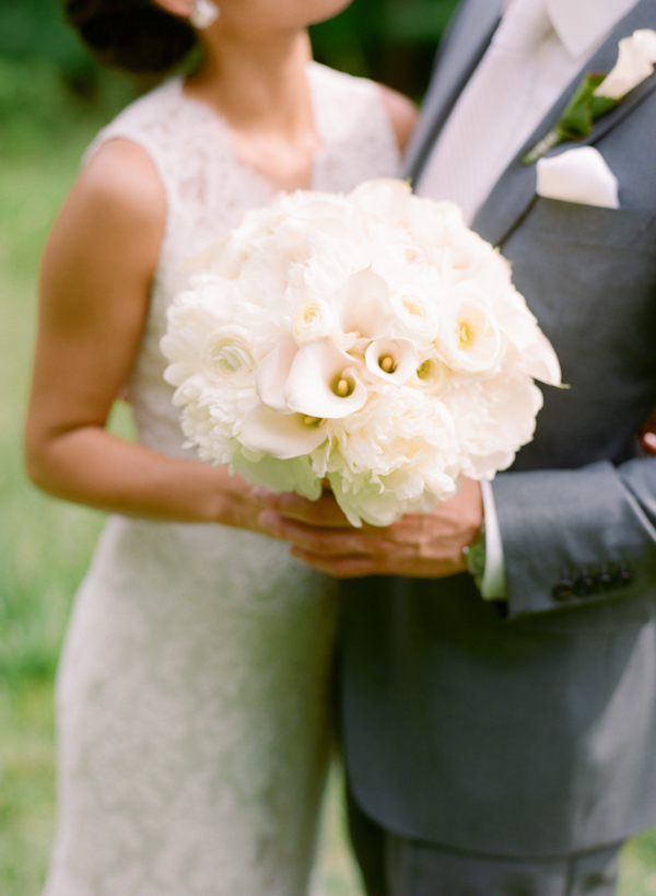 This mixed white bouquet of callalilies, dahlias, ranunculus, and peonies has us swooning!