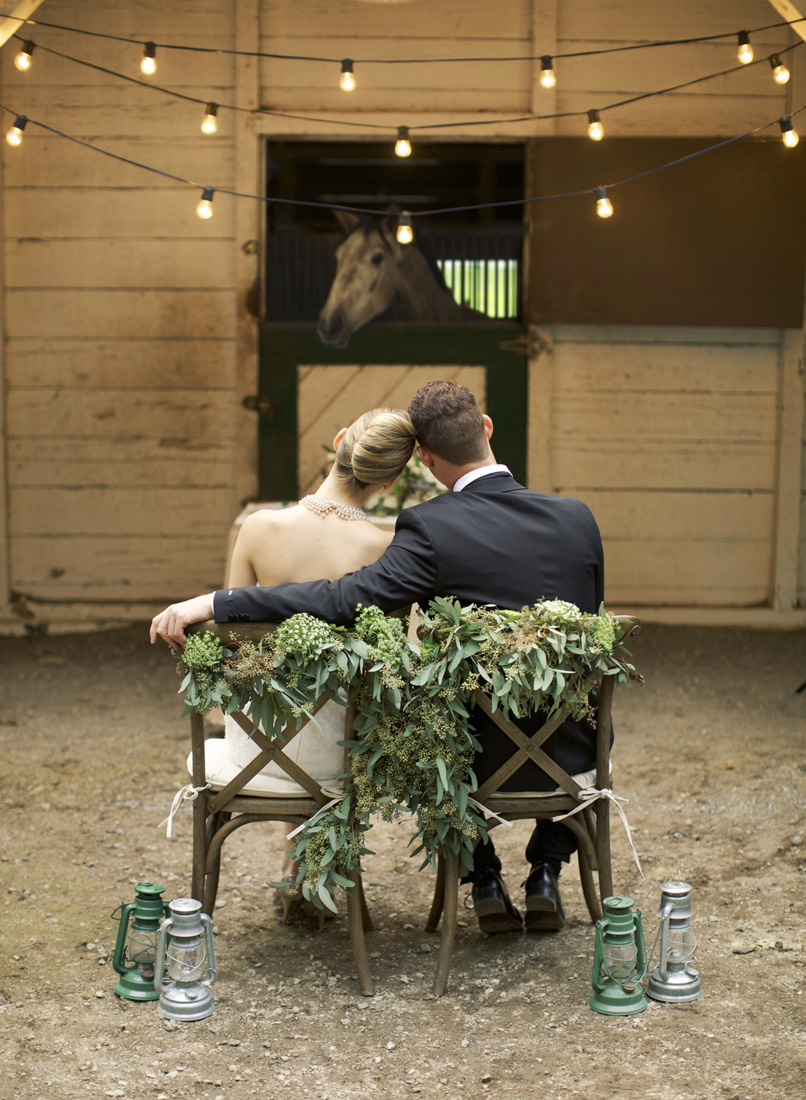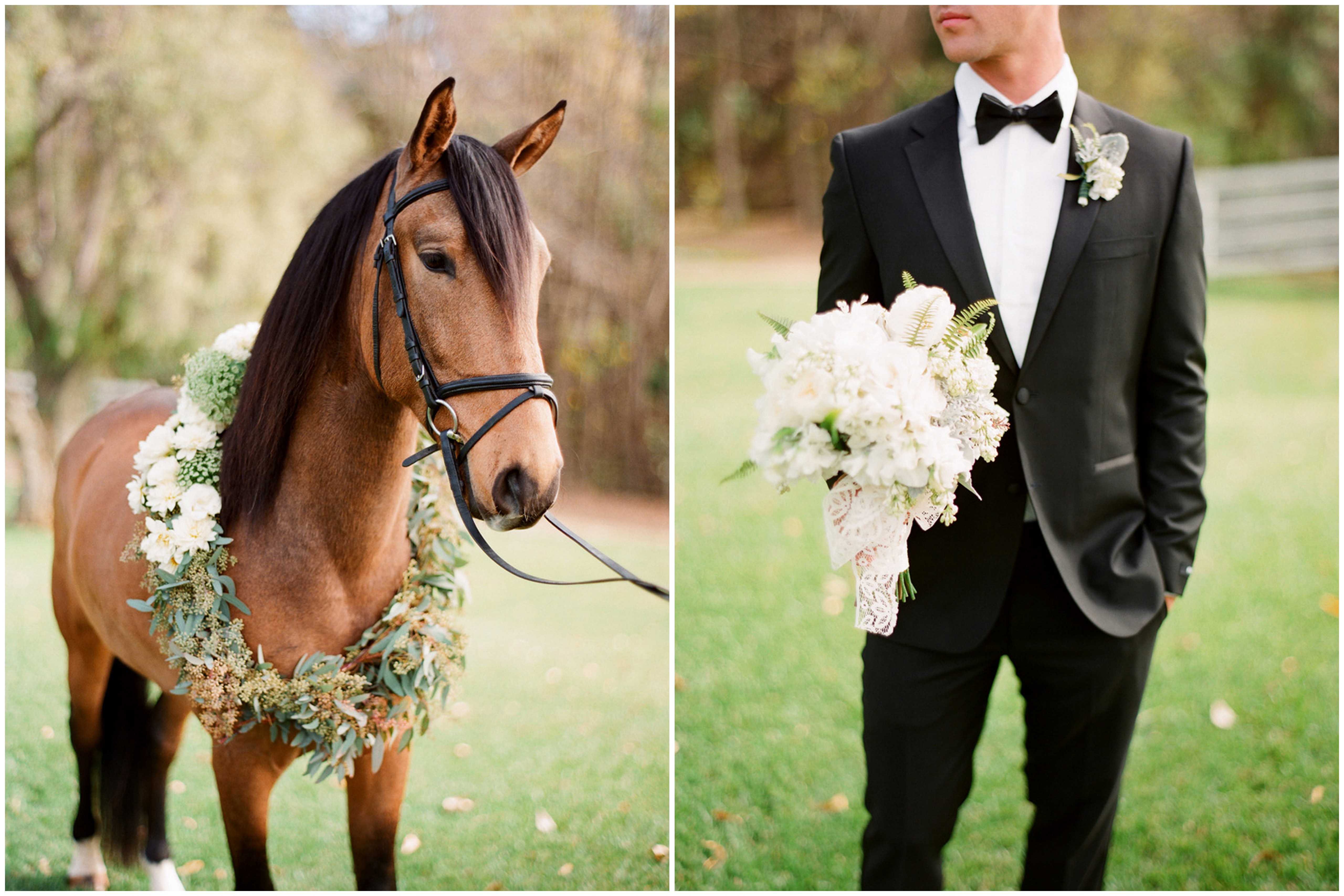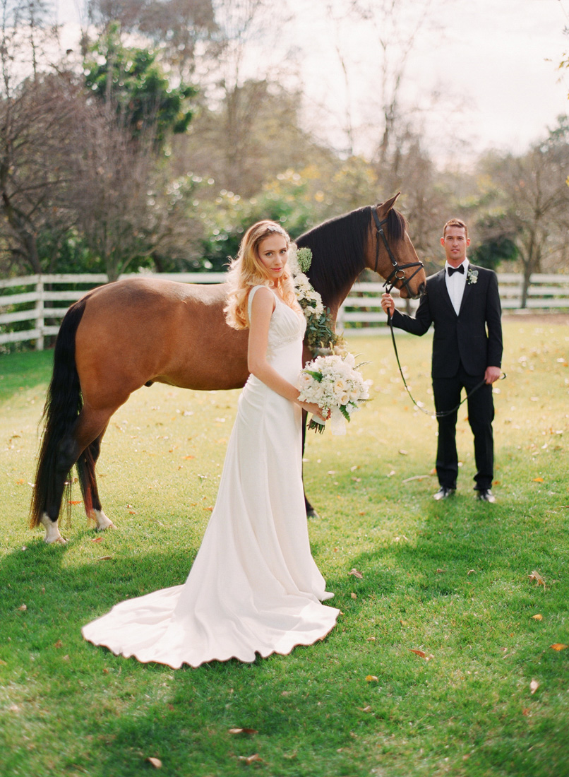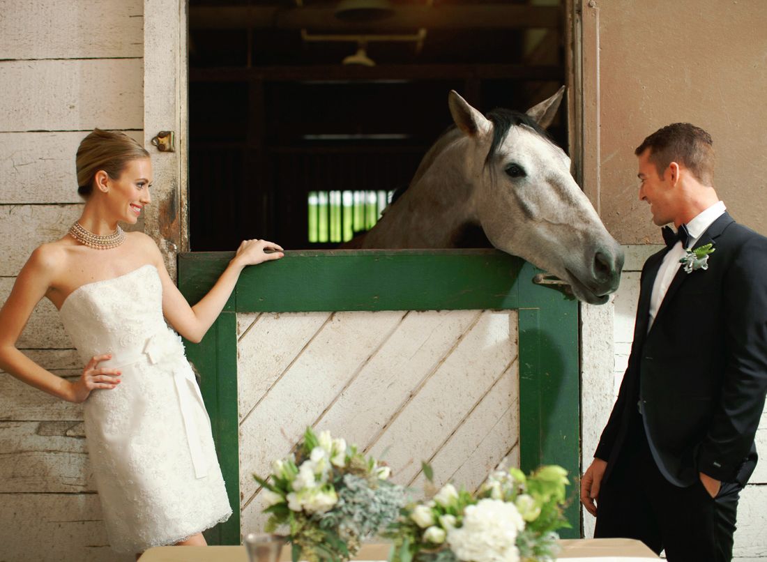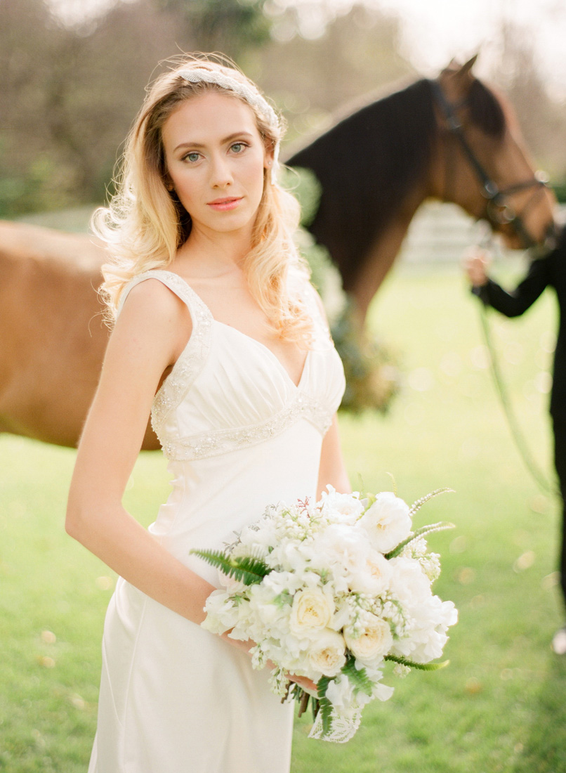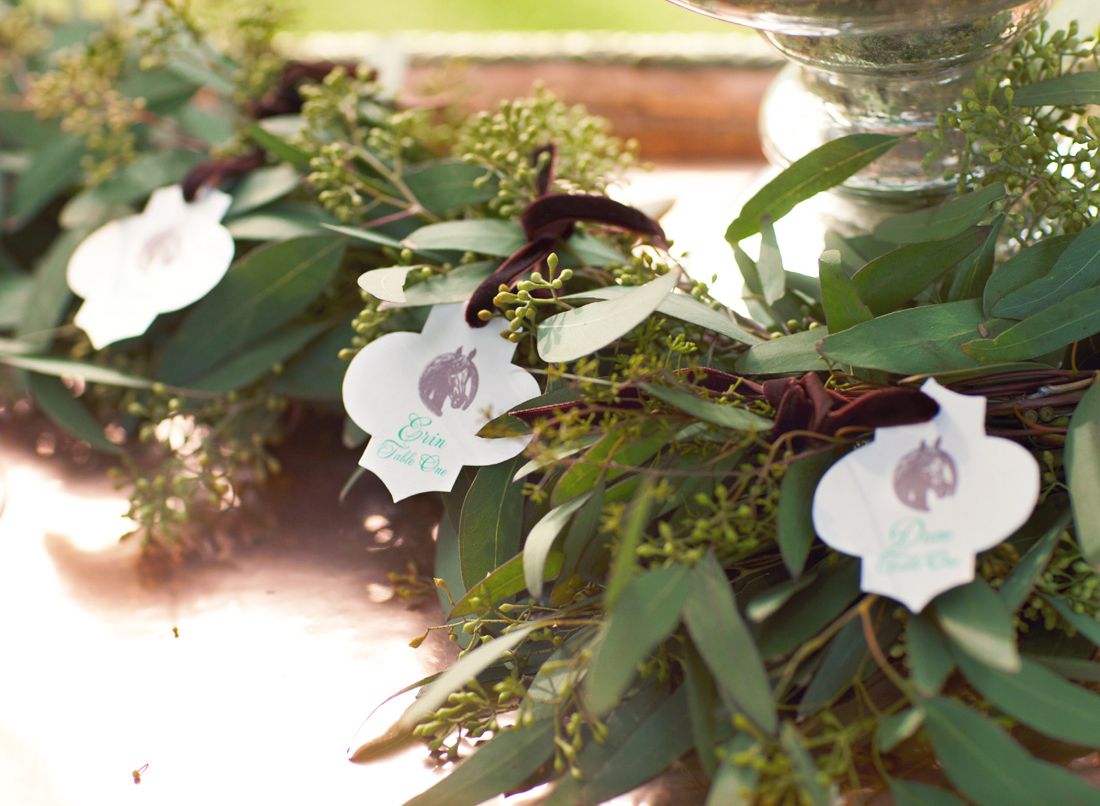 There is so much inspiration in this gorgeous equestrian garden wedding shoot that was featured in Utterly Engaged! Natural flowers combined with equestrian elements celebrate the surrounding earthy, green landscape. The rustic tablescape blends masculine elements of deep wood and clean lines with elegant flowing drapery and romantic candelabras. We love the flowers designed by Oak and the Owl, especially the bridal bouquet of garden roses, sweet pea and astilbe. This romantic shoot was planned and designed by Twine Events, who so perfectly created this timeless style. I love the green accents on the stationery, and how creative are the name cards tied into the centerpiece! The Bay horse looks dashing with his green and white wreath, and brings a touch of whimsy to this classic shoot.