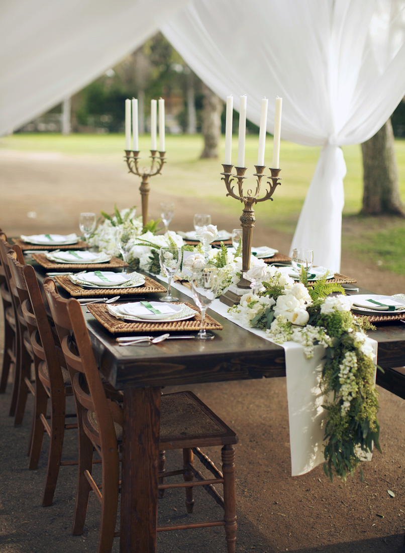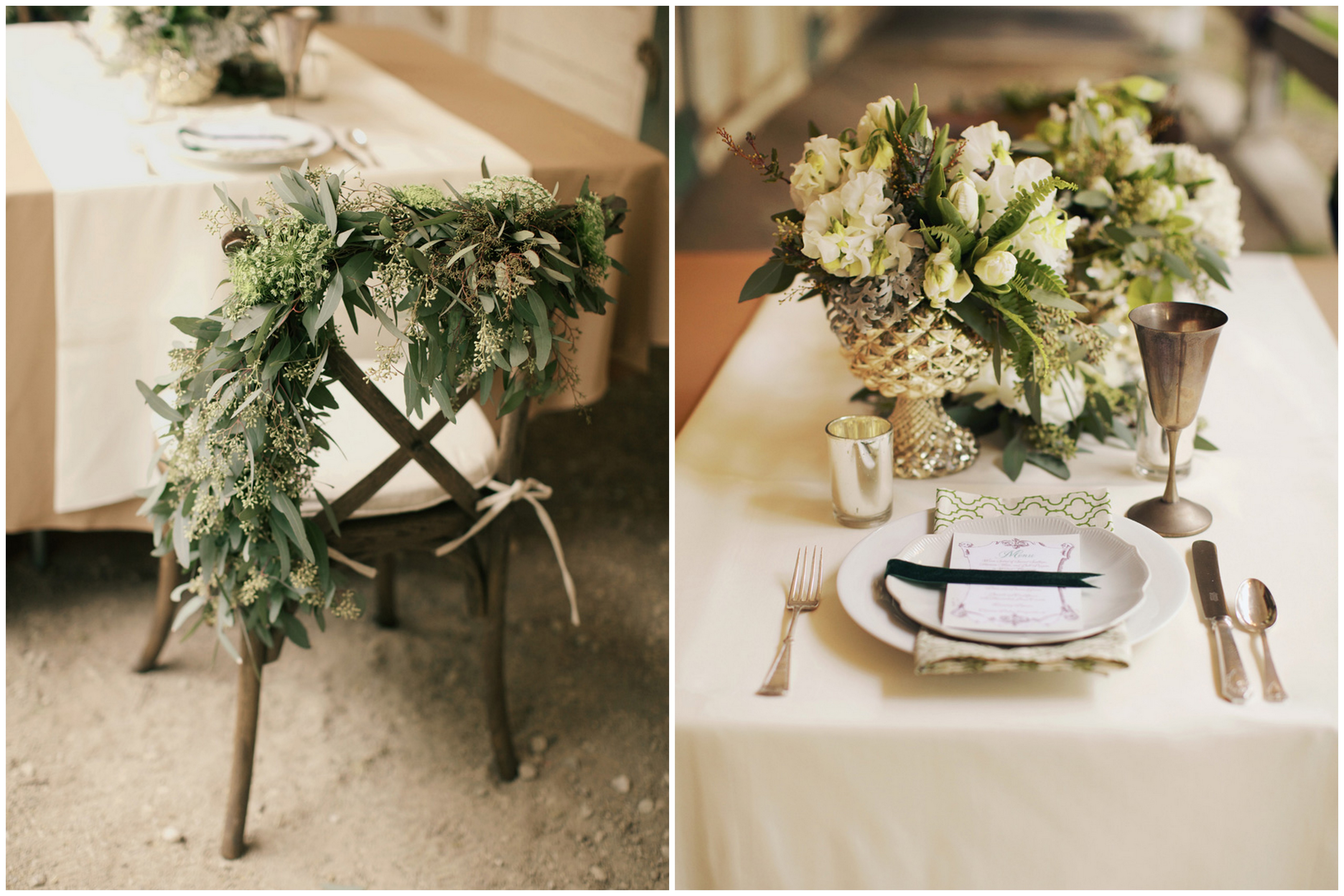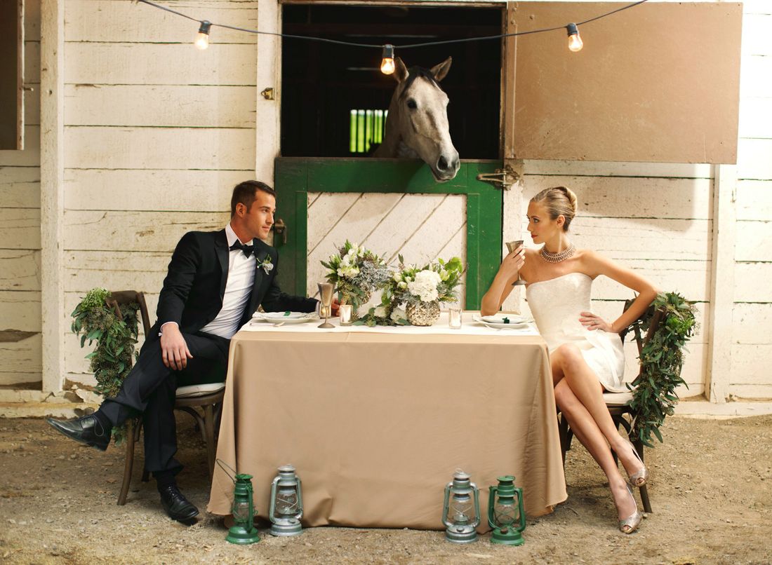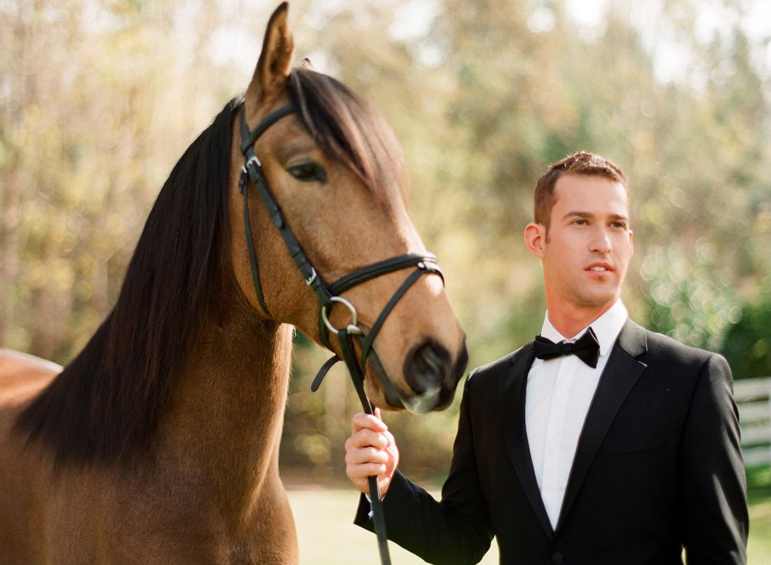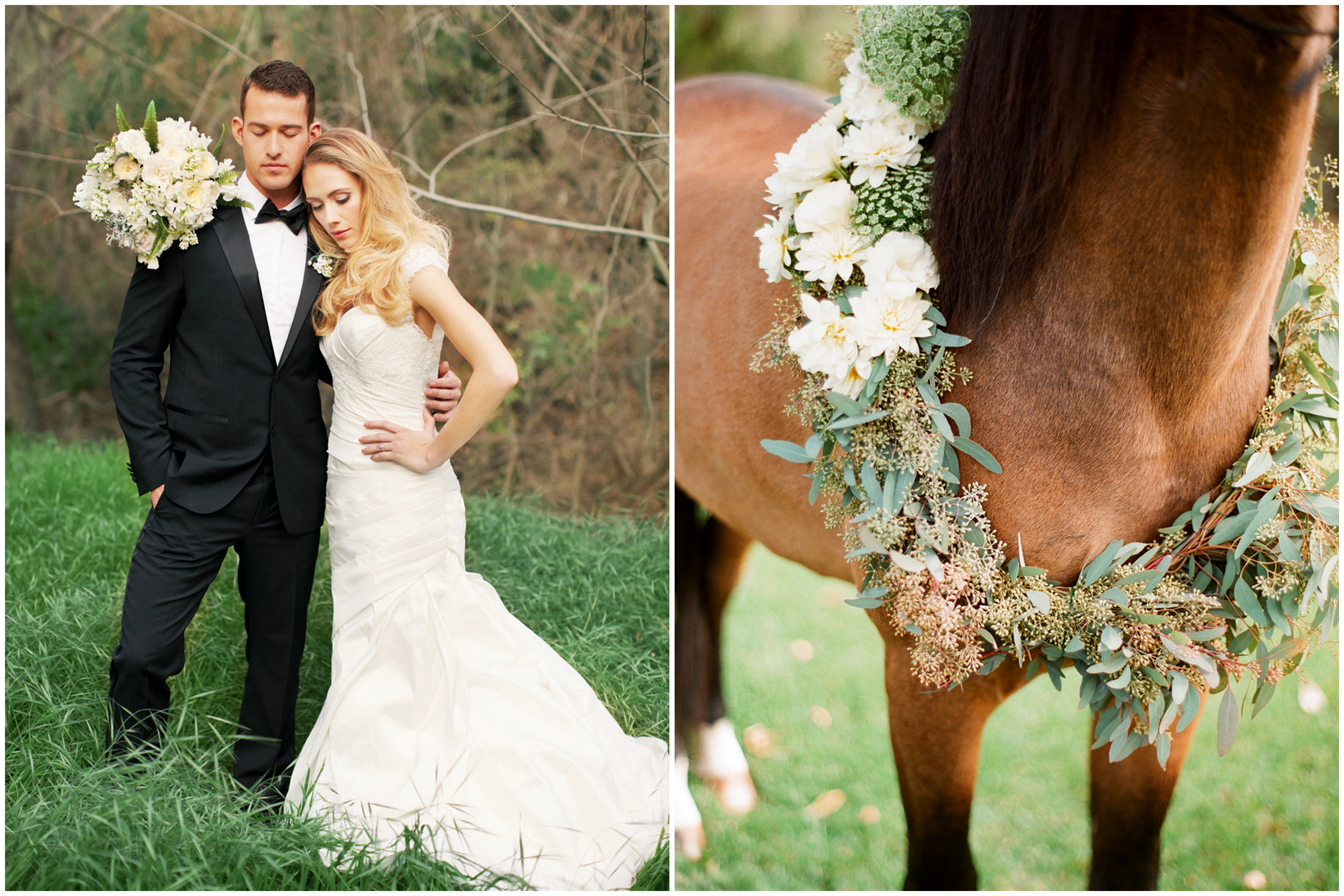 There is so much inspiration in this gorgeous equestrian garden wedding shoot that was featured in Utterly Engaged! Natural flowers combined with equestrian elements celebrate the surrounding earthy, green landscape. The rustic tablescape blends masculine elements of deep wood and clean lines with elegant flowing drapery and romantic candelabras. We love the flowers designed by Oak and the Owl, especially the bridal bouquet of garden roses, sweet pea and astilbe. This romantic shoot was planned and designed by Twine Events, who so perfectly created this timeless style. I love the green accents on the stationery, and how creative are the name cards tied into the centerpiece! The Bay horse looks dashing with his green and white wreath, and brings a touch of whimsy to this classic shoot.