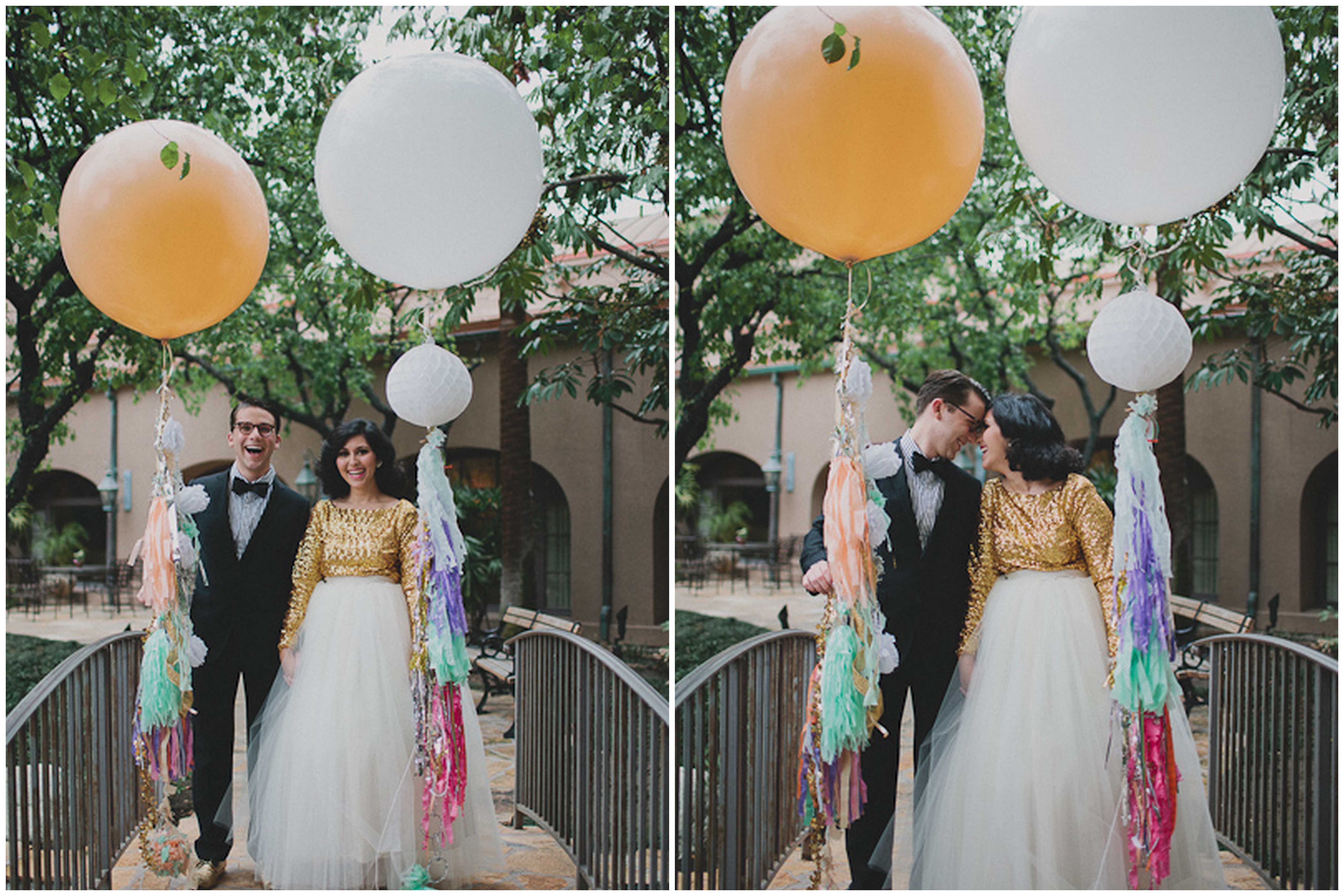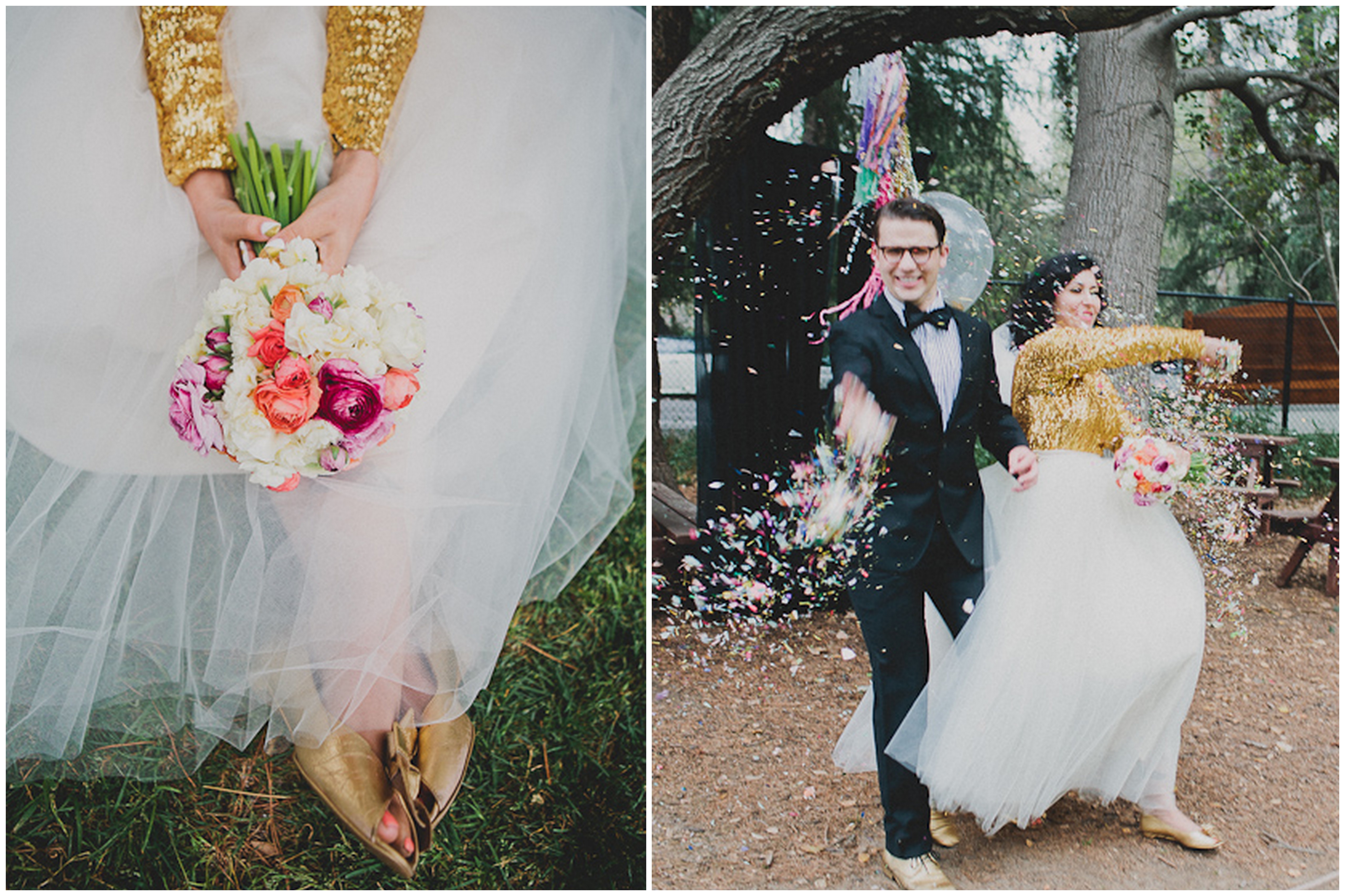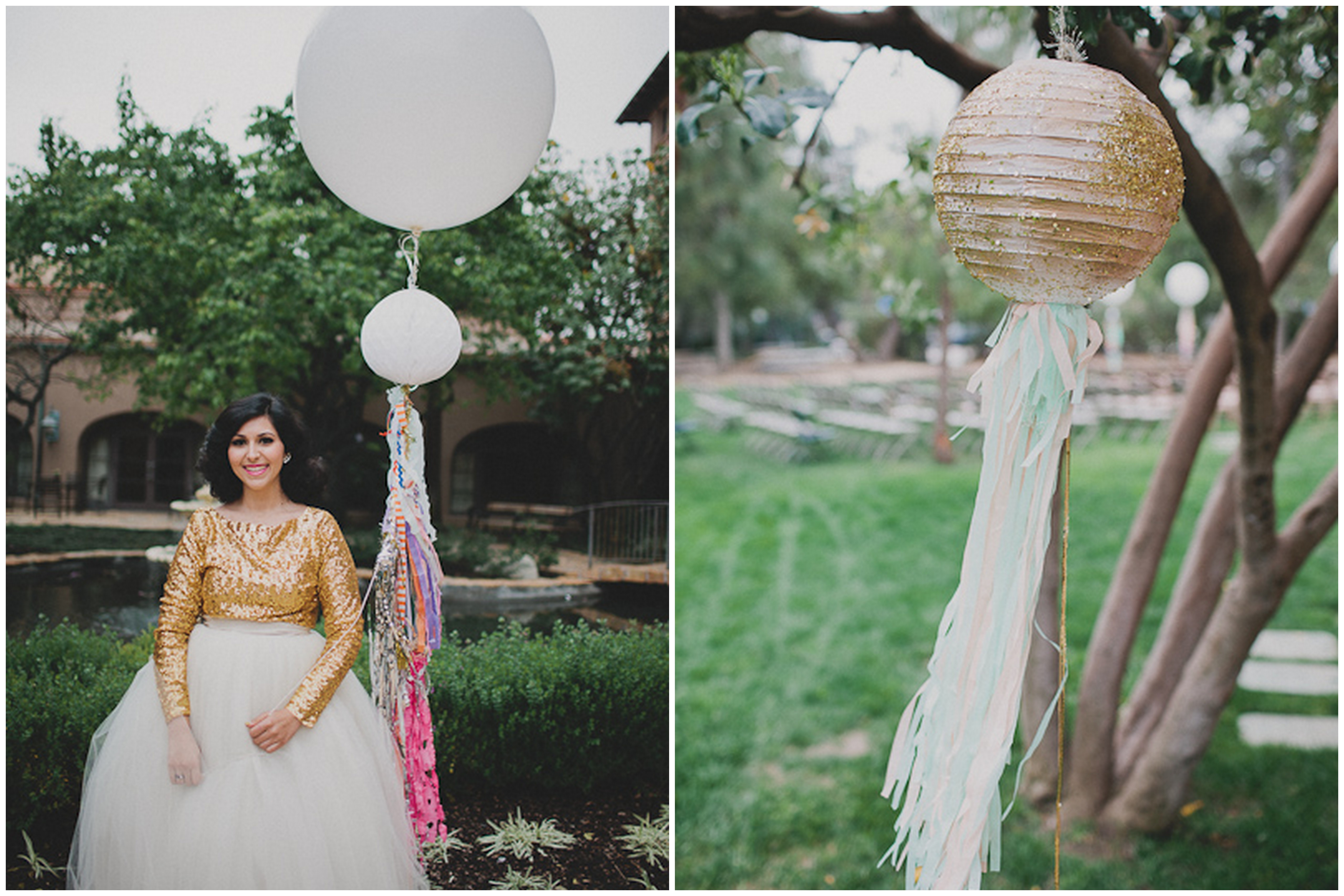 If you love everything non-traditional, this gold metallic confetti filled wedding is for you! I’m blown away by how fabulous this wedding is without the couple having to spend a crazy amount of money. Their only vendors were Cami Jane Photography, the Langham Hotel in Pasadena and Camp Mariposa in Altadena for the reception. Everything else was done with the help of friends and family, which made this day even more special. The bride, Yazz, was super creative, hand-making all the decorations out of paper and creating a stand-out ensemble of a gold sequin top and tutu (and can you die over her half yellow and white nails?!) To make things even more unique, the bridal party carried white and cream balloons that tied into the wedding’s fun decor. Yazz and Soren planned their grand entrance of throwing the gold confetti minutes before they walked into the reception, and the love and joy felt by every guest was infectious. And of course, classic Coke bottles and churros are always a favorite!