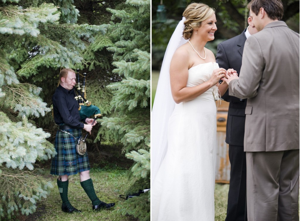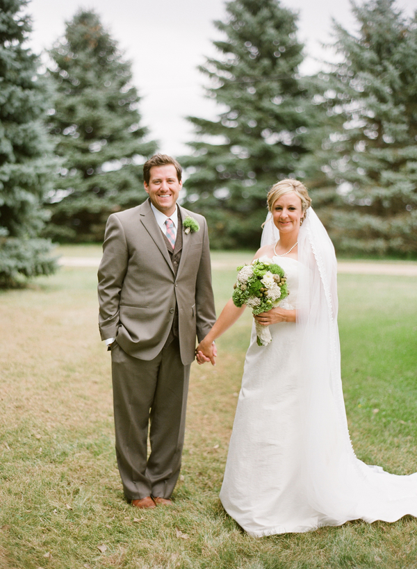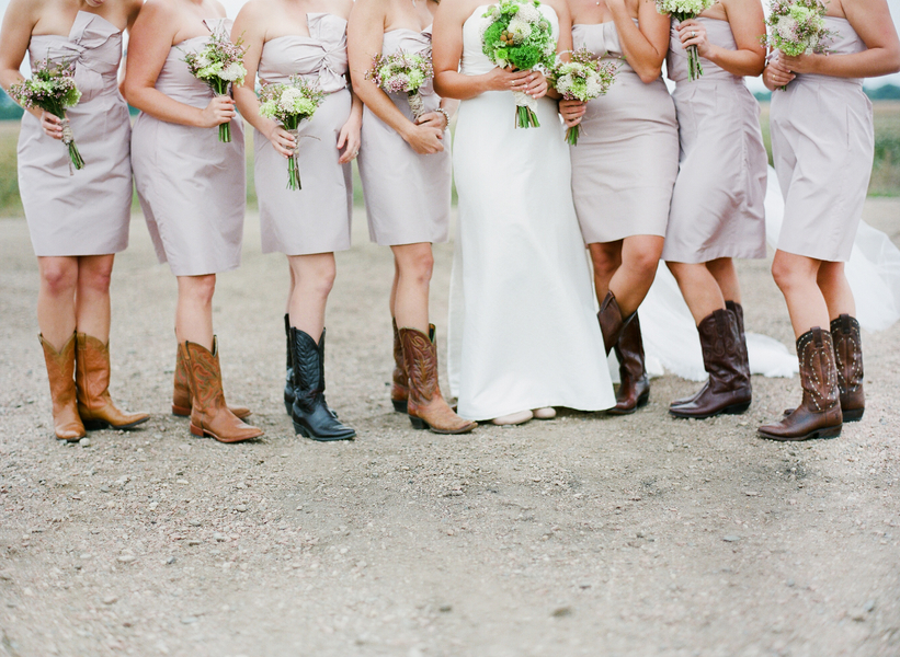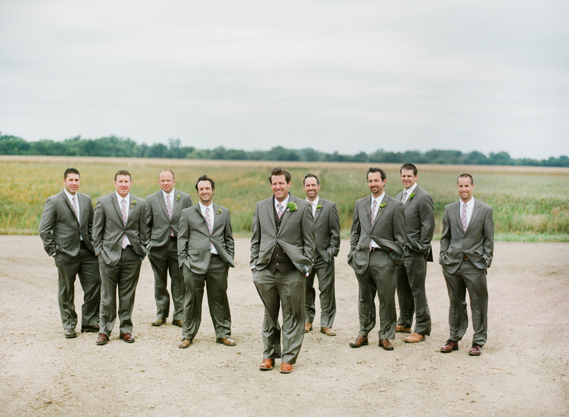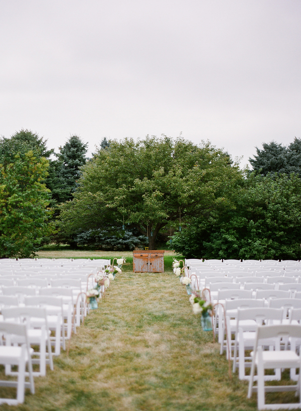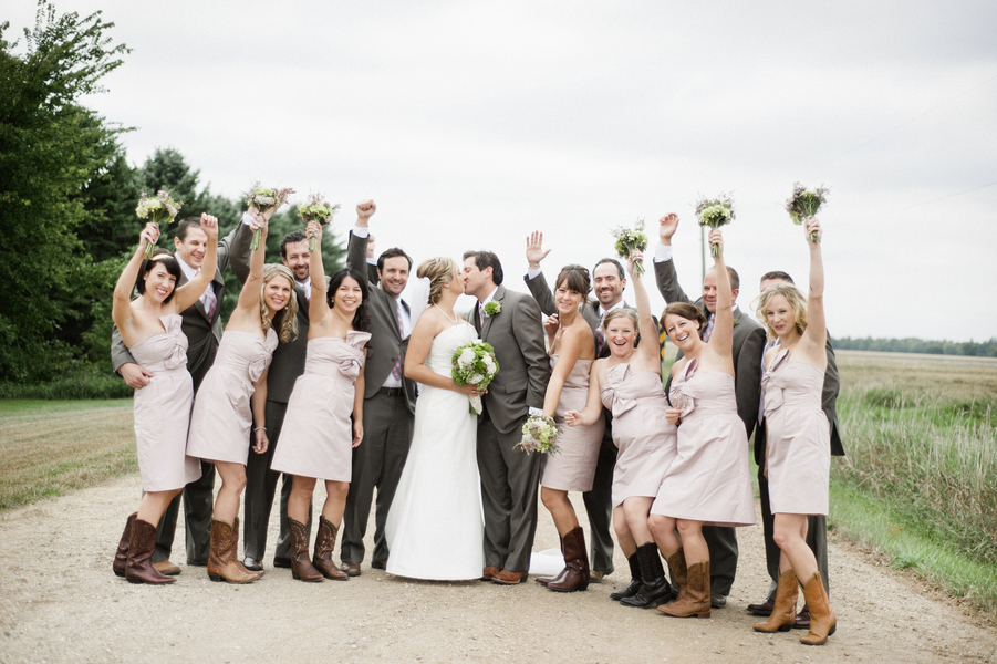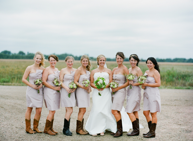 We love this outdoor South Dakota wedding sent to us by Kelli Hunt Photography! The soft pops of pink pairs with the lush green outdoor setting is the perfect balance of sweet and dreamy. I like that the couple brought in subtle vintage details with the bridesmaids in boots, the chalkboard sign, scabiosa pods and the mason jar lanterns! Here is what Kelli Hunt had to say about the details of the day: