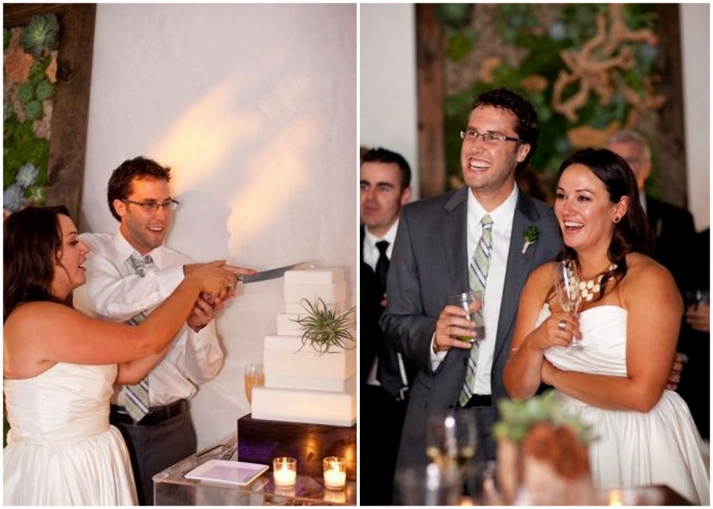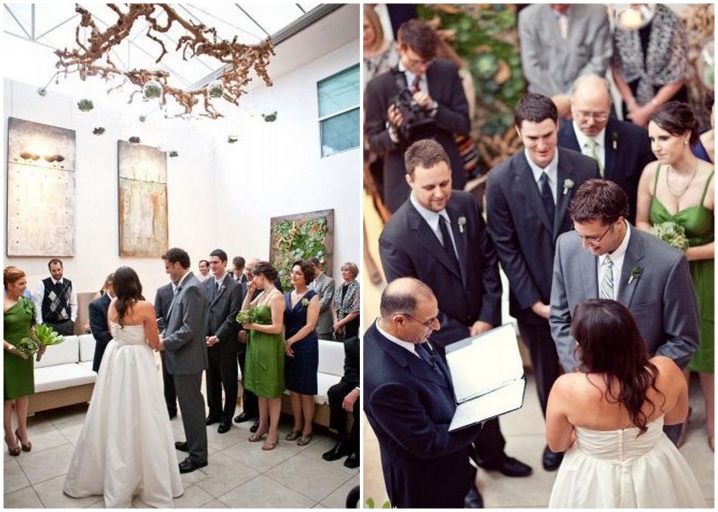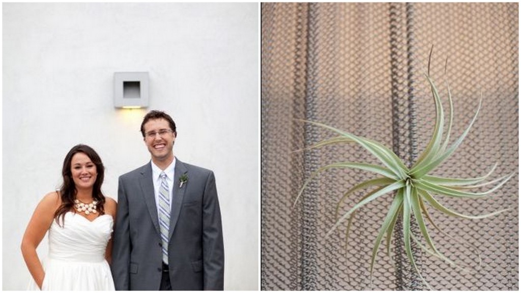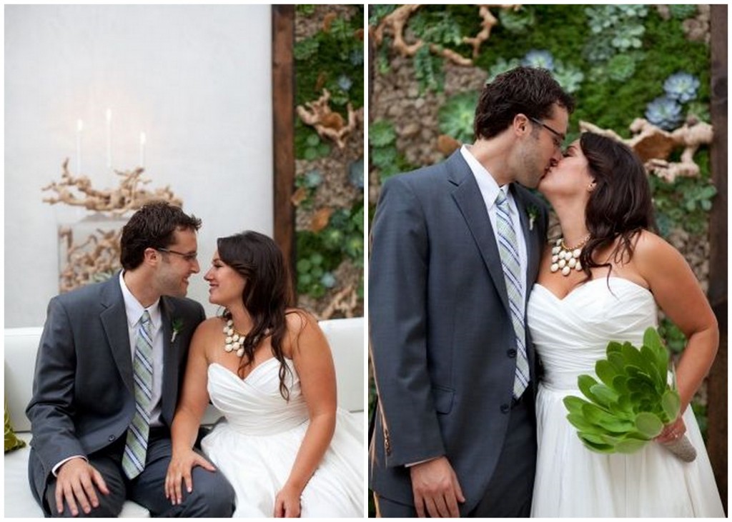 I am so so excited to share this wedding with you today, because it’s the wedding of my friends Krystal and Harris! In lieu of the traditional ceremony the couple decided to switch things up a bit… their guests stood surrounding them during the ceremony and their reception was cocktail style without a formal sit down dinner, followed by In-n-Out… delicious! There are so many amazing things about this wedding I don’t know where to begin – the floating chuppah made of driftwood with the glass succulent orbs, Krystal’s bouquet made of a single succulent (amaze!) and the green Jenny Yoo bridesmaid dress. Perfection. JL Designs did a BEAUTIFUL job designing the wedding,  Constance Curtis did an amazing job coordinating it all and Sarah Yates captured it perfectly! We were so excited to have submitted this Southern California Urban Coastal Chic Wedding and had it featured in the Spring/Summer 2012 issue of The Knot Southern California!