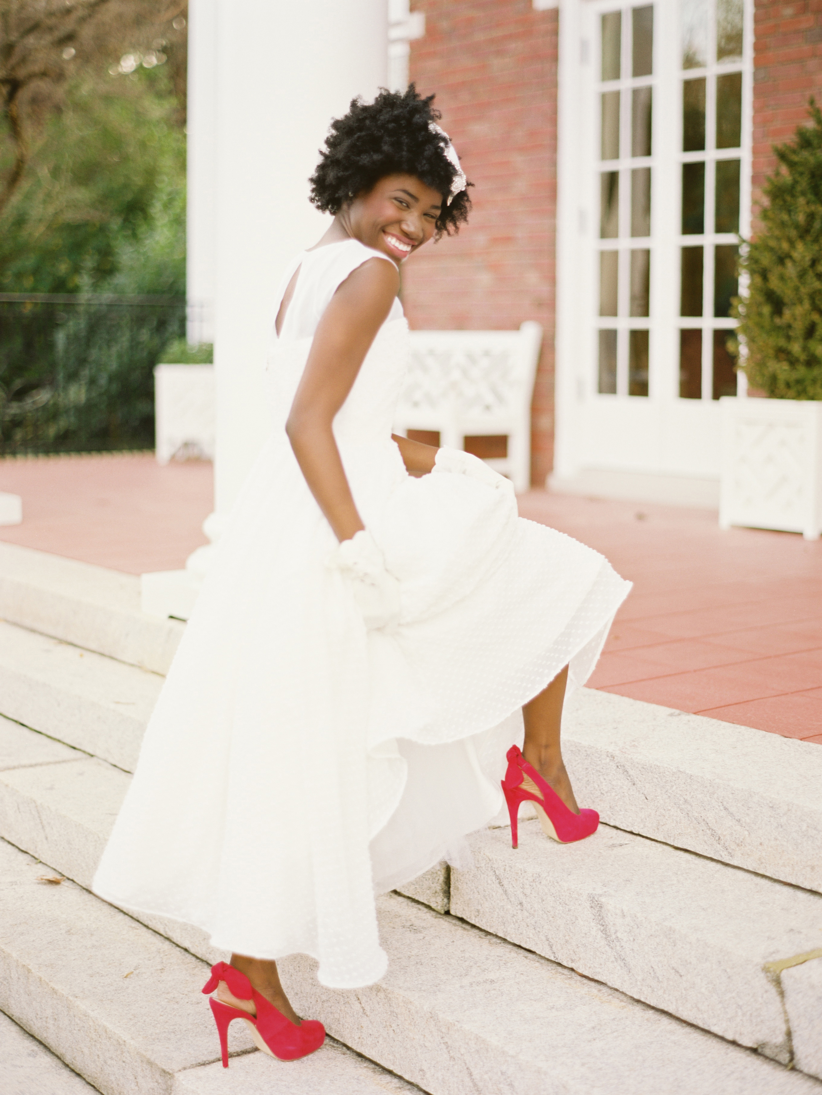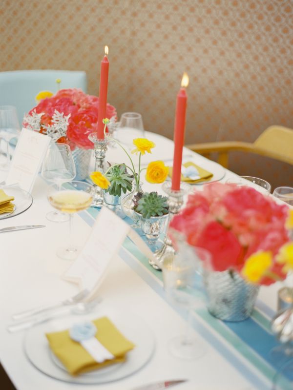 I’m dying over all of these amazing colors in this shoot! The bright pops of pink, orange and yellow spring wedding ideas are the perfect welcome to the season! You might recognize the beautiful images from the pages of Munaluchi Bride who featured the shoot in their Winter 2012 online magazine! All of the gorgeous florals were created by the crazy talented Janie from The Bride’s Cafe and they really seem to steal the show! Peonies, ranunculus, and tulips always feel like the epitome of springtime to me and mixed in with the dusty miller and succulents keep everything soft and feminine. The models look adorable in their slate gray Bella Bridesmaid dresses and I’m obsessing over the bride’s ridiculous Monique Lhuillier gown! Everything from the stationery to the desserts looks fresh and cheerful…the perfect inspiration for a Spring wedding!